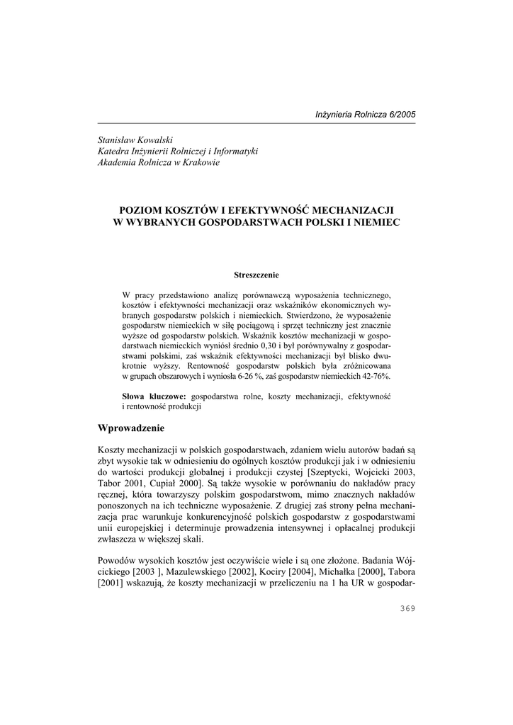 POZIOM KOSZTÓW I EFEKTYWNOŚĆ MECHANIZACJI W