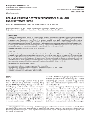 Medycyna Pracy 2013;64(4):593–608 © Instytut Medycyny Pracy im. prof. J. Nofera w Łodzi http://medpr.imp.lodz.pl http://dx.doi.org/10.13075/mp.5893.2013.0045 PRACA POGLĄDOWA Eliza Goszczyńska REGULACJE PRAWNE DOTYCZĄCE KONSUMPCJI ALKOHOLU I NARKOTYKÓW W PRACY LEGISLATION CONCERNING ALCOHOL AND DRUG INTAKE IN THE WORKPLACE Instytut Medycyny Pracy im. prof. J. Nofera / Nofer Institute of Occupational Medicine, Łódź, Poland Krajowe Centrum Promocji Zdrowia w Miejscu Pracy / National Centre for Workplace Health Promotion Streszczenie Wydaje się, że jedną z przyczyn niechęci do rozwiązywania w zakładach pracy problemu konsumpcji przez pracowników alkoholu i narkotyków są skomplikowane rozwiązania prawne, które dotyczą substancji psychoaktywnych w pracy. W związku z tym w artykule przybliżono polskie prawodawstwo o takiej tematyce na podstawie przeglądu ustaw, aktów wykonawczych do nich oraz bogatego orzecznictwa sądów. Informacje te mogą być przydatne dla pracodawców w budowaniu wewnętrznej polityki ograniczania konsumpcji substancji psychoaktywnych przez pracowników, a także dla podmiotów, które mogą stanowić wsparcie dla zakładów pracy w rozwiązywaniu problemów związanych z piciem alkoholu lub zażywaniem narkotyków przez pracowników (np. profesjonalistów służby medycyny pracy czy pracowników samorządów terytorialnych). Med. Pr. 2013;64(4):593–608 Słowa kluczowe: alkohol, narkotyki, przepisy prawa, miejsce pracy Abstract It is likely that the complex law concerning alcohol and drugs in the workplace is one of the reasons for unwillingness to resolve the problem of intake of such psychoactive substances by employees. Therefore, the author made an attempt to depict Polish legislation in this field based on the review of legal acts and regulations, as well as on their extensive judiciary interpretation. Such an information can be used by employers in developing their workplace policy of diminishing the intake of psychoactive substances by employees. This information can also be helpful for the bodies supporting workplaces in solving problems derived from alcohol and drugs consumption, such as occupational medicine specialists and local governments. Med Pr 2013;64(4):593–608 Key words: alcohol, drugs, legislation, workplace Autorka do korespondencji / Corresponding author: Eliza Goszczyńska, Krajowe Centrum Promocji Zdrowia w Miejscu Pracy, Instytut Medycyny Pracy im. prof. J. Nofera, ul. św. Teresy 8, 91-348 Łódź, e-mail: [email protected] Nadesłano: 28 czerwca 2013, zatwierdzono: 21 sierpnia 2013 WSTĘP Dane z badań Krajowego Centrum Promocji Zdrowia w Miejscu Pracy Instytutu Medycyny Pracy (KCPZwMP/IMP) w Łodzi pokazują, że średnie i duże zakłady pracy w Polsce rzadko wdrażają wewnętrzną politykę ograniczania konsumpcji substancji psychoaktywnych przez pracowników (tj. kompleksowe podejście do rozwiązywania tego problemu) (1–3). Wśród różnych ponadobligatoryjnych działań najrzadziej podejmowane są te, które mają na celu ograniczanie spożycia alkoholu i narkotyków (1,2,4,5). Przykładowo w badaniu zrealizowanym w 2010 r. na reprezentatyw- nej próbie 1002 firm liczących powyżej 50 pracowników tylko 9% pracodawców zadeklarowało pomoc osobom nadużywającym alkoholu, a żaden nie podjął interwencji na rzecz zmniejszania czy wyeliminowania zażywania narkotyków (5). Niestety zakłady pracy w Polsce mają niewystarczające wsparcie we wdrażaniu działań służących ograniczeniu konsumpcji alkoholu czy nielegalnych substancji psychoaktywnych przez pracowników – chociażby ze strony podmiotów, które ze względu na regulacje ustawowe powinny albo mogłyby nieść taką pomoc. Dotyczy to np. służby medycyny pracy (smp), która jest właściwa m.in. do inicjowania i realizowania pro- Artykuł przygotowany w ramach projektu pt. „Profilaktyczny program w zakresie przeciwdziałania uzależnieniu od alkoholu, tytoniu i innych środków psychoaktywnych” finansowanego przez Szwajcarsko-Polski Program Współpracy z Nowymi Krajami Członkowskimi Unii Europejskiej i koordynowanego przez Główny Inspektorat Sanitarny. Kierownik projektu w Instytucie Medycyny Pracy im. prof. J. Nofera (partner): dr E. Korzeniowska. 594 E. Goszczyńska mocji zdrowia pracujących oraz inicjowania działań pracodawców i udzielania im pomocy we wdrażaniu programów promocji zdrowia (6). Z badań ankietowych zrealizowanych wśród lekarzy i pielęgniarek smp wynika bowiem, że nadużywanie alkoholu to jedno z zachowań, którym poświęcają oni najmniej uwagi w kontaktach z podopiecznymi (7,8). Co więcej, raporty 20 największych w Polsce wojewódzkich ośrodków medycyny pracy dotyczące promocji zdrowia pracujących pokazują, że tylko pojedyncze ośrodki mają w swojej ofercie programy prewencji problemów związanych z konsumpcją alkoholu i narkotyków (9). Także samorządy gminne, do których zadań ustawowych należy profilaktyka problemów związanych z realizacją omawianych zachowań antyzdrowotnych (10– –12), rzadko oferują wsparcie w tym zakresie dla zakładów pracy. Przykładowo, analiza rocznych sprawozdań z ich działalności w ramach gminnych programów profilaktyki i rozwiązywania problemów alkoholowych pokazuje, że organizacja profilaktycznych programów pracowniczych w zakładach pracy jest rzadkością (w 2010 i 2011 r. dotyczyło to tylko ok. 1% polskich gmin) (13). Wydaje się, że zainteresowanie tą problematyką powinno być wyraźnie większe, jeśli weźmie się pod uwagę skalę realizacji zachowań antyzdrowotnych wśród osób w wieku produkcyjnym. Konsumpcja alkoholu w tej populacji jest powszechna (przykładowo do picia go w ciągu 12 miesięcy przed badaniem przyznaje się ok. 90% mężczyzn w wieku produkcyjnym) i wyraźnie częstsza w porównaniu z Polakami z najmłodszych i najstarszych grup wiekowych (14). Ponadto w populacji osób w wieku produkcyjnym znajdują się 