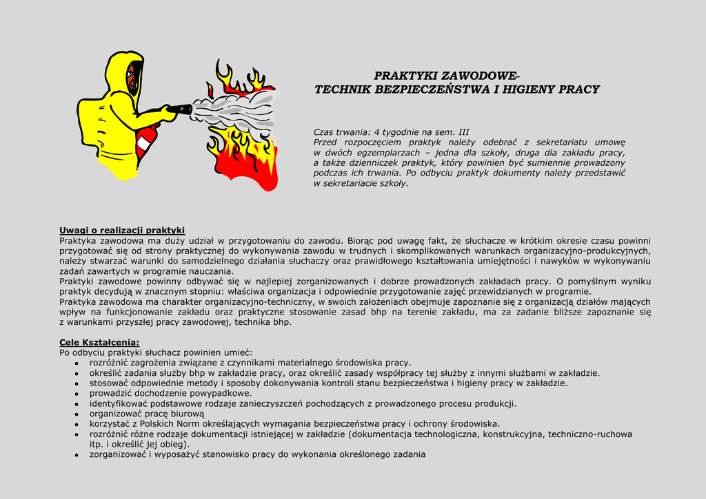 PRAKTYKI ZAWODOWETECHNIK BEZPIECZEŃSTWA I HIGIENY PRACY Czas trwania: 4 tygodnie na sem. III Przed rozpoczęciem praktyk należy odebrać z sekretariatu umowę w dwóch egzemplarzach – jedna dla szkoły, druga dla zakładu pracy, a także dzienniczek praktyk, który powinien być sumiennie prowadzony podczas ich trwania. Po odbyciu praktyk dokumenty należy przedstawić w sekretariacie szkoły. Uwagi o realizacji praktyki Praktyka zawodowa ma duży udział w przygotowaniu do zawodu. Biorąc pod uwagę fakt, że słuchacze w krótkim okresie czasu powinni przygotować się od strony praktycznej do wykonywania zawodu w trudnych i skomplikowanych warunkach organizacyjno-produkcyjnych, należy stwarzać warunki do samodzielnego działania słuchaczy oraz prawidłowego kształtowania umiejętności i nawyków w wykonywaniu zadań zawartych w programie nauczania. Praktyki zawodowe powinny odbywać się w najlepiej zorganizowanych i dobrze prowadzonych zakładach pracy. O pomyślnym wyniku praktyk decydują w znacznym stopniu: właściwa organizacja i odpowiednie przygotowanie zajęć przewidzianych w programie. Praktyka zawodowa ma charakter organizacyjno-techniczny, w swoich założeniach obejmuje zapoznanie się z organizacją działów mających wpływ na funkcjonowanie zakładu oraz praktyczne stosowanie zasad bhp na terenie zakładu, ma za zadanie bliższe zapoznanie się z warunkami przyszłej pracy zawodowej, technika bhp. Cele Kształcenia: Po odbyciu praktyki słuchacz powinien umieć: rozróżnić zagrożenia związane z czynnikami materialnego środowiska pracy. określić zadania służby bhp w zakładzie pracy, oraz określić zasady współpracy tej służby z innymi służbami w zakładzie. stosować odpowiednie metody i sposoby dokonywania kontroli stanu bezpieczeństwa i higieny pracy w zakładzie. prowadzić dochodzenie powypadkowe. identyfikować podstawowe rodzaje zanieczyszczeń pochodzących z prowadzonego procesu produkcji. organizować pracę biurową korzystać z Polskich Norm określających wymagania bezpieczeństwa pracy i ochrony środowiska. rozróżnić różne rodzaje dokumentacji istniejącej w zakładzie (dokumentacja technologiczna, konstrukcyjna, techniczno-ruchowa itp. i określić jej obieg). zorganizować i wyposażyć stanowisko pracy do wykonania określonego zadania MATERIAŁ NAUCZANIA Czynności organizacyjno-porządkowe Ogólne zapoznanie z organizacja zarządzania i strukturą produkcyjna zakładu. Zapoznanie z regulaminem praktyki. Przepisy bhp i ppoż w zakładzie. Zapoznanie z harmonogramem praktyki. Załatwienie czynności związanych z rozpoczęciem praktyki. Zapoznanie słuchacza z działami, w których odbywać będą praktykę. Planowanie i przygotowanie produkcji Zapoznanie się z obiegiem dokumentacji, przygotowanie produkcji, przyjmowanie zleceń do produkcji, wystawianie kart obiegowych na poszczególne partie wyrobów, opracowywanie technologicznych norm pracy Dział Głównego Technologa Zapoznanie z organizacją i zadaniami działu zaznajomienie się z czynnikami organizacyjno-technicznymi i kolejnością projektowania procesów technologicznych i opracowaną dokumentacją. Zapoznanie się z analizą ekonomiczną metod produkcji. Zaznajomienie się z organizacją biura technologicznego. Dział Głównego Mechanika Zapoznanie z organizacją i zadaniami działu. Zadania służby remontowej i jej organizacja. Zapoznanie z rodzajami napraw maszyn i urządzeń oraz planowaniem napraw – cykle remontowe. Paszportyzacja maszyn. Zasadnicze operacje występujące przy naprawach. Dział Kontroli Technicznej Zapoznanie się z pracą działu kontroli technicznej z zadaniami i organizacją kontroli technicznej. Zapoznanie z organizacją i wyposażeniem izby pomiarów. Gospodarka sprzętem pomiarowym w zakładzie. Dział BHP Zadanie komórki bhp. Zasady dokonywania kontroli bhp w zakładzie. Dochodzenie powypadkowe - dokumentacja powypadkowa. Ocena budynków i pomieszczeń pracy oraz maszyn i urządzeń pod względem bhp. System przeciwpożarowy w zakładzie. Organizacja i metody pracy służby bhp. Interpretacja przepisów prawnych dotyczących bezpieczeństwa i higieny pracy. Dział Ochrony Środowiska Zadania i uprawnienia działu ochrony środowiska. Interpretacja przepisów prawnych dotyczących ochrony środowiska, system kar za naruszenie wymagań ochrony środowiska. Dokumentacja w zakresie ochrony środowiska. Zakończenie praktyki Przedłożenie sprawozdania z praktyk. Załatwienie czynności związanych z zakończeniem praktyki. Zakończenie pracy w działach specjalizacyjnych. Omówienie i podsumowanie praktyki przez opiekuna.