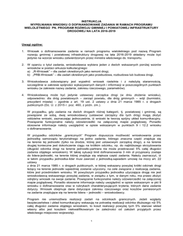 INSTRUKCJA WYPEŁNIANIA WNIOSKU O DOFINANSOWANIE ZADANIA W RAMACH PROGRAMU WIELOLETNIEGO PN. PROGRAM ROZWOJU GMINNEJ I POWIATOWEJ INFRASTRUKTURY DROGOWEJ NA LATA 2016-2019 Uwagi ogólne: 1. Wniosek o dofinansowanie zadania w ramach programu wieloletniego pod nazwą Program rozwoju gminnej i powiatowej infrastruktury drogowej na lata 2016-2019 składany może być jedynie na wzorze wniosku zatwierdzonym przez ministra właściwego ds. transportu. 2. W oparciu o tytuł zadania, wnioskodawca wybiera jeden z dwóch wskazanych poniżej wzorów wniosków w postaci arkusza kalkulacyjnego: a) „R-Wniosek” – dla zadań określonych jako remont drogi, b) „PRB-Wniosek” – dla zadań określonych jako przebudowa, rozbudowa lub budowa drogi. 3. Wnioskodawca zobowiązany jest wypełnić wniosek rzetelnie i z należytą starannością, szczególnie w zakresie spójności wykazywanych danych i informacji w poszczególnych punktach wniosku (w zakresie nazwy zadania, zakresu rzeczowego, parametrów). 4. Wnioskodawcą może być jedynie ustawowy zarządca drogi (w dniu złożenia wniosku), odpowiednio: dla dróg powiatowych – zarząd powiatu, dla dróg gminnych – wójt (burmistrz, prezydent miasta) – zgodnie z art. 19 ust. 2 ustawy z dnia 21 marca 1985 r. o drogach publicznych (Dz. U. z 2015 r. poz. 460, z późn. zm.). W przypadku, gdy zadania na dwóch drogach różnej kategorii, tj. powiatowej i gminnej, są powiązane ze sobą, dwaj wnioskodawcy (ustawowi zarządcy dla tych dróg) mogą złożyć oddzielne wnioski, zaznaczając jednocześnie, iż wnioski te tworzą spójny układ komunikacyjny. Powiązanie funkcjonalne należy odzwierciedlić na załączonej mapie poglądowej. Ponadto stosowne informacje należy uwzględnić w opisie wskazanym w punktach 9 i 12.2 wniosku o dofinansowanie. W przypadku odcinków „granicznych” Program dopuszcza możliwość wnioskowania przez jednostkę samorządu terytorialnego na jedno zadanie, którego znaczna część znajduje się na terenie tej jednostki (tylko na drodze, której jest ustawowym zarządcą drogi), a na terenie drugiej konieczne jest dokończenie ciągu na krótkim odcinku, np. do najbliższego skrzyżowania (długość odcinka drogi na terenie jednostki-partnera nie może przekraczać 5% całej długości zadania objętego wnioskiem). W takiej sytuacji limit dofinansowania 3 mln zł przypisany zostaje do lidera-jednostki, na terenie której znajduje się większa część zadania. Należy zaznaczyć, iż w takim przypadku jednostka-lider musi zawrzeć z jednostką-sąsiadem umowę na mocy art. 22 ustawy z dnia 21 marca 1985 r. o drogach publicznych, w której wskazany powyżej krótki odcinek drogi leżący na terenie jednostki sąsiedniej zostanie użyczony, na cele związane z realizacją zadania, które jest przedmiotem wniosku. W powyższym przypadku jednostka użyczająca drogę nie jest wnioskodawcą wskazanego powyżej zadania, w związku z tym, w danym roku, ma prawo złożyć odrębny wniosek na swoje zadanie. Powiązanie funkcjonalne należy odzwierciedlić na załączonej mapie poglądowej. Ponadto stosowne informacje należy uwzględnić w opisie wskazanym w pkt 9 wniosku o dofinansowanie oraz w rubrykach charakteryzujących kryteria, których dane zadanie dotyczy. Wniosek obejmuje dane dotyczące zakresu rzeczowego oraz kosztów poniesionych na zadanie znajdujące się na terenie lidera – jednostki – wnioskodawcy. Program nie uniemożliwia realizacji zadań na odcinkach granicznych. Jeżeli względy bezpieczeństwa i układ komunikacyjny wskazują na potrzebę realizacji odcinka dłuższego niż 5% całej długości zadania objętego wnioskiem, to koszt realizacji powyżej tych 5% stanowi wkład własny albo jest kosztem niekwalifikowanym (w zależności od założeń przyjętych przez właściwego miejscowo wojewodę). 1 5. Przedmiotem wniosku może być zadanie obejmujące odcinek/odcinki drogi/dróg będące drogą publiczną (powiatową lub gminną) w rozumieniu ustawy z 21 marca 1985 r. o drogach publicznych (wyjątek stanowi zadanie mające na celu osiągnięcie parametrów właściwych dla drogi publicznej i następnie zaliczenie jej do jednej z wymienionych kategorii). 6. W zakresie rzeczowym wniosek dotyczy budowy (rozbudowy), przebudowy lub remontu dróg gminnych lub dróg powiatowych. 7. Jako jedno zadanie mogą być zgłoszone maksymalnie trzy odcinki drogi/dróg. 8. Przez pojedynczy odcinek rozumie się jednorodny pod względem parametrów funkcjonalnych i technicznych fragment drogi publicznej jednego numeru, o którym mowa w art. 10 ustawy z dnia 21 marca 1985 r. o drogach publicznych. 9. Każdy odcinek zgłoszony do realizacji w ramach zadania może posiadać inną klasę, o której mowa w § 4 rozporządzenia Ministra Transportu i Gospodarki Morskiej z dnia 2 marca 1999 r. w sprawie warunków technicznych, jakim powinny odpowiadać drogi publiczne i ich usytuowanie (Dz. U. z 2016 r. poz. 124), właściwą dla danej kategorii drogi. 10. Zadanie powinno być scharakteryzowane pod względem robót budowlanych w sposób jednolity dla wszystkich odcinków dróg, tj. dopuszcza się zadanie polegające wyłącznie na remoncie, przebudowie, rozbudowie lub budowie drogi/dróg publicznych. 11. Ilekroć w Instrukcji mowa jest o „rozporządzeniu” należy przez to rozumieć rozporządzenie Ministra Transportu i Gospodarki Morskiej z dnia 2 marca 1999 r. w sprawie warunków technicznych, jakim powinny odpowiadać drogi publiczne i ich usytuowanie (Dz. U. z 2016 r. poz. 124). 12. Wnioskodawca wypełnia tylko białe pola. 13. Terminy składania wniosków do urzędu wojewódzkiego to 1-15 września dla dofinansowania udzielanego w latach 2017-2019. Do decyzji właściwego wojewody należy wskazanie w ogłoszeniu, czy o dacie złożenia decyduje data stempla pocztowego, czy też data wpływu wniosku do właściwego urzędu wojewódzkiego. 14. Wojewoda może wskazać w ogłoszeniu o naborze dodatkowe dokumenty i