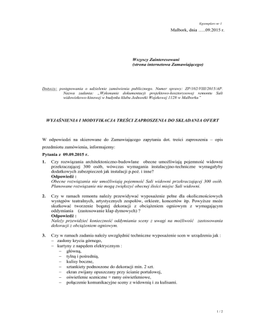 Egzemplarz nr 1 Malbork, dnia …..09.2015 r. Wszyscy Zainteresowani (strona internetowa Zamawiającego) Dotyczy: postępowania o udzielenie zamówienia publicznego. Numer sprawy: ZP/102/VIII/2015/AP. Nazwa zadania: „Wykonanie dokumentacji projektowo-kosztorysowej remontu Sali widowiskowo-kinowej w budynku klubu Jednostki Wojskowej 1128 w Malborku” WYJAŚNIENIA I MODYFIKACJA TREŚCI ZAPROSZENIA DO SKŁADANIA OFERT W odpowiedzi na skierowane do Zamawiającego zapytania dot. treści zaproszenia – opis przedmiotu zamówienia, informujemy: Pytania z 09.09.2015 r. 1. Czy rozwiązania architektoniczno-budowlane obecne umożliwiają pojemność widowni przekraczającej 300 osób, wówczas wymagania instalacyjno-techniczne wymagałyby dodatkowych zabezpieczeń jak instalacji p.poż. i inne? Odpowiedź : Obecne rozwiązania nie umożliwiają pojemność Sali widowni przekraczającej 300 osób. Planowane rozwiązanie nie mogą zwiększyć obecnej ilości miejsc Sali widowni. 2. Czy w ramach remontu należy przewidywać wyposażenie pełne dla okolicznościowych występów teatralnych, artystycznych zespołów, orkiestr, koncertów itp. Powyższe może skutkować tworzenie bogatej dekoracji z obciążeniem ogniowym z wymagającym oddymiania (zastosowanie klap dymowych) ? Odpowiedź : Należy przewidzieć konieczność oddymiania sceny z uwagi na możliwość zastosowania dekoracji z obciążeniem ogniowym. 3. Czy w ramach zadania należy uwzględnić techniczne wyposażenie scen w urządzenia jak : zasłony krycia górnego, kurtyny z napędem elektrycznym : główną, tylną i pośrednią, kulisy boczne, sztankiety podnoszone do dekoracji min. 2 szt. ekran zwijany opuszczany przy ścianie portalowej, oświetlenie sceniczne + ramy oświetleniowe, połączenie komunikacyjne sceny z widownią i za kulisami. 1/2 Odpowiedź : W ramach zadania należy uwzględnić techniczne wyposażenie sceny w urządzenia jak : zasłony krycia górnego kurtyny z napędem elektrycznym (główny, tylna i przednia, kulisy boczne, sztankiety podnoszone do dekoracji podnoszone do dekoracji) ekran zwijany opuszczany przy śocianie portalowej oświetlenie sceniczne + ramy oświetleniowe połączenie komunikacji Sali z widownia i za kulisami. 4. Zespół Sali widowiskowo-kinowej zakwalifikowany do kat. ZLI wymaga wydzielenia ścianami pożarowymi komunikacji i wszystkich instalacji czy Zamawiający dopuszcza wymaganą korektę takiej zabudowy do pomieszczeń przyległych i elewacji na zewnątrz? Odpowiedź : Zamawiający dopuszcza korektę do zabudowy do pomieszczeń podległych i elewacji na zewnątrz potrzebnych do wydzielenia Sali do kat. ZLI 5. Czy w projektowym zakresie remontu oprócz wymiany wentylacji należy widzieć klimatyzację w Sali widowiskowej i na scenie ? Odpowiedz : Należy przewidzieć rozbudowę wentylacji mechanicznej o rozbudowę układu klimatyzacji do wykonania poza procesem remontu Sali i sceny. 6. Proszę o informację jaką cześć imprez o charakterze występów (poza podstawową kinową) przewiduje się organizować po wykonaniu remontu obiektów . Odpowiedź : Poza funkcją kinową sala będzie wykorzystywana do celów widowiskowych ok. 2-3 razy w roku. Nowy termin składania ofert : 22.09.2015r. godz. 09.00, otwarcie 22.09.2015r godz. 09.30 Wszelkie ustalenia dotyczące miejsca składania i otwierania ofert pozostają beż zmian. Pozostałe zapisy zaproszenia do składania ofert pozostają bez zmian. DOWÓDCA ………..…………………………………. Wykonano w 1 egz.: Egz. nr 1 – ad acta (T:11/13) (B c) Wykonał: A .Paściak 14.09.2015r. (tel. 261 536 782) Dostęp do dokumentu : sekcja zamówień publicznych 2/2