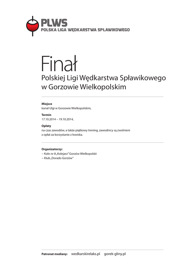 PLWS POLSKA LIGA WĘDKARSTWA SPŁAWIKOWEGO Finał Polskiej Ligi Wędkarstwa Spławikowego w Gorzowie Wielkopolskim Miejsce kanał Ulgi w Gorzowie Wielkopolskim, Termin 17.10.2014 – 19.10.2014, Opłaty na czas zawodów, a także piątkowy trening, zawodnicy są zwolnieni z opłat za korzystanie z łowiska. Organizatorzy: − Koło nr 8 „Kolejarz” Gorzów Wielkopolski − Klub „Dorado Gorzów” Patronat mediany: wedkarskirelaks.pl gorek-gliny.pl PLWS POLSKA LIGA WĘDKARSTWA SPŁAWIKOWEGO Harmonogram zawodów: 1) 17.10.2014 (piątek) – trening nieobowiązkowy 2) 18.10.2014 (sobota): 7:00 – 7:15 – zbiórka zawodników, potwierdzenie obecności oraz serwis kawowy 7:15 – 7:30 – otwarcie zawodów, omówienie regulaminu 7:30 – 7:45 – dojazd na sektory 7:45 – 8:00 – losowanie stanowisk 8:00 – 8:15 – dojazd na stanowiska 8:15 – I sygnał wejście na stanowiska 8:30 – kontrolne sprawdzanie zanęt i robaków 10:05 – 10:15 – II sygnał nęcenie ciężkie 10:15 – III sygnał – rozpoczęcie zawodów 14:10 – IV sygnał – 5 minut do końca zawodów 14:15 – V sygnał – koniec zawodów 15:30 – posiłek, ogłoszenie wyników I tury zawodów 3) 19.10.2014 (niedziela): 7:00 – 7:15 – zbiórka zawodników, potwierdzenie obecności oraz serwis kawowy 7:15 – 7:30 – otwarcie II tury zawodów, omówienie regulaminu 7:30 – 7:45 – dojazd na sektory 7:45 – 8:00 – losowanie stanowisk 8:00 – 8:15 – dojazd na stanowiska 8:15 – I sygnał wejście na stanowiska 8:30 – kontrolne sprawdzanie zanęt 10:05 – 10:15 – II sygnał nęcenie ciężkie 10:15 – III sygnał - rozpoczęcie zawodów 14:10 – IV sygnał - 5 minut do końca zawodów 14:15 – V sygnał – koniec zawodów 15:30 – posiłek, ogłoszenie wyników zawodów 16:00 – wręczenie nagród, losowanie upominków, oficjalne zakończenie zawodów PLWS POLSKA LIGA WĘDKARSTWA SPŁAWIKOWEGO Opis łowiska: Kanał Ulgi w Gorzowie Wielkopolskim, to łowisko o zróżnicowanym rybostanie. Rybą dominującą w łowisku jest płoć, krąp i leszcz. W postaci bonusów zdarzają się również liny i karasie. Aktualnie głębokość w okolicach 9-13 metra to 1,1 – 1,5 metra. Podczas zawodów dominującą metodą jest tyczka, ale batem również można zrobić dobry wynik. Rzadziej zawodnicy posługują się matchówką, ale tą metodą także można osiągnąć wysokie miejsce. Brzeg kanału jest łagodny, a dojazd do wszystkich stanowisk nie stanowi problemu. Zakup robaków W żywy towar nad wodą zaopatruje sklep DORADO – Waldemar Kryński Tel: (0-95) 723 02 31, kom.: 602 273 518 http://sklepwedkarskigorzow.pl/kontakt/ PLWS POLSKA LIGA WĘDKARSTWA SPŁAWIKOWEGO Wpłaty na konto organizatora: Startowe w kwocie 300zł za drużynę prosimy przekazywać na konto, najpóźniej do dnia: 14.10.2014r . Dane konta bankowego: Bank PKO BP Nr rachunku: 62 1020 1954 0000 7502 0069 3366 Jakub Kowańdy, 66 – 400 Gorzów Wielkopolski W tytule przelewu proszę podać nazwę drużyny oraz imiona i nazwiska zawodników. Jeśli drużyna chce zakupić obiad dla osób towarzyszących to proszę zrobić to w ramach tego samego przelewu – koszt dodatkowego posiłku (sobota i niedziela) 32zł. Informujemy, że w razie nieobecności drużyny opłata startowa nie będzie zwracana. Zasady wędkowania, warunki techniczne, komisja sędziowska: Zawody rozegrane zostaną w dwóch turach w klasyfikacji drużynowej, zgodnie z obowiązującymi Zasadami Organizacji Wędkarskiego Sportu Kwalifikowanego oraz Regulaminu Amatorskiego Połowu Ryb. Zawody odbędą się w trzech sektorach, które zostaną opublikowane na mapce tydzień przed finałem PLWS. Skład sędziowski: Sędzia główny – Marek Przybylski Sędzia sekretarz – Piotr Krawczyk Sędziowie sektorowi – Jakub Kowańdy, Andrzej Miszczyk i Krzysztof Rajtar Sędziowie wagowi – Łukasz Modlitowski, Łukasz Kościukiewicz i Michał Walentynowicz PLWS POLSKA LIGA WĘDKARSTWA SPŁAWIKOWEGO Nagrody i sponsorzy: Wśród wszystkich uczestników rozlosowane zostaną dwie uniwersalne, klasowe tyczki Mivardi 5000 ufundowane przez firmę Niwa – www.niwafishing.pl – oficjalnego dystrybutora Miavrdi w Polsce i producenta zanęt wędkarskich Zbigniewa Milewskiego. Za pierwsze miejsce w klasyfikacji drużynowej 3 „paki” Tyczki Tubertini Extreme Carp o łącznej wartości 9000zł ufundowane przez firmy Sport-Fishing.pl – oficjalnego dystrybutora Tubertini w Polsce oraz Górek-Gliny.pl Ponadto rozlosowane zostanie wiele cennych nagród ufundowanych przez pozostałych sponsorów finału PLWS: Niwafishing.pl Sport-fishing.pl Sklep.gorek-gliny.pl Matchpro.pl TRAPER Gut-Mix Kiwok.pl Wegetarianin.pl Krawiectwoewa.pl HAK Sensas Polska Sars.pl Shark.sklep.pl PLWS POLSKA LIGA WĘDKARSTWA SPŁAWIKOWEGO Mapa dojazdowa: