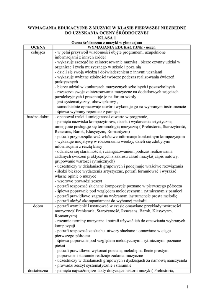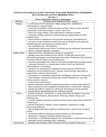 WYMAGANIA EDUKACYJNE Z MUZYKI W KLASIE PIERWSZEJ NIEZBĘDNE DO UZYSKANIA OCENY ŚRÓDROCZNEJ KLASA 1 OCENA celująca bardzo dobra dobra dostateczna Ocena śródroczna z muzyki w gimnazjum WYMAGANIA EDUKACYJNE - uczeń - w pełni przyswoił wiadomości objęte programem, uzupełnione informacjami z innych źródeł - wykazuje szczególne zainteresowanie muzyką , bierze czynny udział w organizacji życia muzycznego w szkole i poza nią - dzieli się swoją wiedzą i doświadczeniem z innymi uczniami - wykazuje wybitne zdolności twórcze podczas realizowania ćwiczeń praktycznych - bierze udział w konkursach muzycznych szkolnych i pozaszkolnych - rozszerza swoje zainteresowania muzyczne na dodatkowych zajęciach pozalekcyjnych i prezentuje je na forum szkoły - jest systematyczny, obowiązkowy , - samodzielnie opracowuje utwór i wykonuje go na wybranym instrumencie - śpiewa wybrany repertuar z pamięci - opanował treści i umiejętności zawarte w programie, - pamięta nazwiska kompozytorów, dzieła i wydarzenia artystyczne, umiejętnie posługuje się terminologią muzyczną ( Prehistoria, Starożytność, Renesans, Barok, Klasycyzm, Romantyzm) - potrafi przyporządkować właściwe informacje konkretnym kompozycjom - wykazuje inicjatywę w rozszerzaniu wiedzy, dzieli się zdobytymi informacjami z resztą klasy - odznacza się starannością i zaangażowaniem podczas realizowania zadanych ćwiczeń praktycznych z zakresu zasad muzyki( zapis nutowy, grupowanie wartości rytmicznych) - uczestniczy w działaniach grupowych i podejmuje właściwe rozwiązania - śledzi bieżące wydarzenia artystyczne, potrafi formułować i wyrażać własne opinie o muzyce - wzorowo prowadzi zeszyt - potrafi rozpoznać słuchane kompozycje poznane w pierwszego półrocza - śpiewa poprawnie pod względem melodycznym i rytmicznym z pamięci - potrafi prawidłowo zagrać na wybranym instrumencie prostą melodię - potrafi ułożyć akompaniament do wybranej melodii - potrafi wymienić i usytuować w czasie omawiane przykłady twórczości muzycznej( Prehistoria, Starożytność, Renesans, Barok, Klasycyzm, Romantyzm) - rozumie terminy muzyczne i potrafi używać ich do omawiania wybranych kompozycji - potrafi rozpoznać ze słuchu utwory słuchane i omawiane w ciągu pierwszego półrocza - śpiewa poprawnie pod względem melodycznym i rytmicznym poznane pieśni - potrafi prawidłowo wykonać poznaną melodię na flecie prostym - poprawnie i starannie realizuje zadania muzyczne - uczestniczy w działaniach grupowych i dyskusjach za namową nauczyciela - prowadzi zeszyt systematycznie i starannie - pamięta najważniejsze fakty dotyczące historii muzyki( Prehistoria, 1 Starożytność, Renesans, Barok, Klasycyzm, Romantyzm), własnego regionu, epoki i stylu - śpiewa poznane pieśni ale z błędami intonacyjnymi i rytmicznymi - poprawnie posługuje się terminami muzycznymi, rozumie treść poleceń i ćwiczeń praktycznych - realizuje podane ćwiczenia praktyczne - wykazuje zaangażowanie w działaniach muzycznych - potrafi wykonać proste melodie na flecie prostym - relacjonuje opinie innych na temat muzyki - prowadzi zeszyt dopuszczająca -jest bierny podczas dyskusji i pracy na lekcjach, ale wykazuje chęć współpracy - pamięta tylko niektóre terminy charakteryzujące epokę, zjawisko lub style w muzyce( Prehistoria, Starożytność, Renesans, Barok, Klasycyzm, Romantyzm), - próbuje śpiewać lub recytuje poznane pieśni - nie uczestniczy w zajęciach zespołowych - prowadzi zeszyt niestarannie niedostateczna Ocenę niedostateczna otrzymuje uczeń, który nie spełnia wymagań na ocenę dopuszczającą i mimo usilnych starań nauczyciela ma negatywny stosunek do przedmiotu. WYMAGANIA EDUKACYJNE NIEZBĘDNE DO UZYSKANIA OCENY ROCZNEJ Z MUZYKI W KLASIE PIERWSZEJ OCENA celująca bardzo dobra KLASA 1 Ocena roczna z muzyki w gimnazjum WYMAGANIA EDUKACYJNE - uczeń - w pełni przyswoił wiadomości objęte programem, uzupełnione informacjami z innych źródeł - wykazuje szczególne zainteresowanie muzyką - dzieli się swoją wiedzą i doświadczeniem z innymi uczniami - wykazuje wybitne zdolności twórcze podczas realizowania ćwiczeń praktycznych - bierze udział w konkursach muzycznych szkolnych i pozaszkolnych - rozszerza swoje zainteresowania muzyczne na dodatkowych zajęciach pozalekcyjnych i prezentuje je na forum szkoły - jest systematyczny, obowiązkowy , - samodzielnie opracowuje utwór i wykonuje go na wybranym instrumencie - śpiewa wybrany repertuar poprawnie pod względem melodycznym i rytmicznym z pamięci - pamięta nazwiska kompozytorów, dzieła i wydarzenia artystyczne, umiejętnie posługuje się terminologią muzyczną (Romantyzm w Polsce, Impresjonizm, Młoda Polska, Współczesność) - potrafi przyporządkować właściwe informacje konkretnym kompozycjom - wykazuje inicjatywę w rozszerzaniu wiedzy, dzieli się zdobytymi informacjami z resztą klasy - odznacza się starannością i zaangażowaniem podczas realizowania zadanych ćwiczeń praktycznych z zakresu zasad muzyki( zapis nutowy, grupowanie wartości rytmicznych, tonacje dur i moll,) - uczestniczy w działaniach grupowych i podejmuje właściwe rozwiązania 2 - śledzi bieżące wydarzenia artystyczne, potrafi formułować i wyrażać własne opinie o muzyce - wzorowo prowadzi zeszyt - potrafi rozpoznać słuchane kompozycje poznane w drugim półroczu - śpiewa poprawnie pieśni z pamięci - potrafi zagrać na flecie prostym i wybranym instrumencie melodię - potrafi ułożyć akompaniament do wybranej melodii dobra - potrafi wymienić i usytuować w czasie omawiane przykłady twórczości muzycznej(Romantyzm w Polsce, Impresjonizm, Młoda Polska, Współczesność) - rozumie terminy muzyczne i potrafi używać ich do omawiania wybranych kompozycji - potrafi rozpoznać ze słuchu utwory słuchane i omawiane w ciągu drugiego półrocza - śpiewa poprawnie pod względem rytmicznym i melodycznym poznane pieśni, w