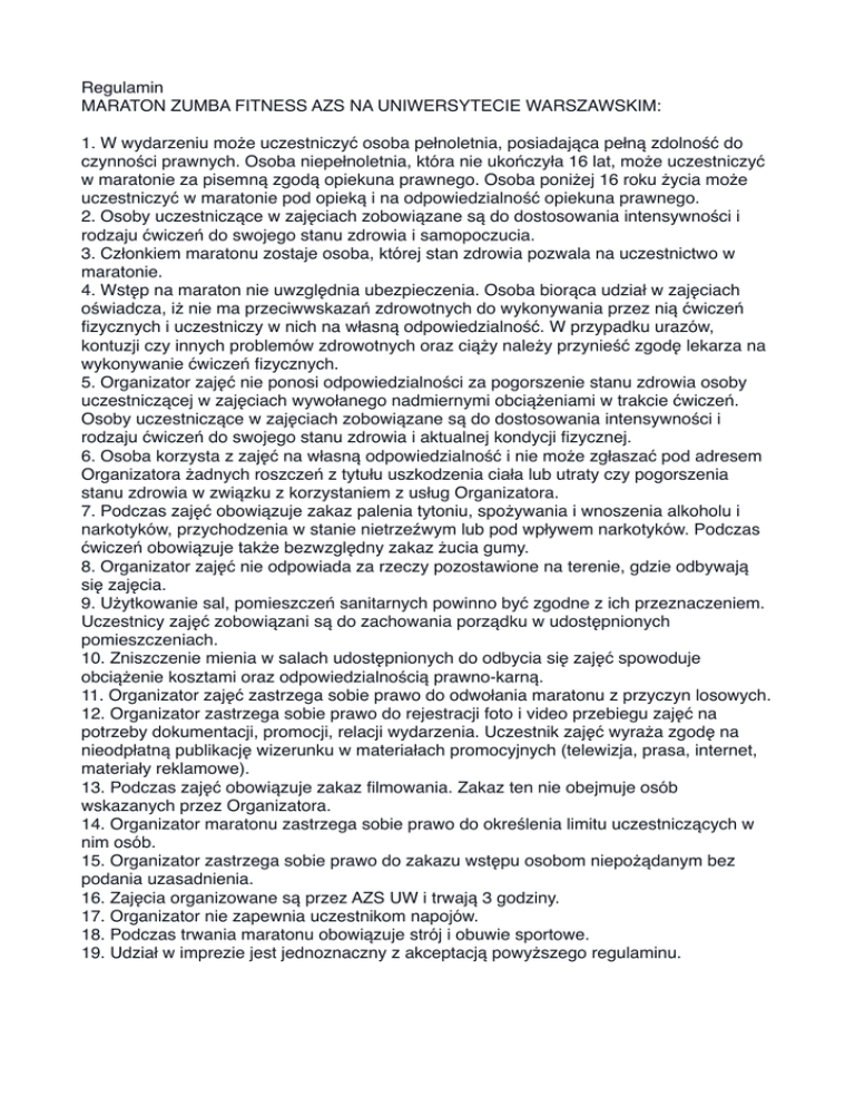 Regulamin MARATON ZUMBA FITNESS AZS NA UNIWERSYTECIE WARSZAWSKIM: 1. W wydarzeniu może uczestniczyć osoba pełnoletnia, posiadająca pełną zdolność do czynności prawnych. Osoba niepełnoletnia, która nie ukończyła 16 lat, może uczestniczyć w maratonie za pisemną zgodą opiekuna prawnego. Osoba poniżej 16 roku życia może uczestniczyć w maratonie pod opieką i na odpowiedzialność opiekuna prawnego. 2. Osoby uczestniczące w zajęciach zobowiązane są do dostosowania intensywności i rodzaju ćwiczeń do swojego stanu zdrowia i samopoczucia. 3. Członkiem maratonu zostaje osoba, której stan zdrowia pozwala na uczestnictwo w maratonie. 4. Wstęp na maraton nie uwzględnia ubezpieczenia. Osoba biorąca udział w zajęciach oświadcza, iż nie ma przeciwwskazań zdrowotnych do wykonywania przez nią ćwiczeń fizycznych i uczestniczy w nich na własną odpowiedzialność. W przypadku urazów, kontuzji czy innych problemów zdrowotnych oraz ciąży należy przynieść zgodę lekarza na wykonywanie ćwiczeń fizycznych. 5. Organizator zajęć nie ponosi odpowiedzialności za pogorszenie stanu zdrowia osoby uczestniczącej w zajęciach wywołanego nadmiernymi obciążeniami w trakcie ćwiczeń. Osoby uczestniczące w zajęciach zobowiązane są do dostosowania intensywności i rodzaju ćwiczeń do swojego stanu zdrowia i aktualnej kondycji fizycznej. 6. Osoba korzysta z zajęć na własną odpowiedzialność i nie może zgłaszać pod adresem Organizatora żadnych roszczeń z tytułu uszkodzenia ciała lub utraty czy pogorszenia stanu zdrowia w związku z korzystaniem z usług Organizatora. 7. Podczas zajęć obowiązuje zakaz palenia tytoniu, spożywania i wnoszenia alkoholu i narkotyków, przychodzenia w stanie nietrzeźwym lub pod wpływem narkotyków. Podczas ćwiczeń obowiązuje także bezwzględny zakaz żucia gumy. 8. Organizator zajęć nie odpowiada za rzeczy pozostawione na terenie, gdzie odbywają się zajęcia. 9. Użytkowanie sal, pomieszczeń sanitarnych powinno być zgodne z ich przeznaczeniem. Uczestnicy zajęć zobowiązani są do zachowania porządku w udostępnionych pomieszczeniach. 10. Zniszczenie mienia w salach udostępnionych do odbycia się zajęć spowoduje obciążenie kosztami oraz odpowiedzialnością prawno-karną. 11. Organizator zajęć zastrzega sobie prawo do odwołania maratonu z przyczyn losowych. 12. Organizator zastrzega sobie prawo do rejestracji foto i video przebiegu zajęć na potrzeby dokumentacji, promocji, relacji wydarzenia. Uczestnik zajęć wyraża zgodę na nieodpłatną publikację wizerunku w materiałach promocyjnych (telewizja, prasa, internet, materiały reklamowe). 13. Podczas zajęć obowiązuje zakaz filmowania. Zakaz ten nie obejmuje osób wskazanych przez Organizatora. 14. Organizator maratonu zastrzega sobie prawo do określenia limitu uczestniczących w nim osób. 15. Organizator zastrzega sobie prawo do zakazu wstępu osobom niepożądanym bez podania uzasadnienia. 16. Zajęcia organizowane są przez AZS UW i trwają 3 godziny. 17. Organizator nie zapewnia uczestnikom napojów. 18. Podczas trwania maratonu obowiązuje strój i obuwie sportowe. 19. Udział w imprezie jest jednoznaczny z akceptacją powyższego regulaminu.