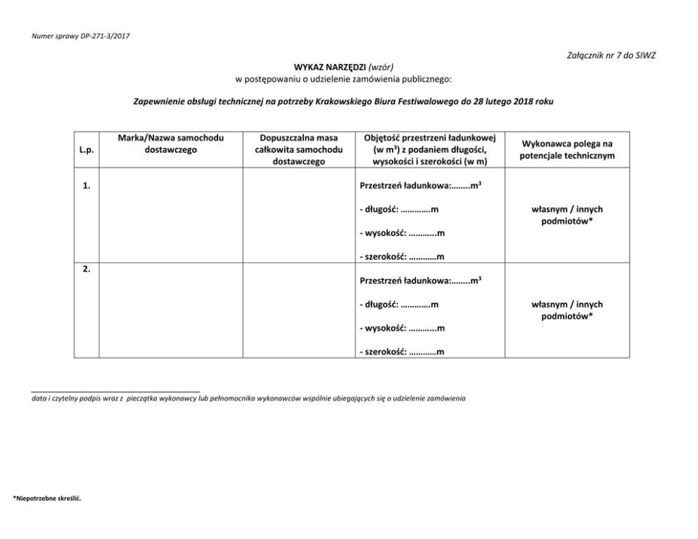 Numer sprawy DP-271-3/2017 Załącznik nr 7 do SIWZ WYKAZ NARZĘDZI (wzór) w postępowaniu o udzielenie zamówienia publicznego: Zapewnienie obsługi technicznej na potrzeby Krakowskiego Biura Festiwalowego do 28 lutego 2018 roku L.p. Marka/Nazwa samochodu dostawczego 1. Dopuszczalna masa całkowita samochodu dostawczego Objętość przestrzeni ładunkowej (w m3) z podaniem długości, wysokości i szerokości (w m) Wykonawca polega na potencjale technicznym Przestrzeń ładunkowa:……..m3 - długość: ………….m własnym / innych podmiotów* - wysokość: ………...m - szerokość: …………m 2. Przestrzeń ładunkowa:……..m3 - długość: ………….m - wysokość: ………...m - szerokość: …………m ___________________________________ data i czytelny podpis wraz z pieczątka wykonawcy lub pełnomocnika wykonawców wspólnie ubiegających się o udzielenie zamówienia *Niepotrzebne skreślić. własnym / innych podmiotów*