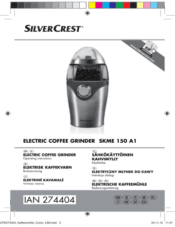 ELECTRIC COFFEE GRINDER SKME 150 A1 ELECTRIC COFFEE GRINDER Operating instructions SÄHKÖKÄYTTÖINEN KAHVIMYLLY Käyttöohje ELEKTRISK KAFFEKVARN Bruksanvisning ELEKTRYCZNY MŁYNEK DO KAWY Instrukcja obsługi ELEKTRINĖ KAVAMALĖ Vartotojo vadovas ELEKTRISCHE KAFFEEMÜHLE Bedienungsanleitung IAN 274404 CPE274404_Kaffeemühle_Cover_LB3.indd 2 04.11.15 11:47 &3(B$XVNODSSIP6HLWH0RQWDJ'H]HPEHU English ................................................... 2 Suomi .................................................. 20 Svenska ............................................... 36 Polski................................................... 52 Lietuviškai............................................ 72 ID: SKME 150 A1_16_V1.4 Deutsch ................................................ 88 &3(B$XVNODSSIP6HLWH0RQWDJ'H]HPEHU Overview / Yleiskatsaus / Översikt / Przegld / Apžvalga / Übersicht 1 8 7 2 3 6 4 5 A B 9 8 7 BB&3(B.DIIHHPKOHB%ERRN6HLWH'LHQVWDJ'H]HPEHU Contents 1. 2. 3. 4. 5. Overview ......................................................2 Intended purpose ..........................................4 Safety instructions .........................................5 Items supplied ..............................................9 Operation .....................................................9 5.1 Assembly.................................................... 10 5.2 Tips on the degree of grinding and quality ..... 10 5.3 Operating the device ................................... 11 6. Cleaning .....................................................12 7. Storage .......................................................13 8. Troubleshooting ..........................................14 9. Disposal ......................................................15 10. Technical specifications ................................15 11. Warranty of the HOYER HandelGmbH ........16 1. Overview 1 2 3 4 5 6 7 8 9 2 Lid Grinding space Blades Connector cable with mains plug Motor unit Switch Marking for the locking ( ) and unlocking mechanism ( ) Attachment markings Cable spool (at the bottom) GB BB&3(B.DIIHHPKOHB%ERRN6HLWH'LHQVWDJ'H]HPEHU Thank you for your trust! Congratulations on the purchase of your new coffee grinder. For a safe handling of the product and in order to get to know the entire scope of features: • Thoroughly read these operating instructions prior to initial use. • Above all, observe the safety instructions! • The device should only be used as described in these instructions. • Keep these operating instructions for information purposes. • If you pass the device on to someone else, please include these operating instructions. The operating instructions are a part of the product. We hope that you enjoy using your new coffee grinder! Symbol on your device The food-safe material of devices with this symbol will not change the taste or smell of food. GB 3 BB&3(B.DIIHHPKOHB%ERRN6HLWH'LHQVWDJ'H]HPEHU 2. Intended purpose The coffee grinder is exclusively suited for grinding coffee and espresso beans. The device is designed for private, domestic use. The device must only be used indoors. This device must not be used for commercial purposes. Foreseeable misuse We recommend the following maximum operating time: Coffee beans: 3 x 30 seconds with a 1-minute break each in between; afterwards, 60 minutes break to cool the device. Espresso beans: 2 x 45 seconds with a 1-minute break each in between; afterwards, 60 minutes break to cool the device. The device could be damaged by an extended, continuous operating time. 4 GB BB&3(B.DIIHHPKOHB%ERRN6HLWH'LHQVWDJ'H]HPEHU 3. Safety instructions Warnings If necessary, the following warnings will be used in these operating instructions: DANGER! High risk: failure to observe this warning may result in injury to life and limb. WARNING! Moderate risk: failure to observe this warning may result in injury or serious material damage. CAUTION: low risk: failure to observe this warning may result in minor injury or material damage. NOTE: circumstances and specifics that must be observed when handling the device. Instructions for safe operation ~ This device must not be used by children. ~ Children must not play with the device. ~ The device and the power cable must be kept away from children. ~ This device can be used by people with restricted physical, sensory or intellectual abilities or people without adequate experience and/or understanding if they are supervised or instructed on how to use this device safely and if they are aware of the resulting risks. GB 5 BB&3(B.DIIHHPKOHB%ERRN6HLWH'LHQVWDJ'H]HPEHU ~ Disconnect the mains plug from the wall socket … … when it is not supervised, … before you assemble or disassemble the device, and … before you clean the device. ~ Clean all parts and surfaces that will come into contact with food before using the device for the first time (see “Cleaning” on page 12). ~ If the mains power cable of this device should become damaged, it must be replaced by the manufacturer, the manufacturer's customer service department or a similarly qualified specialist, in order to avoid any hazards. DANGER for children ~ Children must not play with packing material. Do not allow children to play with plastic bags. There is a risk of suffocation. ~ Keep the device out of the reach of children. DANGER to and from pets and livestock ~ Electrical devices can represent a hazard to pets and livestock. In addition, animals can also cause damage to the device. For this reason you should keep animals away from electrical devices at all times. 6 GB BB&3(B.DIIHHPKOHB%ERRN6HLWH'LHQVWDJ'H]HPEHU ~ ~ ~ ~ ~ ~ ~ ~ ~ ~ ~ ~ DANGER! Risk of electric shock due to moisture The device must never be operated in the vicinity of a bathtub, a shower, a filled hand basin or similar. The motor unit, the power cable and the mains plug must not be immersed in water or other liquids. Protect the motor unit from dampness and dripping and splashing water. Should liquids enter the motor unit