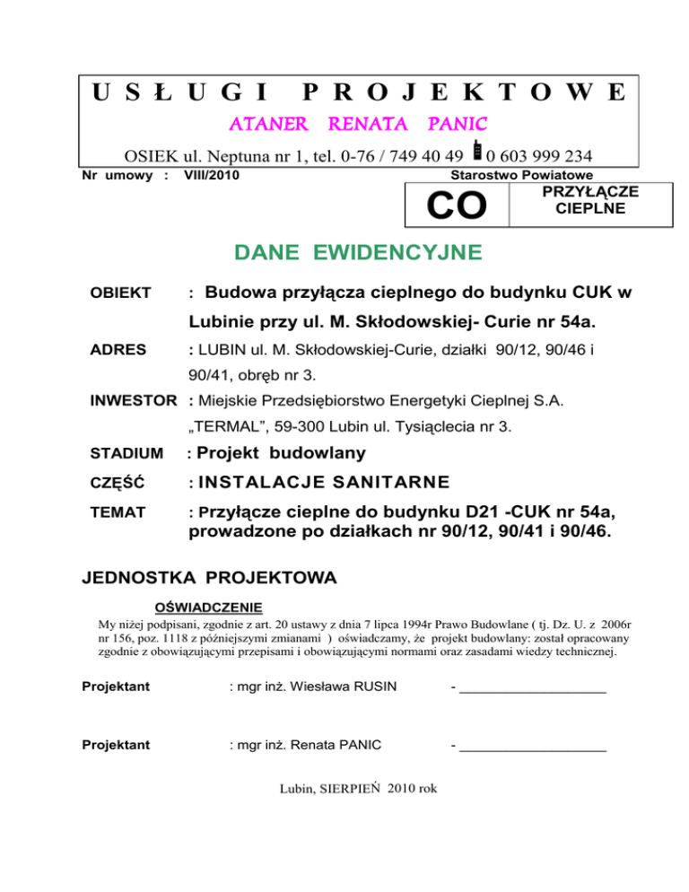 U S Ł U G I P R O J E K T O W E ATANER RENATA PANIC OSIEK ul. Neptuna nr 1, tel. 0-76 / 749 40 49 Nr umowy : VIII/2010 0 603 999 234 Starostwo Powiatowe CO PRZYŁĄCZE CIEPLNE DANE EWIDENCYJNE : Budowa przyłącza cieplnego do budynku CUK w OBIEKT Lubinie przy ul. M. Skłodowskiej- Curie nr 54a. ADRES : LUBIN ul. M. Skłodowskiej-Curie, działki 90/12, 90/46 i 90/41, obręb nr 3. INWESTOR : Miejskie Przedsiębiorstwo Energetyki Cieplnej S.A. „TERMAL”, 59-300 Lubin ul. Tysiąclecia nr 3. STADIUM : Projekt budowlany CZĘŚĆ : INSTALACJE SANITARNE TEMAT : Przyłącze cieplne do budynku D21 -CUK nr 54a, prowadzone po działkach nr 90/12, 90/41 i 90/46. JEDNOSTKA PROJEKTOWA OŚWIADCZENIE My niżej podpisani, zgodnie z art. 20 ustawy z dnia 7 lipca 1994r Prawo Budowlane ( tj. Dz. U. z 2006r nr 156, poz. 1118 z późniejszymi zmianami ) oświadczamy, że projekt budowlany: został opracowany zgodnie z obowiązującymi przepisami i obowiązującymi normami oraz zasadami wiedzy technicznej. Projektant : mgr inż. Wiesława RUSIN - ___________________ Projektant : mgr inż. Renata PANIC - ___________________ Lubin, SIERPIEŃ 2010 rok ZAWARTOŚĆ OPRACOWANIA I. OPIS TECHNICZNY 1. Podstawa opracowania 2. Cel i zakres opracowania 3. Stan istniejący 4. Zasadnicze rozwiązanie 5. Kolizje z istniejącym uzbrojeniem II. OBLICZENIA KOMPENSACJI WYDŁUŻEŃ CIEPŁOCIĄGÓW III. LISTA CZĘŚCI IV. RYSUNKI 1.Sieć ciepłownicza –plan sytuacyjny - skala 1 :500. 2. Przyłącze ciepłownicze 80/160 – schemat montażowy – skala 1:100. 3. Przyłącze ciepłownicze 80/160 – profil geodezyjny – skala 1:100. 4. Sieć cieplna dn 80 w kanale przełazowym – skala 1:100. 5. Przyłącze ciepłownicze dn 80/160 – przekrój przez wykop – skala 1:25 V. DOKUMENTY 1. Wypis z planu zagospodarowania przestrzennego miasta Lubina nr 38 2. Wypis z rejestru gruntów 3. Zgoda na zajęcie działek nr 90/46, 90/41 i 90/12 – KGHM Polska Miedź S.A. Pismo z dnia 9-09-2010r nr PA/ 2052/ 257/ 10 4. Uzgodnienie z wojewódzkim Konserwatorem Zabytków ZN-ML-415-438/10 l. dz. 4509/2010 z 14-09-2010r 5. Techniczne warunki przyłączenia do sieci cieplnej MPEC/ PE/ 604/2010 z dnia 30-08-2010r 6. Uzgodnienie projektu budowlanego MPEC/PE/1403/913/10 z dnia 24-09-2010r 7. Uzgodnienie dokumentacji w ZUD nr 688/2010 z 10-09-2010r. 2 I. Opis techniczny projektowanego przyłącza ciepłowniczego do budynku Centrum Usług Księgowych KGHM Polska Miedź S.A. przy ul. Skłodowskiej 54a D-21 w Lubinie 1 Podstawa opracowania Zlecenie inwestora Mapa do celów projektowych 1:500 Wizja lokalna w terenie Uzgodnienia z Inwestorem Warunki Techniczne MPEC TERMAL SA Warunki wykonania robót montażowych sieci ciepłowniczych w systemie ZPU Międzyrzecz Wytyczne do projektowania podziemnych wodnych sieci ciepłowniczych systemy ZPU Międzyrzecz Katalog ZPU Międzyrzecz Obowiązujące normy i przepisy 2 Cel i zakres opracowania Obejmuje budowę przyłącza ciepłowniczego 2 * Dn 80/160 preizolowanego w systemie ZPU Międzyrzecz. Nowoprojektowane przyłącze doprowadzać będzie czynnik grzewczy z grupowego węzła ciepłowniczego zlokalizowanego w budynku D-17 przy ulicy Skłodowskiej 70, o parametrach 90/70oC i 6,0 bar na potrzeby centralnego ogrzewania dla budynku Centrum Usług Księgowych KGHM Polska miedź S.A. przy ul. Skłodowskiej 54a D-21 w Lubinie. W zakresie opracowania jest także wymiana sieci cieplnej dn. 65 na sieć cieplną dn. 80 na odcinku od wpięcia w sieć cieplną dn. 125 w budynku CBJ do wpięcia nowoprojektowanego przyłącza preizolowanego dn 80/160 w kanale przełazowym. 2.1. Zajęcie terenu Inwestycja jest prowadzona wyłącznie po działkach należących do KGHM Polska Miedź S.A. są to działki nr 90/12, 90/41 i 90/46, obręb nr 3 w Lubinie przy ulicy M. SkłodowskieCurie. W terminie 7 dni przed przystąpieniem do robót ziemnych i rozbiórkowych nawierzchni należy uzgodnić na roboczo harmonogram prac z właścicielem terenu. Działki znajdują się na terenie, który podlega wpływom eksploatacji górniczej i znajdują się na terenie obszaru górniczego „Lubin I” - I kategoria szkód górniczych. Obszar objęty zadaniem znajduje się w zasięgu wpływów dynamicznych II strefy sejsmicznej LGOM w oparciu o skalę GSI-2004, gdzie prognozowane wielkości drgań podłoża gruntowego wynoszą: a)maksymalne przyspieszenie drgań poziomych w paśmie częstotliwości do 10 Hz PGA HA = 500 mm/s², b)maksymalna amplituda prędkości drgań poziomych PGVH max = 10-20 mm/s², c)wartość przyspieszenia do projektowania określa się na ap = 200 mm/s². Działka jest objęta ochroną konserwatorską. Plan określa się zasady ochrony dziedzictwa kulturowego i zabytków oraz dóbr kultury współczesnej, poprzez wymóg uzgadniania zamierzeń i działań inwestycyjnych na obszarze strefy z odpowiednimi służbami ochrony 3 zabytków. Projekt został uzgodniony bez uwag i na planowane prace nie jest wymagane pozwolenie Wojewódzkiego Konserwatora Zabytków. Stosować materiały posiadające atesty i dopuszczenia do stosowania na terenie szkód górniczych. 3. Opis stanu istniejącego Budynek Centrum Usług Księgowych zasilany jest na potrzeby wentylacji poprzez przyłącze niskoparametrowe dn. 65 prowadzone w kanale przełazowym. Dodatkowo ogrzewanie realizowane jest poprzez nawiew ogrzanego powietrza z centrali klimatyzacyjnej wyposażonej w nagrzewnice elektryczne. Powyższe rozwiązania nie zapewniają właściwego komfortu cieplnego w budynku z uwagi na nierównomierny rozkład temperatury w pomieszczeniach. 4. Zasadnicze rozwiązanie 4.1 Przyłącze preizolowane Do wykonania przyłącza należy zastosować rury i kształtki preizolowane z rurami przewodowymi ze szwem ze stali ST 37.0 z izolacją Standard firmy ZPU Międzyrzecz. Włączenie nowobudowanego przyłącza ciepłowniczego należy wykonać poprzez wspawanie trójników z rur czarnych Dn. 80/80 do sieci cieplnej wykonanej metodą tradycyjną w kanale przeł