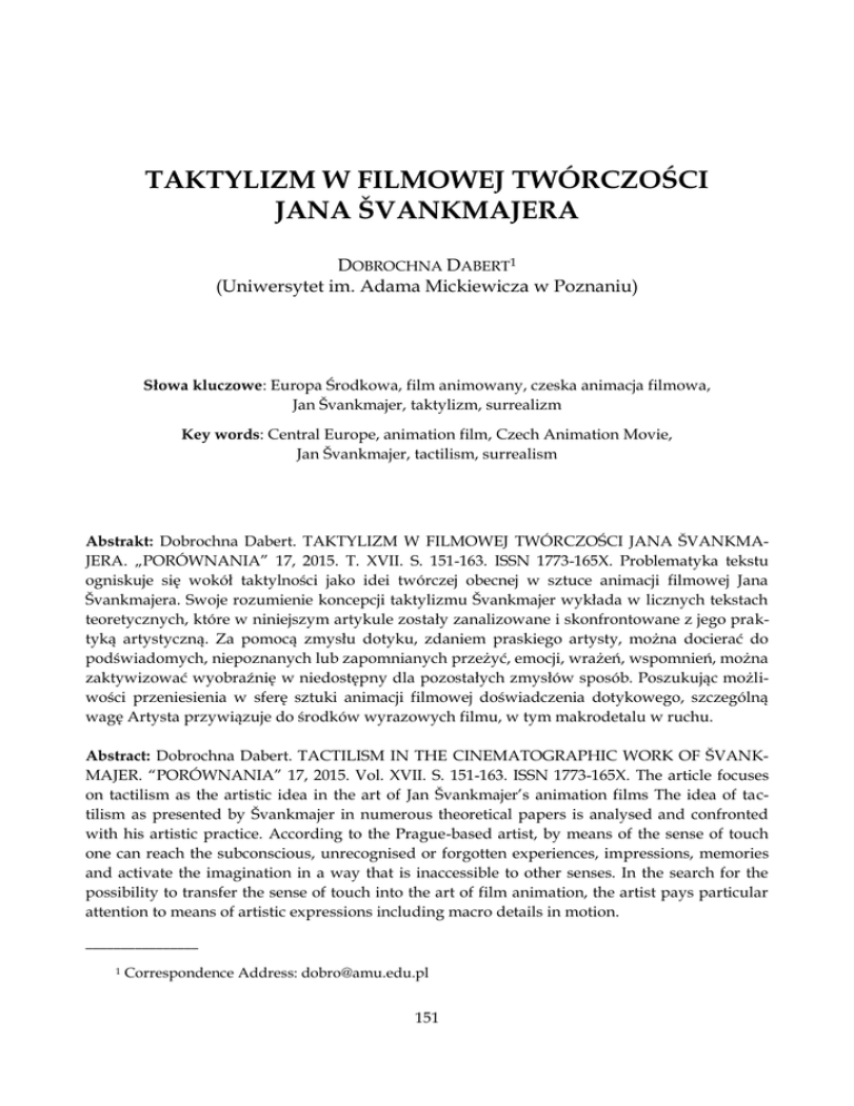 Dobrochna Dabert, Taktylizm w filmowej twórczości Jana Švankmajera TAKTYLIZM W FILMOWEJ TWÓRCZOŚCI JANA ŠVANKMAJERA DOBROCHNA DABERT1 (Uniwersytet im. Adama Mickiewicza w Poznaniu) Słowa kluczowe: Europa Środkowa, film animowany, czeska animacja filmowa, Jan Švankmajer, taktylizm, surrealizm Key words: Central Europe, animation film, Czech Animation Movie, Jan Švankmajer, tactilism, surrealism Abstrakt: Dobrochna Dabert. TAKTYLIZM W FILMOWEJ TWÓRCZOŚCI JANA ŠVANKMAJERA. „PORÓWNANIA” 17, 2015. T. XVII. S. 151-163. ISSN 1773-165X. Problematyka tekstu ogniskuje się wokół taktylności jako idei twórczej obecnej w sztuce animacji filmowej Jana Švankmajera. Swoje rozumienie koncepcji taktylizmu Švankmajer wykłada w licznych tekstach teoretycznych, które w niniejszym artykule zostały zanalizowane i skonfrontowane z jego praktyką artystyczną. Za pomocą zmysłu dotyku, zdaniem praskiego artysty, można docierać do podświadomych, niepoznanych lub zapomnianych przeżyć, emocji, wrażeń, wspomnień, można zaktywizować wyobraźnię w niedostępny dla pozostałych zmysłów sposób. Poszukując możliwości przeniesienia w sferę sztuki animacji filmowej doświadczenia dotykowego, szczególną wagę Artysta przywiązuje do środków wyrazowych filmu, w tym makrodetalu w ruchu. Abstract: Dobrochna Dabert. TACTILISM IN THE CINEMATOGRAPHIC WORK OF ŠVANKMAJER. “PORÓWNANIA” 17, 2015. Vol. XVII. S. 151-163. ISSN 1773-165X. The article focuses on tactilism as the artistic idea in the art of Jan Švankmajer’s animation films The idea of tactilism as presented by Švankmajer in numerous theoretical papers is analysed and confronted with his artistic practice. According to the Prague-based artist, by means of the sense of touch one can reach the subconscious, unrecognised or forgotten experiences, impressions, memories and activate the imagination in a way that is inaccessible to other senses. In the search for the possibility to transfer the sense of touch into the art of film animation, the artist pays particular attention to means of artistic expressions including macro details in motion. ________________ 1 Correspondence Address: [email protected] 151 PORÓWNANIA 17, 2015 Zdaniem Petera Hymesa, brytyjskiego historyka kina, znawcy Czechosłowackiej Nowej Fali, znaczące miejsce filmu animowanego w Europie Środkowej wynika ze specyficznych uwarunkowań politycznych w okresie powojennym, kiedy to: Wschodnioeuropejskie przywiązanie do animacji było w dużej mierze efektem ubocznym nacjonalizacji i polityki kulturalnej – chodzi o stałe zatrudnienie i niskie płace, połączone z oddaniem tradycji ludowej i realizacją filmów dla dzieci. Lecz poza tym animacja była również ostoją sprzeciwu wobec panującej władzy. Podczas gdy w latach pięćdziesiątych stalinowska ortodoksja sprawowała pieczę nad filmami pełnometrażowymi, animacja chwilami cieszyła się niespotykaną wolnością. W tym okresie w Czechosłowacji reżyserzy tacy jak Jiří Trnka i Karel Zeman nakręcili swoje najlepsze filmy, które stanowiły liczącą się alternatywę dla disnejowskiego modelu. Wizualny eksperyment przetrwał w dopuszczalnych ramach, podczas gdy dzieła awangardowe i surrealistyczne były zakazane (Hymes 264-265). Opinię P. Hymesa podziela także Paweł Sitkiewicz (Sitkiewicz 2015)2. Podobną prawidłowość odnotować możemy w polskiej kinematografii, w ramach której od połowy lat pięćdziesiątych rozwija się różnorodne formalnie i treściowo kino animacji za sprawą takich indywidualności twórczych jak: Jan Lenica, Walerian Borowczyk, Witold Giersz, Daniel Szczechura. W latach pięćdziesiątych i sześćdziesiątych tworzyli oni dzieła autorskie nastawione na poszukiwanie nowych technik i rozwiązań formalnych, służących przekazywaniu nierzadko poważnych treści społecznych, egzystencjalno- filozoficznych3. Jan Švankmajer, debiutujący w czechosłowackim kinie animowanym w połowie lat sześćdziesiątych, jeden z najoryginalniejszych surrealistycznych twórców środkowoeuropejskich, tworzy posługując się animacją przedmiotową. Jego filmy krótko- i długometrażowe obudowane są traktatami teoretycznymi i komentarzami, w których twórca objaśnia swoją koncepcję animacji. W swoistym automanifeście zatytułowanym Desatero (Dziesięć przykazań) z 1999 roku zdefiniował rozumienie animacji, wyraźnie podkreślając, iż nie polega ona na wprawianiu w ruch przedmiotów, ale na ich ożywaniu, zgodnie z praktykami alchemicznymi. Nadanie życia obiektom służy ujawnieniu ich wewnętrznego życia i ukrytych treści, ________________ P. Sitkiewicz w rozdziale Czechosłowacki film lalkowy zamieszczonym w pracy zbiorowej Kino epoki nowofalowej. Red. Tadeusz Lubelski, Iwona Sowińska, Rafał Syska. Kraków: Universitas, 2015, pisze: „Dziedzina ta zapewniała artystom umiarkowaną swobodę wypowiedzi, życzliwe zainteresowanie instytucji promujących kulturę narodową, pozwalała na stylistyczne eksperymenty, zwłaszcza w czasach walki z tzw. formalizmem, utrudniała natomiast kontrolę cenzurze, stając się w oczach zachodniej widowni wizytówka rzekomej swobody wypowiedzi artystów »zza żelaznej kurtyny«”. S. 785. 3 Twórczy rozwój kina animowanego jako dzieła sztuki znajduje w Polsce kontynuatorów dotychczasowych dokonań choćby: Mirosława Kijowicza, Kazimierza Urbańskiego, Ryszarda Czekały, Juliana Józefa Antonisza, Krzysztofa Raynocha, Jerzego Kucię, Zbigniewa Rybczyńskiego, Daniela Szczechury, Piotra Dumały, Tomasza Bagińskiego, itd. 2 152 Dobrochna Dabert, Taktylizm w filmowej twórczości Jana Švankmajera skumulowanych za sprawą ludzi, którzy je dotykali przekazując im własne emocje. Stare przedmioty są rezerwuarem pamięci doznań oraz stanów emocjonalnych. Filmowanie jest jedynie formą ich uaktywnienia (Švankmajer 2001: 113-114). Zdaniem Marcina Giżyckiego Jan Švankmajer czuje się: duchowym prawnukiem m