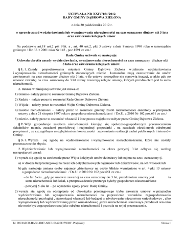 UCHWAŁA NR XXIV/151/2012 RADY GMINY DĄBROWA ZIELONA z dnia 30 października 2012 r. w sprawie zasad wydzierżawiania lub wynajmowania nieruchomości na czas oznaczony dłuższy niż 3 lata oraz zawierania kolejnych umów Na podstawie art.18 ust.2 pkt 9 lit. a , art. 40 ust.2, pkt 3 ustawy z dnia 8 marca 1990 roku o samorządzie gminnym / Dz. U. z 2001 roku Nr 142 , poz.1591 ze zm./ Rada Gminy uchwala co następuje: Uchwała określa zasady wydzierżawiania, wynajmowania nieruchomości na czas oznaczony dłuższy niż 3 lata oraz zawierania kolejnych umów. § 1. 1. Zasady gospodarowania mieniem Gminy Dąbrowa Zielona w zakresie wydzierżawiania i wynajmowania nieruchomości gminnych stanowiących mienie komunalne mają zastosowanie do umów zawieranych na czas oznaczony dłuższy niż 3 lata, o ile ustawy szczególne nie stanowią inaczej, a także gdy po umowie zawartej na czas oznaczony do 3 lat strony zawierają kolejne umowy, których przedmiotem jest ta sama nieruchomość. 2. Ilekroć w niniejszej uchwale jest mowa o: 1) Gminie- należy przez to rozumieć Gminę Dąbrowa Zielona 2) Radzie - należy przez to rozumieć Radę Gminy Dąbrowa Zielona 3) Wójcie - należy przez to rozumieć Wójta Gminy Dąbrowa Zielona. 4) zasobie nieruchomości – należy przez to rozumieć gminny zasób nieruchomości określony w przepisach ustawy z dnia 21 sierpnia 1997 roku o gospodarce nieruchomościami / Dz.U. z 2010 Nr 102 poz.651 ze zm./ 5) mienie- należy przez to rozumieć własność i inne prawa majątkowe nabyte przez Gminę Dąbrowa Zielona. § 2. Wójt gospodaruje zasobem nieruchomości kierując się społeczno-gospodarczym przeznaczeniem składników mienia, zasadami prawidłowej i racjonalnej gospodarki , na zasadach określonych odrębnymi przepisami , ze szczególnym uwzględnieniem konieczności zapewnienia realizacji zadań publicznych i interesów Gminy. § 3. 1. Wyraża się zgodę na wydzierżawianie i wynajmowanie nieruchomościami, które nie zostały przeznaczone do zbycia. 2. Wydzierżawianie lub wynajmowanie nieruchomości na okres powyżej 3 lat odbywa się według następujących zasad: 1) wyraża się zgodę na zawieranie przez Wójta kolejnych umów dzierżawy lub najmu na czas oznaczony tj. a) w drodze bezprzetargowej na rzecz ich dotychczasowych najemców lub dzierżawców, na ich wniosek lub b) gdy następuje zmiana osoby najemcy ,dzierżawcy na osoby bliskie wymienione w art. 4 pkt 13 ustawy o gospodarce nieruchomościami: / Dz.U. z 2010 Nr 102 poz.651 ze zm./ - do lat 5-ciu , gdy po umowie zawartej na czas oznaczony do 3 lat, przedmiotem umowy jest sama nieruchomość lub lokal, a przeprowadzenie przetargu byłoby gospodarczo nieuzasadnione ta - powyżej 5-ciu lat – po wyrażeniu zgody przez Radę Gminy. 2) wyraża się zgodę na odstąpienie od obowiązku przetargowego trybu zawarcia umowy w przypadku wydzierżawienia lub wynajmowania nieruchomości na poprawienie warunków zagospodarowania nieruchomości przyległej , stanowiącej własność lub będącej w użytkowaniu wieczystym wnioskodawcy , albo wynajmowanej lub wydzierżawianej przez wnioskodawcę ,jeżeli nieruchomość stanowiąca przedmiot wniosku nie może być zagospodarowana jako odrębna nieruchomość i pozwala na to jej przeznaczenie. Id: 00C4A2CB-BA82-4B47-ABE3-56A251375EDF. Podpisany Strona 1 3. Umowy najmu i dzierżawy winny zawierać postanowienia zabezpieczające interesy Gminy pod względem przychodów, należytej dbałości o nieruchomość , a także określać sposób korzystania z nieruchomości , tryb i warunki rozwiązywania umowy, zasady rozliczania ewentualnie poniesionych nakładów. 4. Minimalne stawki czynszu najmu lub dzierżawy nieruchomości przeznaczonych do oddania w najem lub dzierżawę w drodze bezprzetargowej lub w drodze przetargu ustala zarządzeniem Wójt. 5. W przypadku przeprowadzenia postępowania przetargowego stawki określone zarządzeniem stanowią minimalne stawki wywoławcze w przetargu. 6. Obiekty budowlane wzniesione zgodnie z umową przez najemcę lub dzierżawcę nie mogą mieć trwałego charakteru. 7. Dopuszcza się możliwość dokonania zamiany wynajętego gruntu czy lokalu na inny w sytuacjach związanych z ważnymi dla Gminy przedsięwzięciami inwestycyjnymi, z uwagi na realizację jej potrzeb lub obniżenie przydatności lokalu lub gruntu do umówionego użytku bez winy najemcy. § 4. Wykonanie uchwały powierza się Wójtowi Gminy. § 5. Uchwała podlega ogłoszeniu w Dzienniku Urzędowym Województwa Śląskiego. § 6. Uchwała wchodzi w życie po upływie 14 dni od dnia ogłoszenia w Dzienniku Urzędowym Województwa Śląskiego. Wiceprzewodnicząca Rady Gminy Aleksandra Fuchs Id: 00C4A2CB-BA82-4B47-ABE3-56A251375EDF. Podpisany Strona 2