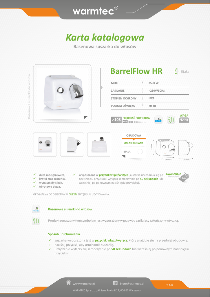 Karta katalogowa Basenowa suszarka do włosów Basenowa do włosów suszarka dosuszarka rąk MOC 2500 W ZASILANIE ~230V/50Hz STOPIEŃ OCHRONY IPX1 POZIOM DŹWIĘKU 70 dB >108 STAL BarrelFlow HR Biała WAGA PRĘDKOŚĆ POWIETRZA 4,4kg km/h STAL NIERDZEWNA 235mm OBUDOWA BIAŁA 265mm ü ü ü ü duża moc grzewcza, krótki czas suszenia, wytrzymały silnik, obrotowa dysza, ü 210mm wyposażona w przycisk włącz/wyłącz (suszarka uruchamia się po GWARANCJA (door-to-door) 2 lata naciśnięciu przycisku i wyłącza samoczynnie po 50 sekundach lub wcześniej po ponownym naciśnięciu przycisku). OPTYMALNA DO OBIEKTÓW O DUŻYM NATĘŻENIU UŻYTKOWANIA. Basenowe suszarki do włosów Produkt oznaczony tym symbolem jest wyposażony w przewód zasilający zakończony wtyczką. Sposób uruchomienia ü ü ü suszarka wyposażona jest w przycisk włącz/wyłącz, który znajduje się na przedniej obudowie, naciśnij przycisk, aby uruchomić suszarkę, urządzenie wyłączy się samoczynnie po 50 sekundach lub wcześniej po ponownym naciśnięciu przycisku. www.warmtec.pl [email protected] WARMTEC Sp. z o.o., Al. Jana Pawła II 27, 00-867 Warszawa V. 1.03