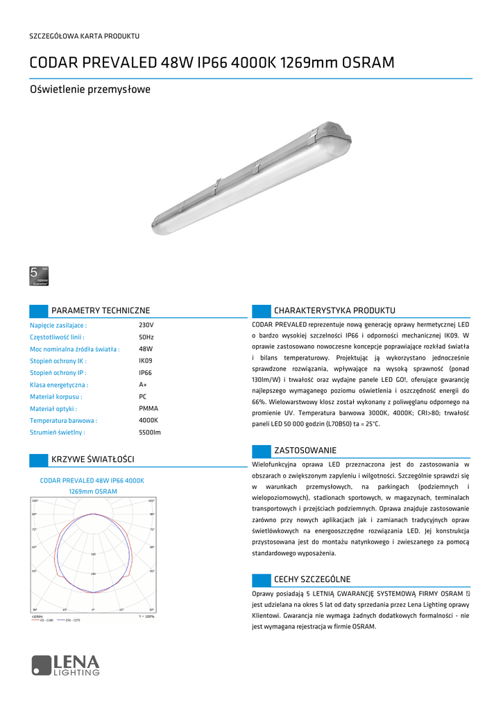 SZCZEGÓŁOWA KARTA PRODUKTU CODAR PREVALED 48W IP66 4000K 1269mm OSRAM Oświetlenie przemysłowe PARAMETRY TECHNICZNE Napięcie zasilajace : 230V CODAR PREVALED reprezentuje nową generację oprawy hermetycznej LED Częstotliwość linii : 50Hz o bardzo wysokiej szczelności IP66 i odporności mechanicznej IK09. W Moc nominalna źródła światła : 48W oprawie zastosowano nowoczesne koncepcje poprawiające rozkład światła Stopień ochrony IK : IK09 i bilans temperaturowy. Projektując ją wykorzystano jednocześnie Stopień ochrony IP : IP66 Klasa energetyczna : A+ Materiał korpusu : PC Materiał optyki : PMMA Temperatura barwowa : 4000K Strumień świetlny : 5500lm sprawdzone rozwiązania, wpływające na wysoką sprawność (ponad 130lm/W) i trwałość oraz wydajne panele LED GO!, oferujące gwarancję najlepszego wymaganego poziomu oświetlenia i oszczędność energii do 66%. Wielowarstwowy klosz został wykonany z poliwęglanu odpornego na promienie UV. Temperatura barwowa 3000K, 4000K; CRI>80; trwałość paneli LED 50 000 godzin (L70B50) ta = 25°C. CHARAKTERYSTYKA PRODUKTU KRZYWE ŚWIATŁOŚCI CODAR PREVALED 48W IP66 4000K 1269mm OSRAM ZASTOSOWANIE Wielofunkcyjna oprawa LED przeznaczona jest do zastosowania w obszarach o zwiększonym zapyleniu i wilgotności. Szczególnie sprawdzi się w warunkach przemysłowych, na parkingach (podziemnych i wielopoziomowych), stadionach sportowych, w magazynach, terminalach transportowych i przejściach podziemnych. Oprawa znajduje zastosowanie zarówno przy nowych aplikacjach jak i zamianach tradycyjnych opraw świetlówkowych na energooszczędne rozwiązania LED. Jej konstrukcja przystosowana jest do montażu natynkowego i zwieszanego za pomocą standardowego wyposażenia. CECHY SZCZEGÓLNE Oprawy posiadają 5 LETNIĄ GWARANCJĘ SYSTEMOWĄ FIRMY OSRAM jest udzielana na okres 5 lat od daty sprzedania przez Lena Lighting oprawy Klientowi. Gwarancja nie wymaga żadnych dodatkowych formalności - nie jest wymagana rejestracja w firmie OSRAM. ጀ SZCZEGÓŁOWA KARTA PRODUKTU CODAR PREVALED 48W IP66 4000K 1269mm OSRAM Oświetlenie przemysłowe TABELA PARAMETRÓW TECHNICZNYCH indeks: 380327 Oddawanie barw: Ra>80 Napięcie zasilajace: 230V Jednolitość barwy: (0,38; 0,38) Częstotliwość linii: 50Hz Źródło światła: PREVALED Moc nominalna źródła światła: 48W Liczba sztuk w opakowaniu Stopień ochrony IK: IK09 zbiorczym: Stopień ochrony IP: IP66 1szt Źródło światła wymienne: Nie Skuteczność świetlna: 109lm/W Klasa energetyczna: A+ Klasa ochrony: I Wymiary: 1269/100/100mm Wymiary montażowe: d=790 Waga: 2,2kg Materiał korpusu: PC Materiał optyki: PMMA Temperatura barwowa: 4000K Sposób montażu: Natynkowy, zwieszany Klips: Inox Strumień świetlny: 5500lm Moc znamionowa oprawy: 50,2W Współczynnik mocy lampy: 0,9 Kod EAN: 5905963 Oznaczenie CE: Tak Materiał klosza: PC Nominalny okres trwałości lampy: 50000h Znamionowa trwałość lampy: 50000h Współczynnik zachowania strumienia świetlnego na zakończenie nominalnego okresu 0,8 trwałości: Awaryjność 5000h: ≤1% Liczba cykli włącz / wyłącz poprzedzająca przedwczesny koniec 25000 eksploatacji: Czas nagrzewania się lampy do 60% pełnego strumienia świetlnego: pomijalny Współpraca z ściemniaczami: Brak możliwości ściemniania Do zastosowań zewnętrznych: Nie Rozkład widmowy mocy: (0,38; 0,38) Data aktualizacji karty: 2016-04-27 8/2016 www.lenalighting.pl | Strona 2