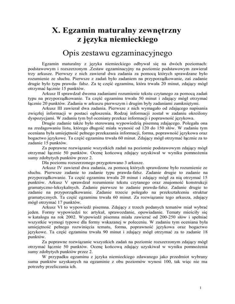 X. Egzamin maturalny zewnętrzny z języka niemieckiego Opis zestawu egzaminacyjnego Egzamin maturalny z języka niemieckiego odbywał się na dwóch poziomach: podstawowym i rozszerzonym .Zestaw egzaminacyjny na poziomie podstawowym zawierał trzy arkusze. Pierwszy z nich zawierał dwa zadania za pomocą których sprawdzane było rozumienie ze słuchu. Pierwsze z zadań było zadaniem na przyporządkowanie, zaś zadanie drugie było typu prawda- fałsz. Za tę część egzaminu, która trwała 20 minut, zdający mógł otrzymać łącznie 15 punktów. Arkusz II sprawdzał dwoma zadaniami rozumienie tekstu czytanego za pomocą zadań typu na przyporządkowanie. Ta część egzaminu trwała 50 minut i zdający mógł otrzymać łącznie 20 punktów. Zadania w arkuszu pierwszym i drugim były zadaniami zamkniętymi. Arkusz III zawierał dwa zadania. Pierwsze z nich wymagało od zdającego napisania zwięzłej informacji w postaci ogłoszenia. Rodzaj informacji został w zadaniu określony dyspozycjami. W zadaniu tym był oceniany przekaz informacji i poprawność językowa. Drugie zadanie także było sterowaną wypowiedzią pisemną zdającego. Polegała ona na zredagowaniu listu, którego długość miała wynosić od 120 do 150 słów. W zadaniu tym oceniana była umiejętność pełnego przekazania informacji, forma, poprawność językowa oraz bogactwo językowe. Ta część egzaminu trwała 60 minut. Zdający mógł otrzymać łącznie za to zadanie 15 punktów. Za poprawne rozwiązanie wszystkich zadań na poziomie podstawowym zdający mógł otrzymać łącznie 50 punktów. Ocenę końcową zdający uzyskiwał w wyniku pomnożenia sumy zdobytych punktów przez 2. Dla poziomu rozszerzonego przygotowano 3 arkusze. Arkusz IV zawierał dwa zadania, za pomocą których sprawdzone było rozumienie ze słuchu. Pierwsze zadanie to zadanie typu prawda-fałsz. Zadanie drugie to zadanie na przyporządkowanie. Ta część egzaminu trwała 20 minut i zdający mógł za nią otrzymać 15 punktów. Arkusz V sprawdzał rozumienie tekstu czytanego oraz znajomość konstrukcji gramatyczno-leksykalnych. Zadanie pierwsze to zadanie prawda-fałsz. Zadanie drugie to zadanie na przyporządkowanie. Zadanie trzecie polegało na przekształceniu struktur gramatycznych. Ta część egzaminu trwała 60 minut. Za rozwiązanie tego arkusza, zdający mógł otrzymać 17 punktów. Arkusz VI to wypowiedź pisemna. Zdający z trzech podanych tematów miał wybrać jeden. Formy wypowiedzi to: artykuł, sprawozdanie, opowiadanie. Tematy mieściły się w katalogu na rok 2002. Wypowiedź pisemna miała zawierać od 200-250 słów i spełniać wszystkie wymogi typowe dla formy wskazanej w poleceniu. W zadaniu tym oceniana była umiejętność pełnego rozwinięcia tematu, forma, poprawność językowa oraz bogactwo językowe. Ta część egzaminu trwała 90 minut i zdający mógł otrzymać za to zadanie 18 punktów. Za poprawne rozwiązanie wszystkich zadań na poziomie rozszerzonym zdający mógł otrzymać łącznie 50 punktów. Ocenę końcową zdający uzyskiwał w wyniku pomnożenia sumy zdobytych punktów przez 2. W przypadku egzaminu z języka niemieckiego zdawanego jako przedmiot wybrany suma punktów uzyskanych na egzaminie z obu poziomów wynosi 100, tak więc nie ma potrzeby przeliczania ich. 1 Siatka arkuszy egzaminacyjnych Poziom podstawowy Arkusz I – Rozumienie ze słuchu Tabela nr 1. Charakterystyka zadań Nr zad. 1. Rodzaj tekstu rozmowa 2. wywiad Temat z Technika katalogu dom przyporządkowanie kultura prawda-fałsz Typ zadania zamknięte Standar dy 2.a, 2.b zamknięte 2.a, 2.b Umiejętności. Liczba szczegółowe zadań 2, 3, 6 9 3, 5 6 Liczba punktów 9 6 Arkusz II – Rozumienie tekstu czytanego Tabela nr 2. Charakterystyka zadań Nr zad. 3. 4. Rodzaj tekstu Temat z katalogu zdrowie (niepełnosprawni) czas wolny informacja (zainteresowania, hobby) wywiad Standar Umiejętności dy szczegółowe Liczb Liczba a punktów zadań Technika Typ zadania przyporządko wanie zamknięte 2.b 5, 6 8 8 przyporządko wanie zamknięte 2.b 6 12 12 Arkusz III – Wypowiedź pisemna Tabela nr 3. Charakterystyka zadań Nr zad. 5. Rodzaj tekstu ogłoszenie 6 list Temat z katalogu Technika czas wolny (podróżowanie) krótki tekst użytkowy podróżowanie (biuro podróży) dłuższy tekst użytkowy Typ zadania otwarte otwarte Standardy 1.a, 1.b, 1.c, 2.c, 2.d, 3.c 1.a, 1.b, 1.c 2.c, 2.d, 3.c Umiejętności Liczba Liczba szczegółowe zadań punktów 1, 5, 6, 9, 12 1 5 1, 3, 4, 5, 9, 12 1 10 2 Poziom rozszerzony Arkusz IV - Rozumienie ze słuchu Tabela nr 4. Charakterystyka zadań Nr zad. Rodzaj tekstu 7. artykuł prasowy 8. porady Temat z katalogu zagrożenia współczesnego świata hobby, życie rodzinne, zdrowie Technika Typ zadania Standardy Umiejętności. Liczba Liczba szczegółowe zadań punktów prawdafałsz zamknięte 2.a, 2.b, 3.a 3, 5, 10, 13 9 9 przyporząd zamknięte kowanie 2.a, 2.b, 3.a 3, 5, 10, 13 6 6 Arkusz V – Rozumienie tekstu czytanego Tabela nr 5. Charakterystyka zadań Nr zad. Rodzaj tekstu 9. tekst literacki 10. 11. Temat z katalogu tekst literacki tekst publicysty czny Technika Typ zadania prawdafałsz zamknięte czas wolny, kultura i sztuka (literatura) kultura i sztuka literatura wielokrotny wybór życie rodzinne i towarzyskie przekształce nia Standar Umiejętności Liczba dy szczegółowe zadań 2.b zamknięte 1.a, 2.c, otwarte 2.a, 2.c Liczba punktów 5, 11 7 7 4, 15 10 5 15 5 5 Umiejętności szczegółowe Liczba zadań Liczba punktów Arkusz VI – Wypowiedź pisemna Tabela nr 6. Charakterystyka zadań Nr zad. Rodzaj tekstu artykuł 12. sprawozd anie opowiadanie Temat z katalogu zagrożenia współczesnego świata (środowisko naturalne) elementy wiedzy o krajach, podróżowanie czas wolny, życie rodzinne i towarzyskie Technika wypowiedź pisemna Typ zadania otwarte Standardy 1.c, 4.a, 2.c, 1, 3, 5, 7, 8, 1.b, 3.c,4.d 9, 11, 12 1.a 1 18 3 A. Przedmiot obowiązkowy Informacje wstępne
