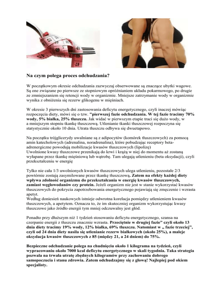 Na czym polega proces odchudzania? W początkowym okresie odchudzania zazwyczaj obserwowane są znaczące ubytki wagowe. Są one związane po pierwsze ze stopniowym opróżnianiem układu pokarmowego, po drugie ze zmniejszaniem się retencji wody w organizmie. Mniejsze zatrzymanie wody w organizmie wynika z obniżenia się rezerw glikogenu w mięśniach. W okresie 3 pierwszych dni zastosowania deficytu energetycznego, czyli inaczej mówiąc rozpoczęcia diety, mówi się o tzw. "pierwszej fazie odchudzania. W tej fazie tracimy 70% wody, 5% białka, 25% tłuszczu. Jak widać w pierwszym etapie traci się dużo wody, w a mniejszym stopniu tkankę tłuszczową. Utlenianie tkanki tłuszczowej rozpoczyna się statystycznie około 10 dnia. Utrata tłuszczu odbywa się dwuetapowo. Na początku trójglicerydy uwalniane są z adipocytów (komórek tłuszczowych) za pomocą amin katecholowych (adrenalina, noradrenalina), które pobudzając receptory betaadrenergiczne powodują mobilizacje kwasów tłuszczowych (lipolizę) Uwolnione kwasy tłuszczowe przenikają do krwi i krążą w niej do momentu aż zostaną wyłapane przez tkankę mięśniową lub wątrobę. Tam ulegają utlenieniu (beta oksydacji), czyli przekształceniu w energię Tylko nie cała 1/3 uwolnionych kwasów tłuszczowych ulega utlenieniu, pozostałe 2/3 powtórnie zostają zasymilowane przez tkankę tłuszczową. Zatem na efekty każdej diety wpływa zdolność organizmu do przekształcania w energię kwasów tłuszczowych, zamiast węglowodanów czy protein. Jeżeli organizm nie jest w stanie wykorzystać kwasów tłuszczowych do pokrycia zapotrzebowania energetycznego pojawiają się zmęczenie i wzrasta apetyt. Według doniesień naukowych istnieje odwrotna korelacja pomiędzy utlenieniem kwasów tłuszczowych, a apetytem. Oznacza to, że im skuteczniej organizm wykorzystując kwasy tłuszczowe jako źródło energii tym mniej odczuwalny jest głód. Ponadto przy dłuższym niż 1 tydzień stosowaniu deficytu energetycznego, szansa na czerpanie energii z tłuszczu znacznie wzrasta. Przeciętnie w drugiej fazie” czyli około 13 dnia diety tracimy 19% wody, 12% białka, 69% tłuszczu. Natomiast w „ fazie trzeciej”, czyli od 24 dnia diety nasila się utlenianie rezerw białkowych (około 25%), a maleje oksydacja kwasów tłuszczowych z 85 (między 21, a 24 dniem) do 75%. Bezpieczne odchudzanie polega na chudnięciu około 1 kilograma na tydzień, czyli wypracowaniu około 7000 kcal deficytu energetycznego w skali tygodnia. Taka strategia pozwala na trwała utratę zbędnych kilogramów przy zachowaniu dobrego samopoczucia i stanu zdrowia. Zatem odchudzajmy się z głową! Najlepiej pod okiem specjalisty.
