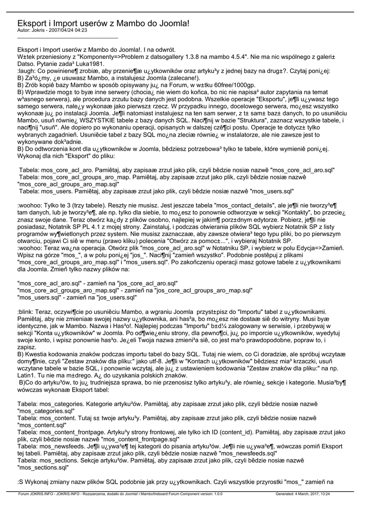 Eksport i Import userów z Mambo do Joomla! Autor: Jokris - 2007/04/24 04:23 _____________________________________ Eksport i Import userów z Mambo do Joomla!. I na odwrót. W±tek przeniesiony z "Komponenty=>Problem z datsogallery 1.3.8 na mambo 4.5.4". Nie ma nic wspólnego z galeri± Datso. Pytanie zada³ Luka1981. :laugh: Co powiniene¶ zrobiæ, aby przenie¶æ u¿ytkowników oraz artyku³y z jednej bazy na drug±?. Czytaj poni¿ej: B) Za³ó¿my, ¿e usuwasz Mambo, a instalujesz Joomla (zalecane!). B) Zrób kopiê bazy Mambo w sposób opisywany ju¿ na Forum, w w±tku 60free/1000gp. B) Wprawdzie mog± to byæ inne serwery (chocia¿ nie wiem do koñca, bo nic nie napisa³ autor zapytania na temat w³asnego serwera), ale procedura zrzutu bazy danych jest podobna. Wszelkie operacje "Eksportu", je¶li u¿ywasz tego samego serwera, nale¿y wykonaæ jako pierwsz± rzecz. W przypadku innego, docelowego serwera, mo¿esz wszystko wykonaæ ju¿ po instalacji Joomla. Je¶li natomiast instalujesz na ten sam serwer, z t± sam± baz± danych, to po usuniêciu Mambo, usuñ równie¿ WSZYSTKIE tabele z bazy danych SQL. Naci¶nij w bazie "Struktura", zaznacz wszystkie tabele, i naci¶nij "usuñ". Ale dopiero po wykonaniu operacji, opisanych w dalszej czê¶ci postu. Operacje te dotycz± tylko wybranych zagadnieñ. Usuniêcie tabel z bazy SQL mo¿na zleciæ równie¿ w instalatorze, ale nie zawsze jest to wykonywane dok³adnie. B) Do odtworzenia kont dla u¿ytkowników w Joomla, bêdziesz potrzebowa³ tylko te tabele, które wymieniê poni¿ej. Wykonaj dla nich "Eksport" do pliku: Tabela: mos_core_acl_aro. Pamiêtaj, aby zapisaæ zrzut jako plik, czyli bêdzie nosiæ nazwê "mos_core_acl_aro.sql" Tabela: mos_core_acl_groups_aro_map. Pamiêtaj, aby zapisaæ zrzut jako plik, czyli bêdzie nosiæ nazwê "mos_core_acl_groups_aro_map.sql" Tabela: mos_users. Pamiêtaj, aby zapisaæ zrzut jako plik, czyli bêdzie nosiæ nazwê "mos_users.sql" :woohoo: Tylko te 3 (trzy tabele). Reszty nie musisz. Jest jeszcze tabela "mos_contact_details", ale je¶li nie tworzy³e¶ tam danych, lub je tworzy³e¶, ale np. tylko dla siebie, to mo¿esz to ponownie odtworzyæ w sekcji "Kontakty", bo przecie¿ znasz swoje dane. Teraz otwórz ka¿dy z plików osobno, najlepiej w jakim¶ porz±dnym edytorze. Pobierz, je¶li nie posiadasz, Notatnik SP PL 4.1 z mojej strony. Zainstaluj, i podczas otwierania plików SQL wybierz Notatnik SP z listy programów wy¶wietlonych przez system. Nie musisz zaznaczaæ, aby zawsze otwiera³ tego typu pliki, bo po pierwszym otwarciu, pojawi Ci siê w menu (prawo kliku) polecenia "Otwórz za pomoc±...", i wybieraj Notatnik SP. :woohoo: Teraz wa¿na operacja. Otwórz plik "mos_core_acl_aro.sql" w Notatniku SP, i wybierz w polu Edycja=>Zamieñ. Wpisz na górze "mos_", a w polu poni¿ej "jos_". Naci¶nij "zamieñ wszystko". Podobnie postêpuj z plikami "mos_core_acl_groups_aro_map.sql" i "mos_users.sql". Po zakoñczeniu operacji masz gotowe tabele z u¿ytkownikami dla Joomla. Zmieñ tylko nazwy plików na: "mos_core_acl_aro.sql" - zamieñ na "jos_core_acl_aro.sql" "mos_core_acl_groups_aro_map.sql" - zamieñ na "jos_core_acl_groups_aro_map.sql" "mos_users.sql" - zamieñ na "jos_users.sql" :blink: Teraz, oczywi¶cie po usuniêciu Mambo, a wgraniu Joomla przyst±pisz do "Importu" tabel z u¿ytkownikami. Pamiêtaj, aby nie zmieniaæ swojej nazwy u¿ytkownika, ani has³a, bo mo¿esz nie dostaæ siê do witryny. Musi byæ identyczne, jak w Mambo. Nazwa i Has³o!. Najlepiej podczas "Importu" b±d¼ zalogowany w serwisie, i przebywaj w sekcji "Konta u¿ytkowników" w Joomla. Po od¶wie¿eniu strony, dla pewno¶ci, ju¿ po imporcie u¿ytkowników, wyedytuj swoje konto, i wpisz ponownie has³o. Je¿eli Twoja nazwa zmieni³a siê, co jest ma³o prawdopodobne, popraw to, i zapisz. B) Kwestia kodowania znaków podczas importu tabel do bazy SQL. Tutaj nie wiem, co Ci doradziæ, ale spróbuj wczytaæ domy¶lnie, czyli "Zestaw znaków dla pliku:" jako utf-8. Je¶li w "Kontach u¿ytkowników" bêdziesz mia³ krzaczki, usuñ wczytane tabele w bazie SQL, i ponownie wczytaj, ale ju¿ z ustawieniem kodowania "Zestaw znaków dla pliku:" na np. Latin1. Tu nie ma m±drego. A¿ do uzyskania polskich znaków. B)Co do artyku³ów, to ju¿ trudniejsza sprawa, bo nie przenosisz tylko artyku³y, ale równie¿ sekcje i kategorie. Musia³by¶ wówczas wykonaæ Eksport tabel: Tabela: mos_categories. Kategorie artyku³ów. Pamiêtaj, aby zapisaæ zrzut jako plik, czyli bêdzie nosiæ nazwê "mos_categories.sql" Tabela: mos_content. Tutaj s± twoje artyku³y. Pamiêtaj, aby zapisaæ zrzut jako plik, czyli bêdzie nosiæ nazwê "mos_content.sql" Tabela: mos_content_frontpage. Artyku³y strony frontowej, ale tylko ich ID (content_id). Pamiêtaj, aby zapisaæ zrzut jako plik, czyli bêdzie nosiæ nazwê "mos_content_frontpage.sql" Tabela: mos_newsfeeds. Je¶li u¿ywa³e¶ tej kategorii do pisania artyku³ów. Je¶li nie u¿ywa³e¶, wówczas pomiñ Eksport tej tabeli. Pamiêtaj, aby zapisaæ zrzut jako plik, czyli bêdzie nosiæ nazwê "mos_newsfeeds.sql" Tabela: mos_sections. Sekcje artyku³ów. Pamiêtaj, aby zapisaæ zrzut jako plik, czyli bêdzie nosiæ nazwê "mos_sections.sql" :S Wykonaj zmiany nazw plików SQL podobnie jak przy u¿ytkownikach. Czyli wszystkie przyrostki "mos_" zamieñ na Forum JOKRIS.INFO - JOKRIS.INFO - Rozszerzenia, dodatki do Joomla! i Mambofireboard Forum Component version: 1.0.0 Generated: 4 March, 2017, 13:24 "jos_". Je¶li boisz siê wykonywaæ tylu operacji, a importu ca³ej bazy z Mambo nie nale¿y wykonywaæ, ze wzglêdu na istotne ró¿nice w stosunku do Joomla, zrób inaczej. Zrób tylko import u¿ytkowników. To nie jest niebezpieczne. Natomiast ju¿ artyku³y bêdziesz musia³ skopiowaæ np. do Worda, lub lepiej do WordPada, dlatego ¿e Word dodaje swoje formatowanie. Jak wolisz. Zapisz potem te artyku³y jako "strona www sieci web - kompletna" i nadawaj nazwy takie, jakie nosz± artyku³y, czyli np