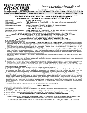 BIURO PODRÓŻY Wystarczy, że zadzwonisz, wyślesz sms-a lub e-mail MY PRZYJEDZIEMY DO CIEBIE!!! ORGANIZUJEMY: wycieczki * obozy * kolonie * wczasy * wynajem autokarów ul. Kuligowskiego 14, 85-792 Bydgoszcz tel. biuro (52) 321 84 16, kom. 535 516 322 fax (52) 321 84 17 e-mail: [email protected] www.fides-travel.pl tel. kom.: 695 644 930, 601 63 76 74 WPIS DO RE JE STRU ORG ANIZ ATORÓW TURY STYKI NR 122 - G WARAN CJ A U BE ZPIE CZE NIOW A AXA n r: 01.459.384 INFORMACJE DODATKOWE DOTYCZĄCE OBOZU/KOLONII ORGANIZOWANEJ W TERMINIE 01-11.07.2014r W MIEJSCOWOŚCI JASTRZĘBIA GÓRA Data wyjazdu: 01 lipca 2014r (wtorek) Miejsce zbiórki - wyjazdu: 7.00 - Bydgoszcz, ul. Toruńska 59 – parking przed halą sportową „Łuczniczka” Środek transportu: autokar Miejsce zakwaterowania: Ośrodek Wczasowy „RELAKS I WYGODA” ul. Wypoczynkowa 1 84 -104 Jastrzębia Góra, tel. 58 674 95 96 Data powrotu: 11 lipca 2014r (piątek) Planowana godzina powrotu: 16.00 - Bydgoszcz, ul. Toruńska 59 – parking przed halą sportową „Łuczniczka” Organizator obozu: Biuro Podróży FIDES-TRAVEL Marek Piekarski UWAGA! Aby zarezerwować miejsce na wyjazd należy dokonać ZGŁOSZENIA, w dowolny sposób: telefonicznie: 695 644 930 lub 52 321 84 16; sms: 695 644 930; e-mail: [email protected]; fax: 52 321 84 17 osobiście: w siedzibie biura w Bydgoszczy, przy ul. Kuligowskiego 14 (w godz. 10.00 - 17.00) pocztą: FIDES-TRAVEL MAREK PIEKARSKI, 85-792 Bydgoszcz, ul. Kuligowskiego 14 Po dokonaniu zgłoszenia należy wpłacić zaliczkę za wyjazd w wysokości min. 300zł. Całkowitą wpłatę należy dokonać najpóźniej na 30 dni przed planowanym terminem wyjazdu. Bardzo WAŻNE informacje ogólne: 1. Osoby niepełnoletnie muszą mieć wypełnioną KARTĘ KWALIFIKACYJNĄ UCZESTNIKA WYJAZDU – dostępna na stronie internetowej www.fides-travel.pl lub u osoby przyjmującej zgłoszenie wyjazdu lub bezpośrednio w siedzibie biura. Kartę należy jak najszybciej dostarczyć do biura. Można ją dostarczyć osobiście (jeśli będziecie Państwo poza godzinami otwarcia [10-17] prosimy ją zostawić w skrzynce na listy; można kartę przesłać pocztą, ewentualnie można kartę zeskanować i przesłać mailem [[email protected] lub fax-em 52 321 84 17], a oryginał oddać przy najbliższej okazji lub ostatecznie w dniu wyjazdu. 2. W trosce o wygodę i przede wszystkim o bezpieczeństwo podróżnych oraz spełnienie norm związanych z obciążeniem autokaru należy spakować bagaż w następujący sposób (wymagania dotyczą 1 osoby): 1 szt. bagażu podstawowego do 15 kg (schowany będzie do luków bagażowych – może być podpisany), 1 bagaż podręczny do 5 kg (zabrany ze sobą do środka autokaru na podręczne rzeczy i prowiant na drogę). Kierowcy mogą odmówić zapakowania nadmiernego i niestandardowego bagażu! 3. Rzeczy bardzo cennych, pamiątkowych itp. prosimy ze sobą nie zabierać! Jeśli jest to rzecz bardzo potrzebna to na przechowani e prosimy oddać wychowawcy. 4. Pieniądze na drobne wydatki należy dać dziecku w kopercie (podpisanej imieniem i nazwiskiem dziecka oraz wpisaniem kwoty jaka jest w kopercie). Pieniądze prosimy przygotować w najniższych, papierowych nominałach (kopertę najlepiej oddać do przechowania wychowawcom lub pilotowi przy wyjeździe – na miejscu zbiórki). 5. Dzieciom, które źle znoszą jazdę autokarem należy odpowiednio wcześniej podać leki. Podanie ich dopiero w autokarze spowoduje o późnione działanie. Prosimy także zaopatrzyć dziecko w potrzebne leki na drogę powrotną – leki te należy oddać wychowawcom na przechowanie. Na miejscu udostępniony będzie nr tel. kom. na który będzie można dzwonić do dziecka, z tego tel. dziecko w razie potrzeby także będzie mogło dzwonić do Rodziców – BEZPŁATNIE (tylko połączenia krajowe), nr telefonu dostępny będzie na 7 dni przed wyjazdem – informacja w biurze. Rzeczy które należy ze sobą zabrać: * aktualną legitymację szkolną (można także wziąć książeczkę zdrowia, ale nie jest to wymagane) * leki, jeśli dziecko musi jakieś przyjmować w trakcie pobytu na kolonii – leki należy koniecznie przekazać przed wyjazdem kierownikowi kolonii lub wychowawcom; na kartce należy napisać oświadczenie upoważniające do podawania leku oraz informację jak często, jakie leki i o jakiej porze dziecko musi leki przyjmować. Dziecko nie może samodzielnie leków zażywać oraz przechowywać ich w swoim pokoju! * rzeczy do codziennego ubrania (spodnie, bluzy, koszulki – w odpowiedniej ilości), kurtkę przeciwdeszczową; klapki pod prysznic, środki higieny osobistej, przybory toaletowe: mydło, szampon, pasta i szczotka do zębów, grzebień; ręcznik kąpielowy + 1 mały ręcznik; bieliznę osobistą na zmianę, chusteczki higieniczne, piżamę, kapcie lub tenisówki, kąpielówki/strój na basen, mały plecak (na wycieczki, do prowiantu, itp.), olejek lub krem do opalania z filtrem, czapkę z daszkiem lub chustę na głowę, strój sportowy (spodenki, koszulki z krótkim rękawkiem, obuwie miękkie oraz sandały), min. 2 pary spodni i krótkich spodenek, środek przeciwko komarom, kleszczom. Dobrze jest sporządzić dziecku listę r zeczy które ze sobą zabiera i umieścić ją w walizce oraz np. zaznaczenie na metkach rzeczy inicjałów dziecka, zapobiegnie to nieporozumieniom czy je to ubrania. Dziecko często nie wie, że to jego ubranie, szczególnie gdy jest kupione tuż przed wyjazdem. Prosimy także o przygotowanie foliowej torby na brudną bieliznę. * można zabrać ze sobą jakieś gry planszowe, zręcznościowe, karty, ulubioną zabawkę, maskotkę, itp. OPŁATA ZA WYJAZD Wszelkie wpłaty można dokonać na kilka sposobów: 1. Wpłacić gotówkę osobie u której dokonuje się zgłoszenia, np. nauczycielowi w danej szkole, wymienionemu w informacji, którą Państwo otrzymaliście. 2. Wpłacić bezpośrednio w biurze w Bydgoszczy – prosimy o wcześniejsze umówienie godziny sp