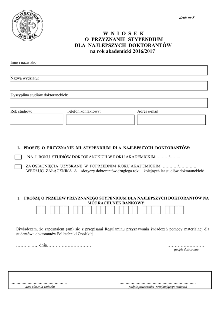 druk nr 8 W N I O S E K O PRZYZNANIE STYPENDIUM DLA NAJLEPSZYCH DOKTORANTÓW na rok akademicki 2016/2017 Imię i nazwisko: Nazwa wydziału: Dyscyplina studiów doktoranckich: Rok studiów: Telefon kontaktowy: Adres e-mail: 1. PROSZĘ O PRZYZNANIE MI STYPENDIUM DLA NAJLEPSZYCH DOKTORANTÓW: NA I ROKU STUDIÓW DOKTORANCKICH W ROKU AKADEMICKIM ………/…….. ZA OSIĄGNIĘCIA UZYSKANE W POPRZEDNIM ROKU AKADEMICKIM …………/…………. WEDŁUG ZAŁĄCZNIKA A /dotyczy doktorantów drugiego roku i kolejnych lat studiów doktoranckich/ 2. PROSZĘ O PRZELEW PRZYZNANEGO STYPENDIUM DLA NAJLEPSZYCH DOKTORANTÓW NA MÓJ RACHUNEK BANKOWY: Oświadczam, że zapoznałem (am) się z przepisami Regulaminu przyznawania świadczeń pomocy materialnej dla studentów i doktorantów Politechniki Opolskiej. ………..…, dnia………………………… ……………………. podpis doktoranta ………………………………………. data złożenia wniosku ……………………………………………………… podpis pracownika przyjmującego wniosek Opinia Wydziałowej Komisji Stypendialnej Uzyskana liczba punktów …………. Wydziałowa Komisja Stypendialna rekomenduje przyznanie* /nieprzyznanie* stypendium dla najlepszych doktorantów na rok akademicki ............................... w wysokości .................. zł na okres od ……………………………. do ……………………………………….. miesięcznie Opole, dnia .................................... ……………………………………………… podpisy członków Wydziałowej Komisji Stypendialnej 2 Załącznik A do druku nr 8 (dotyczy doktorantów drugiego roku i kolejnych lat studiów doktoranckich) 1. DANE DOKTORANTA UBIEGAJĄCEGO SIĘ O PRZYZNANIE STYPENDIUM DLA NAJLEPSZYCH DOKTORANTÓW ZA OSIĄGNIĘCIA UZYSKANE W POPRZEDNIM ROKU AKADEMICKIM ……/……. Imię i nazwisko: Nazwa wydziału: Dyscyplina studiów doktoranckich: Rok studiów: 2. OSIĄGNIĘCIA DOKTORANTA W POPRZEDNIM ROKU AKADEMICKIM 2.1. Średnia ocen za poprzedni rok akademicki x 10 pkt Liczba punktów1 Średnia ocen za ostatni rok akademicki ………… x 10 pkt 2.2. Publikacje popularno – naukowe (należy dołączyć ksero pierwszej strony artykułu): Liczbę punktów dzieli się odpowiednio na liczbę autorów publikacji z wyłączeniem opiekuna naukowego / promotora oraz jednej wskazanej w oświadczeniu osoby, z którą doktorant współpracuje (doktor, kopromotor lub promotor pomocniczy). Czasopisma z listy MNiSW: Publikacje w recenzowanych materiałach z konferencji międzynarodowych uwzględnionych w Web of Science Rozdział w monografii naukowej: Recenzowane czasopismo branżowe o zasięgu co najmniej ogólnopolskim grupa A (publikacje filadelfijskie) grupa B pkt wg listy 10 pkt 10 pkt w języku obcym 8 pkt w języku polskim 7 pkt Przez monografię naukową należy rozumieć spójne tematycznie, recenzowane opracowanie naukowe, zawierające bibliografię naukową, publikowane jako książka, przedstawiające określone zagadnienie w sposób oryginalny i twórczy. Przez rozdział w monografii naukowej należy rozumieć opracowanie naukowe o objętości co najmniej pół arkusza wydawniczego (20 000 znaków typograficznych ze spacjami). 7 pkt Przez czasopismo branżowe należy rozumieć czasopismo zawierające artykuły naukowe z jednej tematyki / jednej dziedziny naukowej. Do czasopism branżowych nie zalicza się czasopism publikujących artykuły o różnej tematyce. Zeszyty naukowe Politechniki Opolskiej Zeszyty naukowe: w języku obcym w języku polskim 4 pkt 3 pkt Konferencja naukowa (materiały konferencyjne): w języku obcym w języku polskim 4 pkt 3 pkt 5 pkt 3 Nazwa czasopisma, konferencji, zeszytu Tytuł Autorzy Data wydania Liczba punktów Suma punktów: 2.3. Inne osiągnięcia (należy dołączyć dokument potwierdzający): Patenty: wdrożenie patentu przyznanie patentu zgłoszenie patentu 12 pkt 6 pkt 4 pkt Granty: kierownictwo grantu udział w grancie 12 pkt 6 pkt Otwarty przewód doktorski 8 pkt Inne osiągnięcia Liczba punktów Patenty: wdrożenie patentu / przyznanie patentu / zgłoszenie patentu Granty: kierownictwo grantu / udział w grancie Otwarty przewód doktorski Suma punktów: 2.4. Praktyki zawodowe w formie prowadzenia zajęć dydaktycznych lub uczestniczenia w ich prowadzeniu (* niepotrzebne skreślić): TAK * NIE * 4 2.5. Sumaryczna liczba punktów: Liczba punktów1 Kryterium Średnia ocen Publikacje popularno – naukowe Inne osiągnięcia Suma punktów 1: OŚWIADCZENIE Świadomy(a) konsekwencji za podanie nieprawidłowych danych, pod rygorem odpowiedzialności dyscyplinarnej, określonej w przepisie art. 211 i nast. ustawy z dnia 27 lipca 2005 r. Prawo szkolnictwie wyższym (Dz. U. z 2012 r., poz. 572 z późn. zm.), włącznie z wydaleniem z Politechniki Opolskiej, a także odpowiedzialności karnej i cywilnej oraz mając na uwadze, że pomoc materialna otrzymana na podstawie nieprawdziwych danych podlega natychmiastowemu zwrotowi oświadczam, że podane przeze mnie informacje są zgodne ze stanem faktycznym. ……………… data 1 wypełnia pracownik wydziału 5 .......................................................... podpis doktoranta