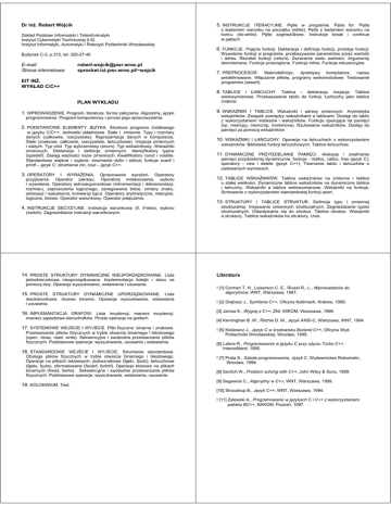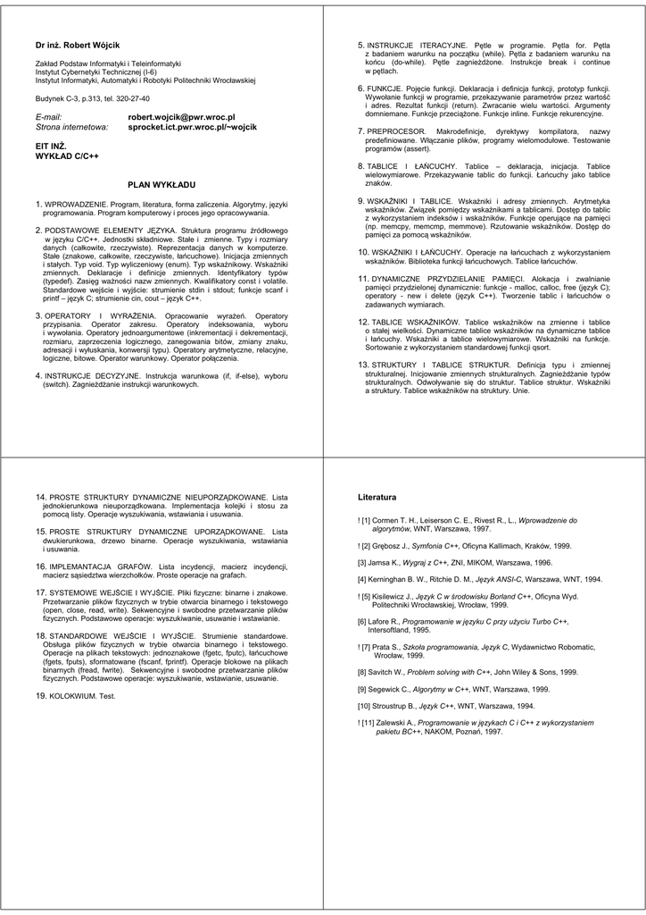 Dr inż. Robert Wójcik 5. INSTRUKCJE ITERACYJNE. Pętle w programie. Pętla for. Pętla Zakład Podstaw Informatyki i Teleinformatyki Instytut Cybernetyki Technicznej (I-6) Instytut Informatyki, Automatyki i Robotyki Politechniki Wrocławskiej z badaniem warunku na początku (while). Pętla z badaniem warunku na końcu (do-while). Pętle zagnieżdżone. Instrukcje break i continue w pętlach. 6. FUNKCJE. Pojęcie funkcji. Deklaracja i definicja funkcji, prototyp funkcji. Budynek C-3, p.313, tel. 320-27-40 E-mail: Strona internetowa: [email protected] sprocket.ict.pwr.wroc.pl/~wojcik EIT INŻ. WYKŁAD C/C++ Wywołanie funkcji w programie, przekazywanie parametrów przez wartość i adres. Rezultat funkcji (return). Zwracanie wielu wartości. Argumenty domniemane. Funkcje przeciążone. Funkcje inline. Funkcje rekurencyjne. 7. PREPROCESOR. Makrodefinicje, dyrektywy kompilatora, nazwy predefiniowane. Włączanie plików, programy wielomodułowe. Testowanie programów (assert). 8. TABLICE I ŁAŃCUCHY. Tablice – deklaracja, inicjacja. Tablice PLAN WYKŁADU 1. WPROWADZENIE. Program, literatura, forma zaliczenia. Algorytmy, języki programowania. Program komputerowy i proces jego opracowywania. 2. PODSTAWOWE ELEMENTY JĘZYKA. Struktura programu źródłowego w języku C/C++. Jednostki składniowe. Stałe i zmienne. Typy i rozmiary danych (całkowite, rzeczywiste). Reprezentacja danych w komputerze. Stałe (znakowe, całkowite, rzeczywiste, łańcuchowe). Inicjacja zmiennych i stałych. Typ void. Typ wyliczeniowy (enum). Typ wskaźnikowy. Wskaźniki zmiennych. Deklaracje i definicje zmiennych. Identyfikatory typów (typedef). Zasięg ważności nazw zmiennych. Kwalifikatory const i volatile. Standardowe wejście i wyjście: strumienie stdin i stdout; funkcje scanf i printf – język C; strumienie cin, cout – język C++. 3. OPERATORY I WYRAŻENIA. Opracowanie wyrażeń. Operatory przypisania. Operator zakresu. Operatory indeksowania, wyboru i wywołania. Operatory jednoargumentowe (inkrementacji i dekrementacji, rozmiaru, zaprzeczenia logicznego, zanegowania bitów, zmiany znaku, adresacji i wyłuskania, konwersji typu). Operatory arytmetyczne, relacyjne, logiczne, bitowe. Operator warunkowy. Operator połączenia. 4. INSTRUKCJE DECYZYJNE. Instrukcja warunkowa (if, if-else), wyboru (switch). Zagnieżdżanie instrukcji warunkowych. 14. PROSTE STRUKTURY DYNAMICZNE NIEUPORZĄDKOWANE. Lista jednokierunkowa nieuporządkowana. Implementacja kolejki i stosu za pomocą listy. Operacje wyszukiwania, wstawiania i usuwania. 15. PROSTE STRUKTURY DYNAMICZNE UPORZĄDKOWANE. Lista dwukierunkowa, drzewo binarne. Operacje wyszukiwania, wstawiania i usuwania. 16. IMPLEMANTACJA GRAFÓW. Lista incydencji, macierz incydencji, macierz sąsiedztwa wierzchołków. Proste operacje na grafach. 17. SYSTEMOWE WEJŚCIE I WYJŚCIE. Pliki fizyczne: binarne i znakowe. Przetwarzanie plików fizycznych w trybie otwarcia binarnego i tekstowego (open, close, read, write). Sekwencyjne i swobodne przetwarzanie plików fizycznych. Podstawowe operacje: wyszukiwanie, usuwanie i wstawianie. 18. STANDARDOWE WEJŚCIE I WYJŚCIE. Strumienie standardowe. Obsługa plików fizycznych w trybie otwarcia binarnego i tekstowego. Operacje na plikach tekstowych: jednoznakowe (fgetc, fputc), łańcuchowe (fgets, fputs), sformatowane (fscanf, fprintf). Operacje blokowe na plikach binarnych (fread, fwrite). Sekwencyjne i swobodne przetwarzanie plików fizycznych. Podstawowe operacje: wyszukiwanie, wstawianie, usuwanie. 19. KOLOKWIUM. Test. wielowymiarowe. Przekazywanie tablic do funkcji. Łańcuchy jako tablice znaków. 9. WSKAŹNIKI I TABLICE. Wskaźniki i adresy zmiennych. Arytmetyka wskaźników. Związek pomiędzy wskaźnikami a tablicami. Dostęp do tablic z wykorzystaniem indeksów i wskaźników. Funkcje operujące na pamięci (np. memcpy, memcmp, memmove). Rzutowanie wskaźników. Dostęp do pamięci za pomocą wskaźników. 10. WSKAŹNIKI I ŁAŃCUCHY. Operacje na łańcuchach z wykorzystaniem wskaźników. Biblioteka funkcji łańcuchowych. Tablice łańcuchów. 11. DYNAMICZNE PRZYDZIELANIE PAMIĘCI. Alokacja i zwalnianie pamięci przydzielonej dynamicznie: funkcje - malloc, calloc, free (język C); operatory - new i delete (język C++). Tworzenie tablic i łańcuchów o zadawanych wymiarach. 12. TABLICE WSKAŹNIKÓW. Tablice wskaźników na zmienne i tablice o stałej wielkości. Dynamiczne tablice wskaźników na dynamiczne tablice i łańcuchy. Wskaźniki a tablice wielowymiarowe. Wskaźniki na funkcje. Sortowanie z wykorzystaniem standardowej funkcji qsort. 13. STRUKTURY I TABLICE STRUKTUR. Definicja typu i zmiennej strukturalnej. Inicjowanie zmiennych strukturalnych. Zagnieżdżanie typów strukturalnych. Odwoływanie się do struktur. Tablice struktur. Wskaźniki a struktury. Tablice wskaźników na struktury. Unie. Literatura ! [1] Cormen T. H., Leiserson C. E., Rivest R., L., Wprowadzenie do algorytmów, WNT, Warszawa, 1997. ! [2] Grębosz J., Symfonia C++, Oficyna Kallimach, Kraków, 1999. [3] Jamsa K., Wygraj z C++, ZNI, MIKOM, Warszawa, 1996. [4] Kerninghan B. W., Ritchie D. M., Język ANSI-C, Warszawa, WNT, 1994. ! [5] Kisilewicz J., Język C w środowisku Borland C++, Oficyna Wyd. Politechniki Wrocławskiej, Wrocław, 1999. [6] Lafore R., Programowanie w języku C przy użyciu Turbo C++, Intersoftland, 1995. ! [7] Prata S., Szkoła programowania, Język C, Wydawnictwo Robomatic, Wrocław, 1999. [8] Savitch W., Problem solving with C++, John Wiley & Sons, 1999. [9] Segewick C., Algorytmy w C++, WNT, Warszawa, 1999. [10] Stroustrup B., Język C++, WNT, Warszawa, 1994. ! [11] Zalewski A., Programowanie w językach C i C++ z wykorzystaniem pakietu BC++, NAKOM, Poznań, 1997. WARUNKI ZALICZENIA WYKŁADU (INŻ.) 1. Ocena pozytywna z kolokwium i/lub kartkówki (test i/lub kartkówka odbędzie się przed sesją egzaminacyjną). 2. Do testu z wykładu można przystąpić nie posiadając zaliczeń z form towarzyszących. 3. Zaliczen