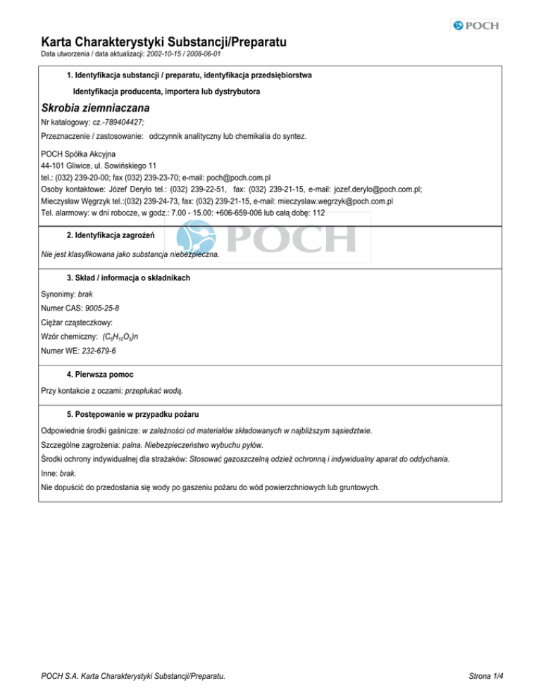 Karta Charakterystyki Substancji/Preparatu Data utworzenia / data aktualizacji: 2002-10-15 / 2008-06-01 1. Identyfikacja substancji / preparatu, identyfikacja przedsiębiorstwa Identyfikacja producenta, importera lub dystrybutora Skrobia ziemniaczana Nr katalogowy: cz.-789404427; Przeznaczenie / zastosowanie: odczynnik analityczny lub chemikalia do syntez. POCH Spółka Akcyjna 44-101 Gliwice, ul. Sowińskiego 11 tel.: (032) 239-20-00; fax (032) 239-23-70; e-mail: [email protected] Osoby kontaktowe: Józef Deryło tel.: (032) 239-22-51, fax: (032) 239-21-15, e-mail: [email protected]; Mieczysław Węgrzyk tel.:(032) 239-24-73, fax: (032) 239-21-15, e-mail: [email protected] Tel. alarmowy: w dni robocze, w godz.: 7.00 - 15.00: +606-659-006 lub całą dobę: 112 2. Identyfikacja zagrożeń Nie jest klasyfikowana jako substancja niebezpieczna. 3. Skład / informacja o składnikach Synonimy: brak Numer CAS: 9005-25-8 Ciężar cząsteczkowy: Wzór chemiczny: (C6H10O5)n Numer WE: 232-679-6 4. Pierwsza pomoc Przy kontakcie z oczami: przepłukać wodą. 5. Postępowanie w przypadku pożaru Odpowiednie środki gaśnicze: w zależności od materiałów składowanych w najbliższym sąsiedztwie. Szczególne zagrożenia: palna. Niebezpieczeństwo wybuchu pyłów. Środki ochrony indywidualnej dla strażaków: Stosować gazoszczelną odzież ochronną i indywidualny aparat do oddychania. Inne: brak. Nie dopuścić do przedostania się wody po gaszeniu pożaru do wód powierzchniowych lub gruntowych. POCH S.A. Karta Charakterystyki Substancji/Preparatu. Strona 1/4 Skrobia ziemniaczana 6. Postępowanie w przypadku niezamierzonego uwolnienia do środowiska Zebrać na sucho, przekazać do likwidacji. Oczyścić zanieczyszczony teren (zmyć wodą). Nie dopuścić do dostania się do wód, ścieków i gleby. Unikać pylenia. Nie wdychać pyłów. 7. Postępowanie z substancją / preparatem i jej / jego magazynowanie Obchodzenie się z substancją: Zapewnić skuteczną wymianę powietrza (wentylacja). Postępować zgodnie z zasadami dobrej praktyki przemysłowej oraz ogólnymi zasadami bezpieczeństwa i higieny pracy z substancjami chemicznymi. Stosować środki ochrony osobistej zgodnie z pkt.8. Nie opróżniać do kanalizacji. Magazynowanie: szczelne opakowanie. W temperaturze pokojowej (zalecane +15°C do +25°C). Rozporządzenie Ministra Zdrowia z dnia 14 marca 2003 r. w sprawie sposobu oznakowania miejsc, rurociągów oraz pojemników i zbiorników służących do przechowywania lub zawierających substancje niebezpieczne lub preparaty niebezpieczne (Dz.U.03.61.552) 8. Kontrola narażenia i środki ochrony indywidualnej Paramerty kontroli (NDS, NDSCh, NDSP): nie ustalone Stosować odpowiednią wentylację wywiewną, miejscową i ogólną zapewniającą utrzymanie stężenia produktu w powietrzu poniżej określonych limitów. Zaleca się wyposażenie miejsca pracy w wodny natrysk do płukania oczu oraz prysznic. Środki ochrony indywidualnej powinny być tak zaprojektowane i wykonane aby wykluczały zagrożenie i inne niedogodności w przewidywanych warunkach użytkowania, chroniące przed chemikaliami. Środki ochrony indywidualnej: ochrona dróg oddechowych: niekonieczna ochrona oczu: niekonieczna ochrona rąk: niekonieczna ochrona ciała: niekonieczna środki ochronne i higieny: wymyć ręce po pracy z tą substancją. Rozporządzenie Ministra Zdrowia z dnia 30 grudnia 2004 r. w sprawie bezpieczeństwa i higieny pracy związanej z występowaniem w miejscu pracy czynników chemicznych (Dz.U.05.11.86). Rozporządzenie Ministra Pracy i Polityki Społecznej z dnia 30 sierpnia 2007 (Dz. U. nr 161, poz. 1142) 9. Właściwości fizyczne i chemiczne Forma: ciało stałe lepkość dynamiczna: Kolor: biały lepkość kinematyczna: Zapach: bez zapachu Ciśnienie par: brak danych pH: 6,0 - 7,5 (20 g/l H2O, 25°C) Gęstość: brak danych Temperatura topnienia: brak danych Ciężar nasypowy: około 280 kg/m3 Temperatura wrzenia: brak danych Rozpuszczalność: Temperatura samozapłonu: brak danych w wodzie: 50 g/l (90°C) Temperatura zapłonu: brak danych w rozpuszczalnikach organicznych: brak danych Granice wybuchowości: brak danych log P(w/o): dolna: górna: POCH S.A. Karta Charakterystyki Substancji/Preparatu. Strona 2/4 Skrobia ziemniaczana 10. Stabilność i reaktywność Warunki których należy unikać: brak. Materiały których należy unikać: brak. Niebezpieczne produkty rozkładu: brak. Następne dane: brak. 11. Informacje toksykologiczne Informacje toksykologiczne: brak. Pozostałe dane: nie wykazuje żadnych własności toksycznych. Substancja występująca w przyrodzie. 12. Informacje ekologiczne Nie stanowi zagrożenia. Szybko biodegradowalna. 13. Postępowanie z odpadami POCH S.A. przyjmuje do likwidacji substancje chemiczne zakupione w POCH S.A. oraz opakowania po tych substancjach. Dostawy substancji i opakowań należy każdorazowo uzgadniać z POCH S.A. Utylizacją odpadów powinny zająć się wyspecjalizowane firmy. Opakowanie jenorazowego użytku traktować jak odpad i przekazać odbiorcy odpadów. Sposób likwidacji zebranych odpadów uzgodnić z właściwym terenowo wydziałem ochrony środowiska. Ustawy z dnia 27.04.2001 (Dz.U. nr 62, poz. 628), z dnia 11.05.2001 (Dz.U. nr 63 poz. 638) z poźn. zm. Rozporządzenie z dnia 27.09.2001 (Dz.U. nr 112, poz. 1206) 14. Informacje o transporcie RID/ADR: nie jest przedmiotem przepisów transportowych Numer UN: nie dotyczy Nazwa materiału (wg UN): nie dotyczy. POCH S.A. Karta Charakterystyki Substancji/Preparatu. Strona 3/4 Skrobia ziemniaczana 15. Informacje dotyczące przepisów prawnych Symbol i oznaczenie zagrożenia produktu: nie dotyczy; . R: nie dotyczy; . S: nie dotyczy; . Ustawa z dnia 11 stycznia 2001 roku o substancjach i preparatach chemicznych (Dz.U. 01.11. 84, z późniejszymi zmianami) Rozporządzenie Ministra Zdrowia z dnia 2 września 2003 r. w sprawie kryteriów i sposobu klasyfikacji substancji i preparatów chemicznych (Dz.U.03