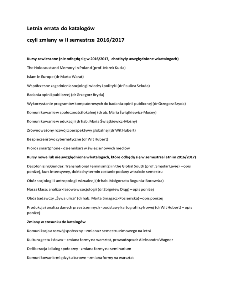 Errata kursów 2016/2017 - Instytut Socjologii UJ