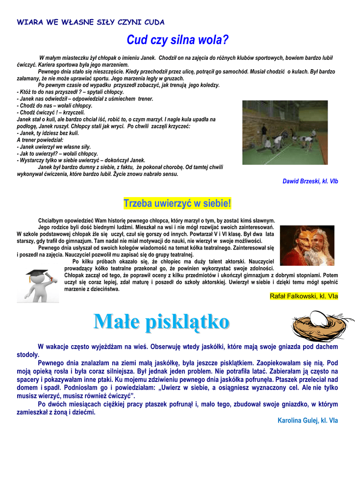 WIARA WE WŁASNE SIŁY CZYNI CUDA Cud czy silna wola? W małym miasteczku Ŝył chłopak o imieniu Janek. Chodził on na zajęcia do róŜnych klubów sportowych, bowiem bardzo lubił ćwiczyć. Kariera sportowa była jego marzeniem. Pewnego dnia stało się nieszczęście. Kiedy przechodził przez ulicę, potrącił go samochód. Musiał chodzić o kulach. Był bardzo załamany, Ŝe nie moŜe uprawiać sportu. Jego marzenia legły w gruzach. Po pewnym czasie od wypadku przyszedł zobaczyć, jak trenują jego koledzy. - KtóŜ to do nas przyszedł ? – spytali chłopcy. - Janek nas odwiedził – odpowiedział z uśmiechem trener. - Chodź do nas – wołali chłopcy. - Chodź ćwiczyć ! – krzyczeli. Janek stał o kuli, ale bardzo chciał iść, robić to, o czym marzył. I nagle kula upadła na podłogę, Janek ruszył. Chłopcy stali jak wryci. Po chwili zaczęli krzyczeć: - Janek, ty idziesz bez kuli. A trener powiedział: - Janek uwierzył we własne siły. - Jak to uwierzył? – wołali chłopcy. - Wystarczy tylko w siebie uwierzyć – dokończył Janek. Janek był bardzo dumny z siebie, z faktu, Ŝe pokonał chorobę. Od tamtej chwili wykonywał ćwiczenia, które bardzo lubił. śycie znowu nabrało sensu. Dawid Brzeski, kl. VIb Trzeba uwierzyć w siebie! Chciałbym opowiedzieć Wam historię pewnego chłopca, który marzył o tym, by zostać kimś sławnym. Jego rodzice byli dość biednymi ludźmi. Mieszkał na wsi i nie mógł rozwijać swoich zainteresowań. W szkole podstawowej chłopak źle się uczył, czuł się gorszy od innych. Powtarzał V i VI klasę. Był dwa lata starszy, gdy trafił do gimnazjum. Tam nadal nie miał motywacji do nauki, nie wierzył w swoje moŜliwości. Pewnego dnia usłyszał od swoich kolegów wiadomość na temat kółka teatralnego. Zainteresował się i poszedł na zajęcia. Nauczyciel pozwolił mu zapisać się do grupy teatralnej. Po kilku próbach okazało się, Ŝe chłopiec ma duŜy talent aktorski. Nauczyciel prowadzący kółko teatralne przekonał go, Ŝe powinien wykorzystać swoje zdolności. Chłopak zaczął od tego, Ŝe poprawił oceny z kilku przedmiotów i ukończył gimnazjum z dobrymi stopniami. Potem uczył się coraz lepiej, zdał maturę i poszedł do szkoły aktorskiej. Uwierzył w siebie i dzięki temu mógł spełnić marzenie z dzieciństwa. Rafał Falkowski, kl. VIa Małe pisklątko W wakacje często wyjeŜdŜam na wieś. Obserwuję wtedy jaskółki, które mają swoje gniazda pod dachem stodoły. Pewnego dnia znalazłam na ziemi małą jaskółkę, była jeszcze pisklątkiem. Zaopiekowałam się nią. Pod moją opieką rosła i była coraz silniejsza. Był jednak jeden problem. Nie potrafiła latać. Zabierałam ją często na spacery i pokazywałam inne ptaki. Ku mojemu zdziwieniu pewnego dnia jaskółka pofrunęła. Ptaszek przeleciał nad domem i spadł. Podniosłam go i powiedziałam: „Uwierz w siebie, a osiągniesz wyznaczony cel. Ale nie tylko musisz wierzyć, musisz równieŜ ćwiczyć”. Po dwóch miesiącach cięŜkiej pracy ptaszek pofrunął i, mało tego, zbudował swoje gniazdko, w którym zamieszkał z Ŝoną i dziećmi. Karolina Gulej, kl. VIa