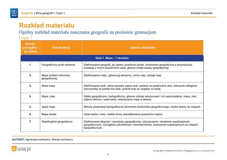 Geografia | Bliżej geografii | Część 1 Rozkład materiału Rozkład materiału Ogólny rozkład materiału nauczania geografii na poziomie gimnazjum Część 1 Numer porządko wy lekcji Zakres materiału Temat lekcji Dział 1. Mapa – 7 tematów 1. Geograficzny punkt widzenia Zdefiniowanie geografii, jej zakres, przedmiot badań, środowisko geograficzne a przyrodnicze, korelacje z innymi dziedzinami nauki, główne źródła wiedzy geograficznej. 2. Mapa źródłem informacji geograficznej Zdefiniowanie mapy, główne jej elementy, cechy map, rodzaje map. 3. Skala mapy Zdefiniowanie skali, różne sposoby zapisu skal, zadania na przeliczanie skal, obliczanie odległości rzeczywistej na podstawie skali, podział map ze względu na skalę. 4. Mapa i plan Siatka geograficzna i kartograficzna, główne rodzaje odwzorowań i ich wykorzystanie, mapa, plan, zdjęcie lotnicze i satelitarne, orientowanie mapy w terenie. 5. Język mapy Metody prezentacji kartograficznej elementów środowiska geograficznego, rzeźba terenu na mapach. 6. Mapa świata Układ lądów i mórz, wielkie formy ukształtowania powierzchni lądów. 7. Współrzędne geograficzne Zdefiniowanie długości i szerokości geograficznej, odczytywanie i określanie współrzędnych geograficznych, rozciągłość południkowa i równoleżnikowa, oznaczenie współrzędnych na mapach topograficznych. AUTORZY: Agnieszka Lechowicz, Maciej Lechowicz 1 Geografia | Bliżej geografii | Część 1 Numer porządko wy lekcji Rozkład materiału Zakres materiału Temat lekcji Dział 2. Kształt i ruchy Ziemi – 6 tematów 8. Ziemia we Wszechświecie Geocentryczny i heliocentryczny model budowy Wszechświata, budowa Układu Słonecznego. 9. Kształt i rozmiary Ziemi Poglądy na kształt Ziemi, dowody na jej kulistość, określenie kształtu, rozmiary Ziemi. 10. Ruch obrotowy Ziemi Omówienie ruchu obrotowego Ziemi, wymienienie następstw ruchu obrotowego Ziemi. 11. Rachuba czasu Czas słoneczny – zadania na obliczanie różnic czasu słonecznego, czas strefowy, czas urzędowy, linia zmiany daty. 12. Ruch obiegowy Ziemi Omówienie ruchu obiegowego Ziemi wokół Słońca, konsekwencje ruchu obiegowego, zmiany oświetlenia Ziemi w ciągu roku, wysokość Słońca nad horyzontem, kalendarz. 13. Strefy oświetlenia Ziemi Omówienie stref oświetlenia Ziemi, konsekwencje różnic w oświetleniu Ziemi. Dział 3. Sfery Ziemi – 8 tematów 14. Zróżnicowanie temperatury powietrza na Ziemi Budowa atmosfery, źródło ciepła na Ziemi, zróżnicowanie temperatury powietrza na Ziemi, obliczanie średniej dobowej temperatury powietrza i amplitudy temperatury. 15. Wiatr wieje i wieje... Zdefiniowanie pojęcia ciśnienia atmosferycznego, ogólne omówienie cyrkulacji powietrza na Ziemi, zróżnicowanie wiatrów na Ziemi, niebezpieczne wiatry na Ziemi. AUTORZY: Agnieszka Lechowicz, Maciej Lechowicz 2 Geografia | Bliżej geografii | Część 1 Numer porządko wy lekcji Rozkład materiału Zakres materiału Temat lekcji 16. Dlaczego pada? Proces tworzenia się chmur i powstawania opadów, zróżnicowanie wielkości opadów na świecie. 17. Pogoda i klimat Zdefiniowanie pogody i klimatu, ich głównych elementów, prognozowanie pogody. 18. Zróżnicowanie klimatyczne naszej planety Czynniki różnicujące klimaty na Ziemi, klimaty astrefowe, strefy klimatyczne, omawianie klimatu na podstawie klimatogramów (tworzenie i odczytywanie) – ćwiczenia. 19. Woda na Ziemi – hydrosfera Charakterystyka hydrosfery, obieg wody w przyrodzie, wody mórz i oceanów, ruchy wody morskiej. Charakterystyka lądowych elementów hydrosfery. 20. Co mamy pod nogami? Główne minerały skałotwórcze, ogólny podział skał, surowce mineralne wykorzystywane przez człowieka. 21. Litosfera Budowa wnętrza Ziemi, płyty litosfery, podział dziejów Ziemi, ruchy górotwórcze. Dział 4. Rzeźbiarze lądów – 4 tematy 22. Siły drzemiące we wnętrzu Ziemi Czynniki kształtujące powierzchnię Ziemi, podział czynników na endo- i egzogeniczne, wulkanizm, trzęsienia ziemi. 23. Rola wód w kształtowaniu krajobrazu Działalność erozyjna i akumulacyjna rzek. Niszcząca i budująca działalność fal morskich, typy wybrzeży AUTORZY: Agnieszka Lechowicz, Maciej Lechowicz 3 Geografia | Bliżej geografii | Część 1 Numer porządko wy lekcji Rozkład materiału Zakres materiału Temat lekcji 24. Wędrujące wydmy Działalność wiatru na pustyniach i wybrzeżach, rodzaje wydm. 25. Lodowce Zlodowacenia, formy polodowcowe na nizinach, rzeźba polodowcowa w górach. Część 2 Numer porządko wy lekcji Zakres materiału Temat lekcji Dział 1. Położenie i środowisko przyrodnicze Polski – 13 tematów 1. Położenie Polski Położenie Polski w świecie i Europie, obecne granice polityczne, podział administracyjny. 2. Przeszłość geologiczna Polski Zróżnicowanie geologiczne obszaru Polski na tle wielkich struktur geologicznych Europy. 3. Lądolód i polskie pojezierza Polodowcowe formy ukształtowania powierzchni w Polsce. 4. Od Bałtyku po szczyty Tatr Zróżnicowanie rzeźby kraju, pasowość, krainy geograficzne. 5. Bogactwo skał i minerałów Główne typy i występowanie skał budujących obszar Polski, złoża surowców mineralnych i ich wykorzystanie. 6. Klimat Polski Masy powietrza kształtujące klimat Polski, zmienność w ciągu roku. AUTORZY: Agnieszka Lechowicz, Maciej Lechowicz 4 Geografia | Bliżej geografii | Część 1 Numer porządko wy lekcji Rozkład materiału Zakres materiału Temat lekcji 7. Zróżnicowanie warunków klimatycznych w Polsce Zróżnicowanie regionalne – halny, bryza, cień opadowy. 8. O rzekach i jeziorach Główne rzeki, działy wód, dorzecza, zlewiska. 9. Głęboko ukryty skarb Występowanie wód podziemnych, obszary deficytu wody, wody mineralne – uzdrowiska, ochrona wód. 10. W „Raju” Zjawiska krasowe, obszary ich występowania, formy krasowe. 11. Tam, gdzie knieja szumi Szata roślinna Polski, lesistość, główne
