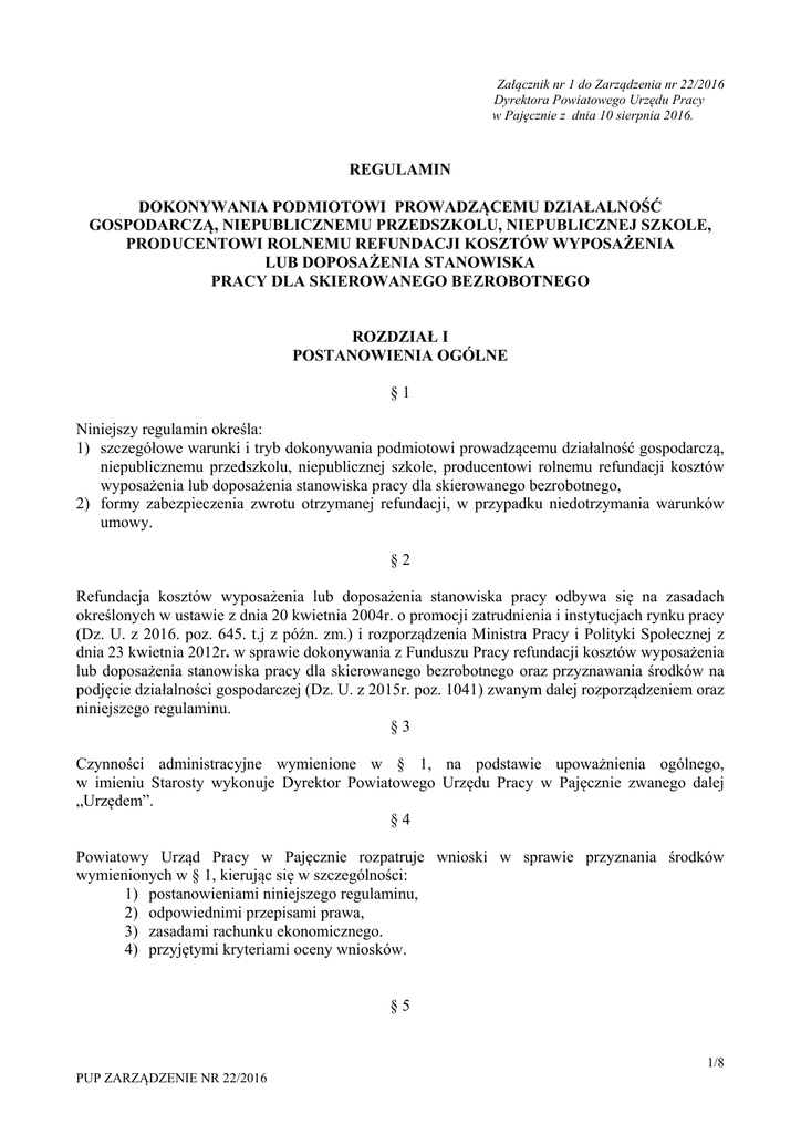Załącznik nr 1 do Zarządzenia nr 22/2016 Dyrektora Powiatowego Urzędu Pracy w Pajęcznie z dnia 10 sierpnia 2016. REGULAMIN DOKONYWANIA PODMIOTOWI PROWADZĄCEMU DZIAŁALNOŚĆ GOSPODARCZĄ, NIEPUBLICZNEMU PRZEDSZKOLU, NIEPUBLICZNEJ SZKOLE, PRODUCENTOWI ROLNEMU REFUNDACJI KOSZTÓW WYPOSAŻENIA LUB DOPOSAŻENIA STANOWISKA PRACY DLA SKIEROWANEGO BEZROBOTNEGO ROZDZIAŁ I POSTANOWIENIA OGÓLNE §1 Niniejszy regulamin określa: 1) szczegółowe warunki i tryb dokonywania podmiotowi prowadzącemu działalność gospodarczą, niepublicznemu przedszkolu, niepublicznej szkole, producentowi rolnemu refundacji kosztów wyposażenia lub doposażenia stanowiska pracy dla skierowanego bezrobotnego, 2) formy zabezpieczenia zwrotu otrzymanej refundacji, w przypadku niedotrzymania warunków umowy. §2 Refundacja kosztów wyposażenia lub doposażenia stanowiska pracy odbywa się na zasadach określonych w ustawie z dnia 20 kwietnia 2004r. o promocji zatrudnienia i instytucjach rynku pracy (Dz. U. z 2016. poz. 645. t.j z późn. zm.) i rozporządzenia Ministra Pracy i Polityki Społecznej z dnia 23 kwietnia 2012r. w sprawie dokonywania z Funduszu Pracy refundacji kosztów wyposażenia lub doposażenia stanowiska pracy dla skierowanego bezrobotnego oraz przyznawania środków na podjęcie działalności gospodarczej (Dz. U. z 2015r. poz. 1041) zwanym dalej rozporządzeniem oraz niniejszego regulaminu. §3 Czynności administracyjne wymienione w § 1, na podstawie upoważnienia ogólnego, w imieniu Starosty wykonuje Dyrektor Powiatowego Urzędu Pracy w Pajęcznie zwanego dalej „Urzędem”. §4 Powiatowy Urząd Pracy w Pajęcznie rozpatruje wnioski w sprawie przyznania środków wymienionych w § 1, kierując się w szczególności: 1) postanowieniami niniejszego regulaminu, 2) odpowiednimi przepisami prawa, 3) zasadami rachunku ekonomicznego. 4) przyjętymi kryteriami oceny wniosków. §5 1/8 PUP ZARZĄDZENIE NR 22/2016 Przyznanie środków wymienionych w § 1 oraz ich wysokość jest uzależniona od posiadanych przez Powiatowy Urząd Pracy w Pajęcznie środków finansowych przeznaczonych na ten cel. ROZDZIAŁ II WARUNKI I TRYB REFUNDACJI KOSZTÓW WYPOSAŻENIA LUB DOPOSAŻENIA STANOWISKA PRACY DLA SKIEROWANEGO BEZROBOTNEGO §6 1. Wnioski o przyznanie środków, o których mowa w § 1 opiniowane są przez Komisję ds. rozpatrywania wniosków o refundację kosztów wyposażenia lub doposażenia stanowiska pracy dla skierowanego bezrobotnego powołaną przez Dyrektora Powiatowego Urzędu Pracy w Pajęcznie. 2. Komisja, o której mowa w ust. 1, w zależności od potrzeb, może ustalić dodatkowe kryteria oceny wniosków. 3. Wnioski zaopiniowane przez komisję, o której mowa w ust. 1 są rozpatrywane przez Dyrektora Urzędu. §7 1. O refundację kosztów wyposażenia bądź doposażenia stanowiska pracy może wystąpić: a) podmiot prowadzący działalność gospodarczą zwany dalej podmiotem, b) niepubliczne przedszkole zwane dalej przedszkolem, c) niepubliczna szkoła zwana dalej szkołą, prowadzące działalność przez okres co najmniej 6 miesięcy i zamierzające wyposażyć bądź doposażyć stanowisko pracy dla skierowanego bezrobotnego, d) producent rolny będący posiadaczem gospodarstwa rolnego bądź prowadzący dział specjalny produkcji rolnej i zatrudniający przez okres ostatnich 6 m-cy w każdym miesiącu przynajmniej 1 pracownika w pełnym wymiarze czasu pracy. 2. W przypadku podmiotu prowadzącego działalność gospodarczą, która została utworzona w wyniku przyznania jednorazowych środków na podjęcie działalności gospodarczej, o refundację kosztów utworzenia stanowiska pracy, można ubiegać się po rozliczeniu się z umowy o przyznanie środków tj. po upływie co najmniej 12 miesięcy od dnia rozpoczęcia działalności gospodarczej. §8 Podmiot, szkoła, przedszkole lub producent rolny zamierzający wyposażyć lub doposażyć stanowisko pracy dla skierowanego bezrobotnego może złożyć do Powiatowego Urzędu Pracy właściwego ze względu na siedzibę tego podmiotu, szkoły, przedszkola lub producenta rolnego albo ze względu na miejsce wykonywania pracy przez skierowanego bezrobotnego wniosek o refundację ze środków Funduszu Pracy kosztów wyposażenia lub doposażenia stanowiska pracy zawierający: 1) oznaczenie wnioskodawcy, w tym: a) b) c) d) nazwę lub imię i nazwisko, w przypadku osoby fizycznej, adres siedziby albo adres miejsca zamieszkania, numer PESEL, w przypadku osoby fizycznej, numer identyfikacyjny w krajowym rejestrze urzędowym podmiotów gospodarki narodowej REGON /jeżeli został nadany/, e) numer identyfikacji podatkowej NIP, 2/8 PUP ZARZĄDZENIE NR 22/2016 2) 3) 4) 5) 6) 7) 8) 9) f) datę rozpoczęcia prowadzenia działalności, g) symbol podklasy rodzaju prowadzonej działalności określony zgodnie z Polską Klasyfikacją Działalności (PKD), h) oznaczenie formy prawnej prowadzonej działalności; liczbę wyposażanych lub doposażanych stanowisk pracy dla skierowanych bezrobotnych; kalkulację wydatków na wyposażenie lub doposażenie dla poszczególnych stanowisk pracy i źródła ich finansowania; wnioskowaną kwotę refundacji; szczegółową specyfikację wydatków dotyczących wyposażenia lub doposażenia stanowiska pracy, w szczególności na zakup środków trwałych, urządzeń, maszyn, w tym środków niezbędnych do zapewnienia zgodności stanowiska pracy z przepisami bezpieczeństwa i higieny pracy oraz wymaganiami ergonomii; rodzaj pracy, jaka będzie wykonywana przez skierowanego bezrobotnego; wymagane kwalifikacje, umiejętności i doświadczenie zawodowe niezbędne do wykonywania pracy, jakie powinien posiadać skierowany bezrobotny, określone w przepisach wydanych na podstawie art. 35 ust. 5 ustawy o promocji zatrudnienia i instytucjach rynku pracy; proponowaną formę zabezpieczenia zwrotu refundacji, o której mowa w § 19 ust.2; podpis osoby uprawnionej do reprezentowania podmiotu, przedszkola, szkoły lub producenta r