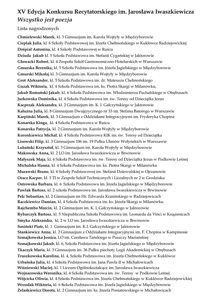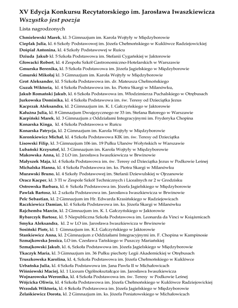 XV Edycja Konkursu Recytatorskiego im. Jarosława Iwaszkiewicza Wszystko jest poezja Lista nagrodzonych Chmielewski Marek, kl. 3 Gimnazjum im. Karola Wojtyły w Międzyborowie Cieplak Julia, kl. 6 Szkoły Podstawowej im. Józefa Chełmońskiego w Kuklówce Radziejowickiej Dośpiał Antonina, kl. 4 Szkoły Podstawowej w Ruścu Dziuda Jakub kl. 5 Szkoła Podstawowa im. Stefanii Cygańskiej w Jaktorowie Głowacki Robert, kl. 4 Zespołu Szkół Gastronomiczno-Hotelarskich w Warszawie Gmurska Berenika, kl. 5 Szkoła Podstawowa im. Józefa Jagielskiego w Międzyborowie Gmurski Mikołaj kl. 3 Gimnazjum im. Karola Wojtyły w Międzyborowie Grot Aleksander, kl. 5 Szkoła Podstawowa im. dr. Mateusza Chełmońskiego Guzak Wiktoria, kl. 4 Szkoła Podstawowa im. ks. Piotra Skargi w Milanówku, Jakub Romański Jakub, kl. 6 Szkoła Podstawowa im. Włodzimierza Puchalskiego w Otrębusach Jurkowska Dominika, kl. 4 Szkoła Podstawowa im. św. Teresy od Dzieciątka Jezus Kacprzak Aleksandra, kl. 2 Gimnazjum im. K. I. Gałczyńskiego w Jaktorowie Kałużna Julia, kl. 8 Gimnazjum Dwujęzycznego nr 33 im. Stefana Batorego w Warszawie Karpiński Marek, kl. 3 Gimnazjum z Oddziałami Integracyjnymi im. Fryderyka Chopina Konarska Kinga, kl. 4 Szkoła Podstawowa w Ruścu Konarska Patrycja, kl. 2 Gimnazjum im. Karola Wojtyły w Międzyborowie Koronkiewicz Michał, kl. 4 Szkoła Podstawowa KIK im. św. Teresy od Dzieciątka Lisowski Filip, kl. 3 Gimnazjum 106 im. 19 Pułku Ułanów Wołyńskich w Warszawie Lubański Krzysztof, kl. 3 Gimnazjum im. Karola Wojtyły w Międzyborowie Makowska Anna, kl. 2 LO im. Jarosława Iwaszkiewicza w Brwinowie Małyszek Maja, kl. 4 Szkoła Podstawowa im. św. Teresy od Dzieciątka Jezus w Podkowie Leśnej Michalska Hanna, kl. 4 Szkoła Podstawowa im. ks. Piotra Skargi w Milanówku Murawski Bruno, kl. 4 Szkoły Podstawowej im. Stefanii Dziewulskiej w Ojrzanowie Oracz Kacper, kl. 3 TI w Zespole Szkół Technicznych i Licealnych nr 2 w Grodzisku Ostrowska Barbara, kl. 6 Szkoła Podstawowa im. Józefa Jagielskiego w Międzyborowie Pawlak Bartosz, kl. 2 szkoła Podstawowa im. Jarosława Iwaszkiewicza w Brwinowie Pelc Sebastian, kl. 2 Gimnazjum im Hr. Edwarda Krasińskiego w Radziejowicach Raczkiewicz Damian, kl. 4 Szkoła Podstawowa im. ks. Józefa Skargi w Milanówku Rajchemba Marcin, kl. 2 Gimnazjum im. K. I. Gałczyńskiego w Jaktorowie Rybarczyk Bartosz, kl. 5 Niepubliczna Szkoła Podstawowa im. Leonarda da Vinci w Książenicach Smyka Aleksandra, kl. 2 w LO im. Jarosława Iwaszkiewicza w Brwinowie Sosiński Piotr, kl. 1 Gimnazjum im. K.I. Gałczyńskiego w Jaktorowie Stankiewicz Anna, kl. 2 Gimnazjum z Oddziałami Integracyjnymi im. F. Chopina w Kampinosie Szmajkowska Jessica, LO im. Czesława Tańskiego w Puszczy Mariańskiej Szmajkowski Jakub, kl. 6, Szkoła Podstawowa im. Józefa Jagielskiego w Międzyborowie Tkaczyk Maria, kl. 3 Gimnazjum im. 36 Pułku piechoty Legii Akademickiej w Otrębusach Truszkowska Karolina, kl. 4, Szkoła Podstawowa im. Józefa Chełmońskiego w Kuklówce Urbańska Julia, kl. 4 Szkoła Podstawowa im. Jana Pawła II w Michałowicach Wiśniewski Maciej, kl. 1 Liceum Ogólnokształcące im. Jarosława Iwaszkiewicza Wojnarowska Weronika, kl. 4 Szkoła Podstawowa im. św. Teresy w Podkowie Leśnej Wójcicka Oliwia, kl. 4 Szkoła Podstawowa im. Józefa Chełmońskiego w Kuklówce Radziejowickiej Wrzodak Wiktoria, kl. 6 Szkoła Podstawowa im. Józefa Jagielskiego w Międzyborowie Żelaśkiewicz Dorota, kl. 2 Gimnazjum im. ks. Józefa Poniatowskiego w Michałowicach