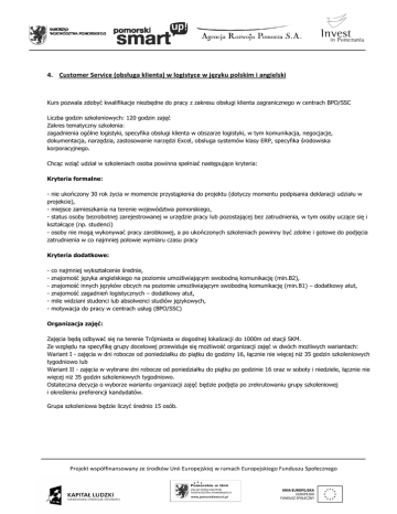 4. Customer Service (obsługa klienta) w logistyce w języku polskim i angielski Kurs pozwala zdobyć kwalifikacje niezbędne do pracy z zakresu obsługi klienta zagranicznego w centrach BPO/SSC Liczba godzin szkoleniowych: 120 godzin zajęć Zakres tematyczny szkolenia: zagadnienia ogólne logistyki, specyfika obsługi klienta w obszarze logistyki, w tym komunikacja, negocjacje, dokumentacja, narzędzia, zastosowanie narzędzi Excel, obsługa systemów klasy ERP, specyfika środowiska korporacyjnego. Chcąc wziąć udział w szkoleniach osoba powinna spełniać następujące kryteria: Kryteria formalne: - nie ukończony 30 rok Ŝycia w momencie przystąpienia do projektu (dotyczy momentu podpisania deklaracji udziału w projekcie), - miejsce zamieszkania na terenie województwa pomorskiego, - status osoby bezrobotnej zarejestrowanej w urzędzie pracy lub pozostającej bez zatrudnienia, w tym osoby uczące się i kształcące (np. studenci) - osoby nie mogą wykonywać pracy zarobkowej, a po ukończonych szkoleniach powinny być zdolne i gotowe do podjęcia zatrudnienia w co najmniej połowie wymiaru czasu pracy Kryteria dodatkowe: - co najmniej wykształcenie średnie, znajomość języka angielskiego na poziomie umoŜliwiającym swobodną komunikację (min.B2), znajomość innych języków obcych na poziomie umoŜliwiającym swobodną komunikację (min.B1) – dodatkowy atut, znajomość zagadnień logistycznych – dodatkowy atut, mile widziani studenci lub absolwenci studiów językowych, motywacja do pracy w centrach usług (BPO/SSC) Organizacja zajęć: Zajęcia będą odbywać się na terenie Trójmiasta w dogodnej lokalizacji do 1000m od stacji SKM. Ze względu na specyfikę grupy docelowej przewiduje się moŜliwość organizacji zajęć w dwóch moŜliwych wariantach: Wariant I - zajęcia w dni robocze od poniedziałku do piątku do godziny 16, łącznie nie więcej niŜ 35 godzin szkoleniowych tygodniowo lub Wariant II - zajęcia w wybrane dni robocze od poniedziałku do piątku po godzinie 16 oraz w soboty i niedziele, łącznie nie więcej niŜ 35 godzin szkoleniowych tygodniowo. Ostateczna decyzja o wyborze wariantu organizacji zajęć będzie podjęta po zrekrutowaniu grupy szkoleniowej i określeniu preferencji kandydatów. Grupa szkoleniowa będzie liczyć średnio 15 osób. Projekt współfinansowany ze środków Unii Europejskiej w ramach Europejskiego Funduszu Społecznego