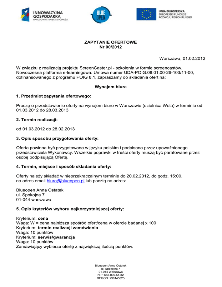 ZAPYTANIE OFERTOWE Nr 00/2012 Warszawa, 01.02.2012 W związku z realizacją projektu ScreenCaster.pl - szkolenia w formie screencastów. Nowoczesna platforma e-learningowa. Umowa numer UDA-POIG.08.01.00-26-103/11-00, dofinansowanego z programu POIG 8.1, zapraszamy do składania ofert na: Wynajem biura 1. Przedmiot zapytania ofertowego: Proszę o przedstawienie oferty na wynajem biuro w Warszawie (dzielnica Wola) w terminie od 01.03.2012 do 28.03.2013 2. Termin realizacji: od 01.03.2012 do 28.02.2013 3. Opis sposobu przygotowania oferty: Oferta powinna być przygotowana w języku polskim i podpisana przez upoważnionego przedstawiciela Wykonawcy. Wszelkie poprawki w treści oferty muszą być parafowane przez osobę podpisującą Ofertę. 4. Termin, miejsce i sposób składania oferty: Oferty należy składać w nieprzekraczalnym terminie do 20.02.2012, do godz. 15:00. na adres email [email protected] lub pocztą na adres: Blueopen Anna Ostatek ul. Spokojna 7 01-044 warszawa 5. Opis kryteriów wyboru najkorzystniejszej oferty: Kryterium: cena Waga: W = cena najniższa spośród ofert/cena w ofercie badanej x 100 Kryterium: termin realizacji zamówienia Waga: 10 punktów Kryterium: serwis/gwarancja Waga: 10 punktów Zamawiający wybierze ofertę z największą ilością punktów. Blueopen Anna Ostatek ul. Spokojna 7 01-044 Warszawa NIP: 658-000-54-82 REGON: 290145825