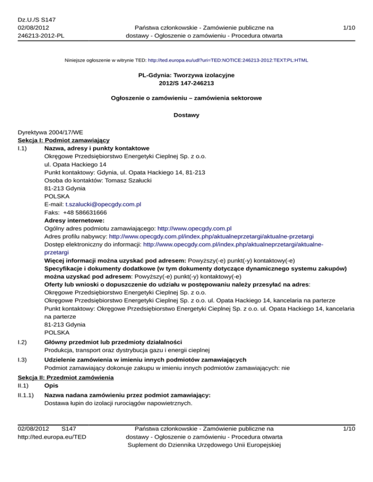 Dz.U./S S147 02/08/2012 246213-2012-PL Państwa członkowskie - Zamówienie publiczne na dostawy - Ogłoszenie o zamówieniu - Procedura otwarta 1/10 Niniejsze ogłoszenie w witrynie TED: http://ted.europa.eu/udl?uri=TED:NOTICE:246213-2012:TEXT:PL:HTML PL-Gdynia: Tworzywa izolacyjne 2012/S 147-246213 Ogłoszenie o zamówieniu – zamówienia sektorowe Dostawy Dyrektywa 2004/17/WE Sekcja I: Podmiot zamawiający I.1) Nazwa, adresy i punkty kontaktowe Okręgowe Przedsiębiorstwo Energetyki Cieplnej Sp. z o.o. ul. Opata Hackiego 14 Punkt kontaktowy: Gdynia, ul. Opata Hackiego 14, 81-213 Osoba do kontaktów: Tomasz Szałucki 81-213 Gdynia POLSKA E-mail: [email protected] Faks: +48 586631666 Adresy internetowe: Ogólny adres podmiotu zamawiającego: http://www.opecgdy.com.pl Adres profilu nabywcy: http://www.opecgdy.com.pl/index.php/aktualneprzetargi/aktualne-przetargi Dostęp elektroniczny do informacji: http://www.opecgdy.com.pl/index.php/aktualneprzetargi/aktualneprzetargi Więcej informacji można uzyskać pod adresem: Powyższy(-e) punkt(-y) kontaktowy(-e) Specyfikacje i dokumenty dodatkowe (w tym dokumenty dotyczące dynamicznego systemu zakupów) można uzyskać pod adresem: Powyższy(-e) punkt(-y) kontaktowy(-e) Oferty lub wnioski o dopuszczenie do udziału w postępowaniu należy przesyłać na adres: Okręgowe Przedsiębiorstwo Energetyki Cieplnej Sp. z o.o. Okręgowe Przedsiębiorstwo Energetyki Cieplnej Sp. z o.o. ul. Opata Hackiego 14, kancelaria na parterze Punkt kontaktowy: Okręgowe Przedsiębiorstwo Energetyki Cieplnej Sp. z o.o. ul. Opata Hackiego 14, kancelaria na parterze 81-213 Gdynia POLSKA I.2) Główny przedmiot lub przedmioty działalności Produkcja, transport oraz dystrybucja gazu i energii cieplnej I.3) Udzielenie zamówienia w imieniu innych podmiotów zamawiających Podmiot zamawiający dokonuje zakupu w imieniu innych podmiotów zamawiających: nie Sekcja II: Przedmiot zamówienia II.1) Opis II.1.1) Nazwa nadana zamówieniu przez podmiot zamawiający: Dostawa łupin do izolacji rurociągów napowietrznych. 02/08/2012 S147 http://ted.europa.eu/TED Państwa członkowskie - Zamówienie publiczne na dostawy - Ogłoszenie o zamówieniu - Procedura otwarta Suplement do Dziennika Urzędowego Unii Europejskiej 1/10 Dz.U./S S147 02/08/2012 246213-2012-PL Państwa członkowskie - Zamówienie publiczne na dostawy - Ogłoszenie o zamówieniu - Procedura otwarta 2/10 II.1.2) Rodzaj zamówienia oraz lokalizacja robót budowlanych, miejsce realizacji dostawy lub świadczenia usług Dostawy Główne miejsce lub lokalizacja robót budowlanych, miejsce realizacji dostawy lub świadczenia usług: miasta Gdynia i Rumia. Kod NUTS PL633 II.1.3) Informacje na temat zamówienia publicznego, umowy ramowej lub dynamicznego systemu zakupów (DSZ) Ogłoszenie dotyczy zamówienia publicznego II.1.4) Informacje na temat umowy ramowej II.1.5) Krótki opis zamówienia lub zakupu: Przedmiotem zamówienia są sukcesywne dostawy łupin do izolacji rurociągów napowietrznych. Opis przedmiotu zamówienia zawarty został w załączniku nr 1 do siwz. Wykonawca zobowiązany jest do przeprowadzenia szkolenia dotyczącego montażu elementów izolacji rurociągów napowietrznych w terminie do 2 miesięcy od daty podpisania umowy. Szkolenie obejmie grupę 20 osób, winno trwać 1 dzień (maksymalnie 8 godzin) i odbywać się w jednym z obiektów zamawiającego. Wymagania techniczne dla materiałów systemu izolacji rur napowietrznych zawarte zostały w załączniku nr 8 do siwz. Realizacja dostaw będących przedmiotem zamówienia nastąpi sukcesywnie wg potrzeb zamawiającego i poprzedzona zostanie przesłaniem pisemnego zamówienia przekazanego na faks Wykonawcy. Zamawiający zobowiązuje się do miesięcznego poziomu zamówień nie przekraczającego 2 000 metrów, przy czym dopuszcza się możliwość zwiększenia zamówienia do 15 % w skali miesiąca, w uzasadnionych przypadkach. Wskazane w dokumentacji przetargowej kąty kolan są wartościami orientacyjnymi. Wykonawca zobowiązany jest do każdorazowego przyjazdu na miejsce budowy (obszar miast Gdyni i Rumi) celem pomiaru odkrytych kolan (średnio 5 razy w miesiącu). Termin realizacji zamówienia: a) w przypadku odcinków prostych - do 14 dni kalendarzowych od daty wysłania pisemnego zamówienia; b) w przypadku kolan – do 5 dni kalendarzowych od daty wysłania pisemnego zamówienia na przyjazd Wykonawcy na miejsce budowy (obszar miast Gdynia i Rumi) celem pomiaru odkrytych kolan + do 14 dni kalendarzowych od daty dokonania pomiaru na dostarczenie zamówionego asortymentu. Dostawy winny być realizowane w dni powszednie (od poniedziałku do piątku) w godzinach 7:15 - 9:00. Miejsce dostawy przedmiotu zamówienia: obszar realizacji Projektu tj. miasta Gdynia oraz Rumia. Do każdej partii dostawy wyrobu Wykonawca winien dostarczyć: a) oświadczenie producenta stwierdzające, na jego wyłączna odpowiedzialność, że wyrób budowlany jest zgodny z Polską Normą wyrobu lub aprobatą techniczną/dokumentem równoważnym; b) dokument (np. świadectwo, raport, certyfikat) z kontroli jakości przeprowadzonej przez producenta przedmiotu zamówienia. Okres gwarancji na przedmiot zamówienia – 60 miesięcy od daty dostarczenia przedmiotu zamówienia. Warunki gwarancji na przedmiot zamówienia zawarte zostały w załączniku nr 1 do Istotnych dla stron postanowień, które zostaną wprowadzone do treści zawieranej umowy (załącznik nr 5 do siwz). Występujące w dokumentacji przetargowej określenia odwołujące się bezpośrednio do nazw własnych, norm, aprobat, specyfikacji technicznych i systemów odniesienia służą określeniu cech technicznych i jakościowych. Zamawiający dopuszcza rozwiązania równoważne z opisywanymi. Wykonawca powołujący się na rozwiązania 02/08/2012 S147 http://ted.europa.eu/TED Państwa członkowskie - Zamówienie publiczne na dostawy - Ogłoszenie o zamówieniu - Procedura otwarta Suplement do Dziennika Urzędoweg