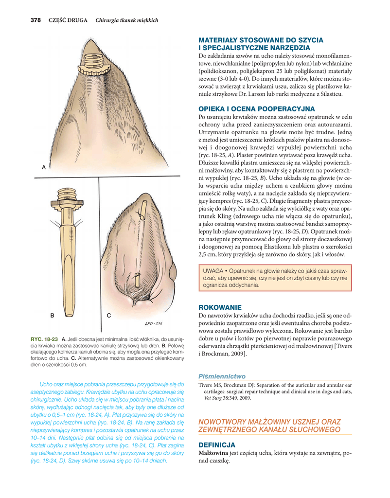 378 CZĘŚĆ DRUGA Chirurgia tkanek miękkich MATERIAŁY STOSOWANE DO SZYCIA I SPECJALISTYCZNE NARZĘDZIA Do zakładania szwów na ucho należy stosować monofilamentowe, niewchłanialne (polipropylen lub nylon) lub wchłanialne (polidioksanon, poliglekapron 25 lub poliglikonat) materiały szewne (3-0 lub 4-0). Do innych materiałów, które można stosować u zwierząt z krwiakami uszu, zalicza się plastikowe kaniule strzykowe Dr. Larson lub rurki medyczne z Silasticu. OPIEKA I OCENA POOPERACYJNA Po usunięciu krwiaków można zastosować opatrunek w celu ochrony ucha przed zanieczyszczeniem oraz autourazami. Utrzymanie opatrunku na głowie może być trudne. Jedną z metod jest umieszczenie krótkich pasków plastra na donosowej i doogonowej krawędzi wypukłej powierzchni ucha (ryc. 18-25, A). Plaster powinien wystawać poza krawędź ucha. Dłuższe kawałki plastra umieszcza się na wklęsłej powierzchni małżowiny, aby kontaktowały się z plastrem na powierzchni wypukłej (ryc. 18-25, B). Ucho układa się na głowie (w celu wsparcia ucha między uchem a czubkiem głowy można umieścić rolkę waty), a na nacięcie zakłada się nieprzywierający kompres (ryc. 18-25, C). Długie fragmenty plastra przyczepia się do skóry. Na ucho zakłada się wyściółkę z waty oraz opatrunek Kling (zdrowego ucha nie włącza się do opatrunku), a jako ostatnią warstwę można zastosować bandaż samoprzylepny lub rękaw opatrunkowy (ryc. 18-25, D). Opatrunek można następnie przymocować do głowy od strony doczaszkowej i doogonowej za pomocą Elastikonu lub plastra o szerokości 2,5 cm, który przykleja się zarówno do skóry, jak i włosów. A UWAGA • Opatrunek na głowie należy co jakiś czas sprawdzać, aby upewnić się, czy nie jest on zbyt ciasny lub czy nie ogranicza oddychania. B C RYC. 18-23 A. Jeśli obecna jest minimalna ilość włóknika, do usunięcia krwiaka można zastosować kaniulę strzykową lub dren. B. Połowę okalającego kołnierza kaniuli obcina się, aby mogła ona przylegać komfortowo do ucha. C. Alternatywnie można zastosować okienkowany dren o szerokości 0,5 cm. ROKOWANIE Do nawrotów krwiaków ucha dochodzi rzadko, jeśli są one odpowiednio zaopatrzone oraz jeśli ewentualna choroba podstawowa została prawidłowo wyleczona. Rokowanie jest bardzo dobre u psów i kotów po pierwotnej naprawie pourazowego oderwania chrząstki pierścieniowej od małżowinowej [Tivers i Brockman, 2009]. Piśmiennictwo Ucho oraz miejsce pobrania przeszczepu przygotowuje się do aseptycznego zabiegu. Krawędzie ubytku na uchu opracowuje się chirurgicznie. Ucho układa się w miejscu pobrania płata i nacina skórę, wydłużając odnogi nacięcia tak, aby były one dłuższe od ubytku o 0,5–1 cm (ryc. 18-24, A). Płat przyszywa się do skóry na wypukłej powierzchni ucha (ryc. 18-24, B). Na ranę zakłada się nieprzywierający kompres i pozostawia opatrunek na uchu przez 10–14 dni. Następnie płat odcina się od miejsca pobrania na kształt ubytku z wklęsłej strony ucha (ryc. 18-24, C). Płat zagina się delikatnie ponad brzegiem ucha i przyszywa się go do skóry (ryc. 18-24, D). Szwy skórne usuwa się po 10–14 dniach. Tivers MS, Brockman DJ: Separation of the auricular and annular ear cartilages: surgical repair technique and clinical use in dogs and cats, Vet Surg 38:349, 2009. NOWOTWORY MAŁŻOWINY USZNEJ ORAZ ZEWNĘTRZNEGO KANAŁU SŁUCHOWEGO DEFINICJA Małżowina jest częścią ucha, która wystaje na zewnątrz, ponad czaszkę.