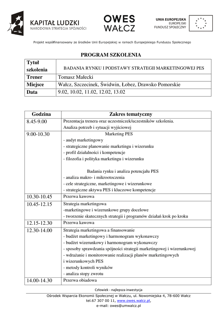PROGRAM SZKOLENIA Tytuł szkolenia Trener Miejsce Data Godzina 8.45-9.00 9.00-10.30 10.30-10.45 10.45-12.15 12.15-12.30 12.30-14.00 14.00-14.30 BADANIA RYNKU I PODSTAWY STRATEGII MARKETINGOWEJ PES Tomasz Małecki Wałcz, Szczecinek, Świdwin, Łobez, Drawsko Pomorskie 9.02, 10.02, 11.02, 12.02, 13.02 Zakres tematyczny Prezentacja trenera oraz uczestniczek/uczestników szkolenia. Analiza potrzeb i sytuacji wyjściowej Marketing PES - audyt marketingowy - strategiczne planowanie marketingu i wizerunku - profil działalności i kompetencje - filozofia i polityka marketingu i wizerunku Badania rynku i analiza potencjału PES - analiza makro- i mikrootoczenia - cele strategiczne, marketingowe i wizerunkowe - strategiczne aktywa PES i kluczowe kompetencje Przerwa kawowa Strategia marketingowa -marketingowe i wizerunkowe grupy docelowe - tworzenie skutecznych strategii i programów działań krok po kroku Przerwa kawowa Strategia marketingowa a finansowanie - budżet marketingowy i harmonogram wykonawczy - budżet wizerunkowy i harmonogram wykonawczy - sposoby sprawdzania spójności strategii marketingowej i wizerunkowej - wdrażanie i monitorowanie realizacji planów marketingowych i wizerunkowych PES - metody kontroli wyników - analiza stopy zwrotu Przerwa obiadowa Człowiek - najlepsza inwestycja Ośrodek Wsparcia Ekonomii Społecznej w Wałczu, ul. Nowomiejska 4, 78-600 Wałcz tel.67 307 00 11, www.owes.walcz.pl, e-mail: [email protected] 14.30-16.00 16.00-16.15 E-marketing w działaniach PES - kampanie reklamowe w sieci - weryfikacja skuteczności kampanii marketingowej - programy partnerskie, tzw. affiliate marketing - email marketing- zalety i wady (zagrożenia) - marketing wirusowy, viral marketing- wady i zalety - media społecznościowe i ich rola marketingowa PES - etyka w Internecie Podsumowanie zdobytej wiedzy. Wypełnienie ankiety ewaluacyjnej. Człowiek - najlepsza inwestycja Ośrodek Wsparcia Ekonomii Społecznej w Wałczu, ul. Nowomiejska 4, 78-600 Wałcz tel.67 307 00 11, www.owes.walcz.pl, e-mail: [email protected]
