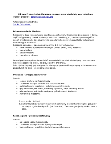 Zdrowy Przedszkolak. Kampania na rzecz naturalnej diety w przedszkolu więcej o projekcie: zdrowyprzedszkolak.org Autor: Katarzyna Rudnicka Sztuka Odżywiania Zdrowe śniadania dla dzieci Śniadanie to baza i energetyczna podstawa na cały dzień. Część dzieci je śniadanie w domu, część swój pierwszy posiłek zjada w przedszkolu. Pisaliśmy już, co dzieci powinny jeść w swoich przedszkolach, dziś skupimy się na podaniu konkretnych przykładów naturalnych i wzmacniających śniadań. Śniadania gotowane – zalecane przynajmniej 2-3 razy w tygodniu: ● zupa zbożowa z płatków naturalnych (owies, orkisz, żyto, pszenica) ● kasza jaglana ● kasza orkiszowa ● kasza kukurydziana. Do dań podstawowych możemy dodać różne dodatki, w zależności od pory roku: suszone lub świeże sezonowe owoce, bakalie, orzechy, przyprawy. Dzieci jedzą chętniej, gdy mają wybór, dlatego przygotowaliśmy przepisy podstawowe oraz poczęstunek na stole - do wyboru przez dzieci. Owsianka – przepis podstawowy Zasady: ● 1 część płatków na 2 części wody ● 1 szklanka suchych płatków to 4 porcje dziecięce ● płatki zalewamy wrzątkiem i gotujemy na małym ogniu ● gdy na dworze jest zimno, dodajemy cynamon, anyż, odrobinę imbiru ● gdy na dworze jest ciepło, dodajemy goździki, anyż, kardamon ● płatków nie mieszamy. Proporcje dla 10 dzieci: 2,5 szklanki płatków owsianych zwykłych zalewamy 5 szklankami wrzątku, gotujemy na małym ogniu do miękkości (ok. 20 minut). Tak samo gotuje się płatki z innych zbóż. Kasza jaglana - przepis podstawowy Zasady: ● na 1 część kaszy 3 części wody ● 1 szklanka suchej kaszy to 6 porcji dziecięcych ● kaszę zalewamy wrzątkiem i gotujemy na małym ogniu ● ● ● gdy na dworze jest zimno, dodajemy cynamon, anyż, odrobinę imbiru gdy na dworze jest ciepło, dodajemy goździki, anyż, kardamon, kurkumę kaszy nie mieszamy. Proporcje dla 10 dzieci: 2 szklanki kaszy zalewamy 6 szklankami wrzątku, gotujemy na małym ogniu do miękkości (ok. 20 minut). Kasza orkiszowa - przepis podstawowy Zasady: ● na 1 część kaszy 3 części wody ● 1 szklanka suchej kaszy to 6 porcji dziecięcych ● kaszę zalewamy wrzątkiem i gotujemy na małym ogniu ● gdy na dworze jest zimno, dodajemy cynamon, anyż, odrobinę imbiru ● gdy na dworze jest ciepło, dodajemy goździki, anyż, kardamon, kurkumę ● kaszy nie mieszamy. Proporcje dla 10 dzieci: 2 szklanki kaszy zalewamy 6 szklankami wrzątku, gotujemy na małym ogniu do miękkości (ok. 20 minut). Kasza kukurydziana - przepis podstawowy Zasady: ● na 1 część kaszy 2 części wody ● 1 szklanka suchej kaszy to 5 porcji dziecięcych ● kaszę rozprowadzamy w części wody (zimnej) i wlewamy do wrzątku ● gotujemy na małym ogniu, mieszając ● gdy na dworze jest zimno, dodajemy cynamon, anyż, odrobinę imbiru lub gałki muszkatałowej ● gdy na dworze jest ciepło, dodajemy goździki, anyż, kardamon lub kurkumę. Proporcje dla 10 dzieci: 2 szklanki kaszy zalewamy 4 szklankami wrzątku, gotujemy na małym ogniu do miękkości (ok. 20 minut). Do gotowanych zbóż (z przepisów podstawowych) na stole w małych miseczkach do wyboru dzieci: ● masło, miód, niskosłodzona marmolada porzeczkowa, powidła śliwkowe ● ● ● ● masło, prażone wiórki kokosowe, prażone płatki migdałowe, prażony sezam masło, miód, rodzynki, pokrojone jabłka, pokrojone gruszki (gdy na dworze jest zimno, rodzynki i owoce powinny być gotowane z kaszą lub płatkami) odcedzone owoce z ugotowanego kompotu: suszone morele, śliwki, rodzynki, daktyle, figi, jabłka, gruszki; czysty kompot podany do picia (http:// dziecisawazne.pl/kompot-tradycyjny-zdrowy-napoj/) rozdrobnione orzechy włoskie, laskowe, nerkowca Dzięki dodatkom postawionym na stole dzieci same komponują sobie posiłek, jest to również alternatywa dla tych dzieci, które mają alergię na określony składnik (np. orzechy włoskie). Każdego dnia mogą pojawiać się inne zestawy, dzięki czemu posiłki będą urozmaicone, a dzieci będą miały okazję spróbować smaku pojedynczych składników i sprawdzać, czy im smakuje, czy też nie. Dzieci powinny jeść również dobrej jakości pieczywo, najlepiej chleb razowy na zakwasie, chleb razowy z ziarenkami, bułki pełnoziarniste. Pytanie – z czym? Z masłem, to na pewno. A co zamiast szynki i sera? Świetnie sprawdzają się różnorakie pasty. Oprócz znanych wszystkim past z ryby wędzonej, jajek czy twarogu, istnieje wiele past zbożowowarzywnych, które stanowią doskonałe urozmaicenie dziecięcego jadłospisu. To również alternatywa dla dzieci wegetariańkich. Pasty są zdrowe – są też tanie! Pomarańczowa pasta z kaszy jaglanej i marchwi przepis na 10 porcji: Szklankę ugotowanej kaszy jaglanej (najlepiej ciepłej, ale niekoniecznie) zmiksować ze szklanką ugotowanej marchwi, dodać szczyptę kardamonu, soli i parę kropli cytryny. Jeśli jest zbyt gęste, dodać odrobinę wrzątku. Ta pasta obniża chęć na słodycze. Zielona pasta brokułowa przepis na 10 porcji: Ugotować 1 mały brokuł, odcedzić. Na suchej patelni uprażyć 2 łyżki wiórków kokosowych, ostudzić. Zmiksować brokuł z wiórkami, doprawić sokiem z cytryny, pieprzem i solą; można dolać oliwy lub oleju lnianego. Ta pasta jest świetnym źródłem wapnia. Dziecięcy humus – pasta z cieciorki przepis na 10 porcji: Szklankę cieciorki namoczyć na noc w 2 szklankach wody, ugotować ją do miękkości. Na suchej patelni uprażyć pół szklanki sezamu (aż zacznie pachnieć), ostudzić. Zmiksować ugotowaną cieciorkę, sezam, dwie łyżki masła, pół szklanki wrzątku. Dodać sól i pieprz ziołowy do smaku. Ta pasta to doskonałe źródło magnezu, fosforu i żelaza. Można użyć gotowej cieciorki ze słoika. Może być też wersja z natką pietruszki lub koperkiem – pasta będzie miała zielony kolor. Na pasty nadają się wszelkie ugotowane warzywa (brokuł,