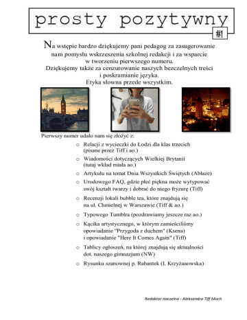 #1 Na wstępie bardzo dziękujemy pani pedagog za zasugerowanie nam pomysłu wskrzeszenia szkolnej redakcji i za wsparcie w tworzeniu pierwszego numeru. Dziękujemy także za cenzurowanie naszych bezczelnych treści i poskramianie języka. Etyka słowna przede wszystkim. Pierwszy numer udało nam się złożyć z: o Relacji z wycieczki do Łodzi dla klas trzecich (pisane przez Tiff i ao.) o Wiadomości dotyczących Wielkiej Brytanii (tutaj wkład miała ao.) o Artykułu na temat Dnia Wszystkich Świętych (Ablaze) o Urodowego FAQ, gdzie płeć piękna może wytypować swój kształt twarzy i dobrać do niego fryzurę (Tiff) o Recenzji lokali bubble tea, które znajdują się na ul. Chmielnej w Warszawie (Tiff & ao.) o Typowego Tumblra (pozdrawiamy jeszcze raz ao.) o Kącika artystycznego, w którym zamieściliśmy opowiadanie "Przygoda z duchem" (Ksena) i opowiadanie "Here It Comes Again" (Tiff) o Tablicy ogłoszeń, na której znajdują się aktualności dot. naszego gimnazjum (NW) o Rysunku szanownej p. Rabantek (I. Krzyżanowska) Redaktor naczelna - Aleksandra Tiff Moch Dnia 24 września 2014r. klasy trzecie wyjechały na wycieczkę do Łodzi. Pomimo ich niezadowolenia związanego ze zbiórką pod szkołą o szóstej rano i koniecznością założenia zimowych ubrań (pozdrawiamy szczerze mroźne poranki), udało się nam wyjechać około 6.30. Mniej więcej dwie godziny później przekroczyliśmy granice Łodzi, która zauroczyła nas swoją architekturą i roślinnością, kasztanami w szczególności. Na początku odwiedziliśmy Państwową Wyższą Szkołę Filmową, Telewizyjną i Teatralną im. Leona Schillera. Tam dowiedzieliśmy się wiele o polskiej kinematografii, a w szczególności o tej związanej z ową szkołą. Obejrzeliśmy również filmy studentów i absolwentów Filmówki. Następnie przeszliśmy do drugiego budynku, gdzie pokazano nam jak buduje się scenografię i kręci się filmy w hali. Kolejnym miejscem na naszej trasie było Muzeum Kinematografii, które zauroczyło wszystkich Filemonem i Bonifacym umieszczonymi przy wejściu do Muzeum. Na początku dowiedzieliśmy się trochę o powstawaniu filmów i pierwszych kamerach. Jednakże dopiero druga część muzeum szczerze zainteresowała wszystkich – były to gabloty z pacynkami i kukiełkami wykorzystywanymi do produkcji bajek. Poszerzono także naszą wiedzę o przedstawienie mechanizmów powstawania filmów animowanych. Trzecim fragmentem tego samego muzeum był dawny pałac K. Scheiblera, jednego z fabrykantów. Pałac zachwycił nas elementami secesji na ścianach, meblach, kominkach czy nawet sufitach. Ponadto w tym miejscu kręcono m.in. „Między ustami a brzegiem pucharu”, „Vabank”, „Stawkę większą niż życie” czy nawet „Powrót wilczycy”, potencjalnie jeden z gorszych filmów z gatunku polskiego horroru (to nie jest zwyczajny horror, ten polski rządzi się własnymi prawami). Następnie obejrzeliśmy manufaktury, przybliżono nam również proces powstawania nici oraz technologie wykorzystywane przy ich produkcji. Na samym końcu, po półgodzinnym czasie wolnym, odwiedziliśmy muzeum sztuki Ms2, w którym odbyły się warsztaty mające na celu zrozumienie artystów współczesnych. W tym celu wyklejaliśmy kwadrat z taśmy i robiliśmy wzorki kaszą gryczaną (prostota przede wszystkim). Moim zdaniem wycieczka byłaby udana, gdyby nie okropne rozplanowanie wyprawy. Szczerze poleciłabym taki wyjazd osobie, która lubuje się w rozgardiaszu i spontanicznych decyzjach. A także słowie „słuchajcie”. Myślę jednak, że cudowne ulice Łodzi i panująca w niej przyjazna atmosfera zrekompensowały częściowo ból spowodowany takim nieposzanowaniem uczniów. Ogólnie oceniam wycieczkę na plus i z chęcią ponowiłabym ją, jednakże ze zmienioną organizacją oraz dłuższym czasem wolnym, niekoniecznie spędzonym na chodzeniu po centrum handlowym. Wykorzystane ilustracje: instagram.com/ola_muszkowska/, instagram.com/epohmi/ Konkurs kuratoryjny z języka angielskiego zbliża się wielkimi krokami (już 24.10!) i o ile sam język powinien być oczywistością, o tyle elementy wiedzy o krajach anglojęzycznych już niekoniecznie. Ile tak naprawdę wiemy o Wielkiej Brytanii, epicentrum tego języka? I czym jest Guiness, prócz nazwy księgi rekordów? Sprawdźmy. Gdzie jest Zjednoczone Królestwo Wielkiej Brytanii i Irlandii wie każdy. Chyba. Oby. W tym kraju mlekiem i herbatą płynącym symbolami narodowymi jest m.in. Union Jack, czyli połączenie trzech krzyży na granatowym tle: w białym obramowaniu krzyż św. Grzegorza (Anglia) i dwa pozostałe po przekątnych: czerwony św. Patryka (Irlandia) i biały św. Andrzeja (Szkocja). W czasie świąt narodowych, takich jak np. Guy Fawkes’ Day, śpiewa się hymn God Save The Queen (albo God Save The King, ku aprobacie księcia Williama). Od góry: Pałac Buckingham Pałac Wesministerski 10 Downing Street Prócz śmiesznych policjantów zwanych bobby (nie mylić z „bobkami”, gdyż to bardzo nieestetyczne), Anglia słynie m.in. ze Stonehenge, czyli z przypadkowego wzorku z kamyków pozostawionych przez Marsjan. Położony on jest w południowej Anglii i ponoć był związany z kultem Słońca i Księżyca. Albo kobiety i mężczyzny. Gdzie dwóch naukowców, tam trzy opinie. Najlepiej wyślijmy depeszę do zielonych, o ile rasizm nam pozwoli. Przejdźmy do samej stolicy – Londynu, kolebki geeków i chmur znad całego kontynentu. To w tym mieście mieści się Pałac Buckingham, który jest rezydencją królowej Elżbiety II. Ponadto do Pałacu Wesministerskiego przylega Big Ben, częsta ofiara green screenu w filmach akcji. Natomiast na 10 Downing Street znajduje się siedziba premiera, aktualnie Davida Camerona, niezbyt gorącego zwolennika naszego narodu. Iluzja Stonehenge oraz wersja prawdziwa, tzn. z ufo. Nie dajmy się otumanić. Następną częścią Wielkiej Brytanii jest położona na północy Szkocja ze stolicą 