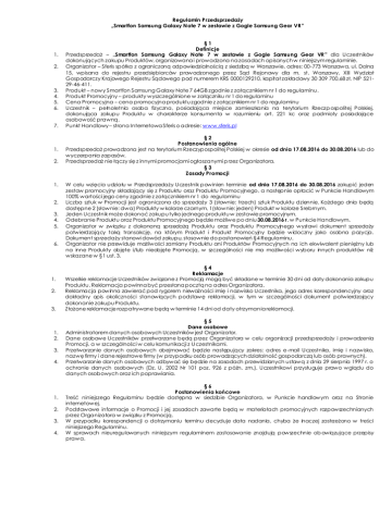 Regulamin Przedsprzedaży „Smartfon Samsung Galaxy Note 7 w zestawie z Gogle Samsung Gear VR” 1. 2. 3. 4. 5. 6. 7. 1. 2. 1. 2. 3. 4. 5. 6. 1. 2. 3. 1. 2. 3. 4. 1. 2. 3. 4. §1 Definicje Przedsprzedaż – „Smartfon Samsung Galaxy Note 7 w zestawie z Gogle Samsung Gear VR ” dla Uczestników dokonujących zakupu Produktów, organizowana i prowadzona na zasadach opisanych w niniejszym regulaminie. Organizator – Sferis spółka z ograniczoną odpowiedzialnością z siedzibą w Warszawie, adres: 00-773 Warszawa, ul. Dolna 15, wpisana do rejestru przedsiębiorców prowadzonego przez Sąd Rejonowy dla m. st. Warszawy, XIII Wydzia ł Gospodarczy Krajowego Rejestru Sądowego pod numerem KRS 0000129210, kapitał zakładowy 30 309 700,68 zł, NIP 52129-46-411. Produkt – nowy Smartfon Samsung Galaxy Note 7 64GB zgodnie z załącznikiem nr 1 do regulaminu. Produkt Promocyjny – produkty wyszczególnione w załączniku nr 1 do regulaminu Cena Promocyjna – cena promocyjna produktu zgodnie z załącznikiem nr 1 do regulaminu Uczestnik – pełnoletnia osoba fizyczna, posiadająca miejsce zamieszkania na terytorium Rzeczp ospolitej Polskiej, dokonują ca zakupu Produktu w charakterze konsumenta w rozumieniu art. 221 kc oraz podmioty posia dają ce osobowość prawną. Punkt Handlowy – strona Internetowa Sferis o adresie: www.sferis.pl §2 Postanowienia ogólne Przedsprzedaż prowadzona jest na terytorium Rzeczypospolitej Polskiej w okresie od dnia 17.08.2016 do 30.08.2016 lub do wyczerpania zapasów. Przedsprzedaż nie łączy się z innymi promocjami ogłaszanymi p rzez Organizatora. §3 Zasady Promocji W celu wzięcia udziału w Przedsprzedaży Uczestnik powinien terminie od dnia 17.08.2016 do 30.08.2016 zakupić jeden zestaw promocyjny składający się z Produktu oraz Produktu Promocyjnego, a następnie opłacić w Punkcie Handlowym 100% wartości jego ceny zgodnie z załącznikiem nr 1 do regulaminu Liczba sztuk w Promocji jest ograniczona do sprzedaży 3 (słownie: trzech) sztuk Produktu dziennie. Każdego dnia będą dostępne 2 (słownie: dwa) Produkty w kolorze czarnym, 1(słownie: jeden) Produkt w kolorze Srebrnym. Jeden Uczestnik może dokonać zakupu tylko jednego produktu w zestawie promocyjnym. Odebranie Produktu oraz Produktu Promocyjnego będzie możliwe po dniu 30.08.2016 r. w Punkcie Handlowym. Organizator w zwią zku z dokonaną sprzedażą Produktu oraz Produktu Promocyjn ego wystawi dokument sprzedaży potwierdzający taką transakcję, na którym Produkt i Produkt Promocyjny będzie wid oczny jako osobna pozycja . Dokument sprzedaży stanowi dowód zakupu, stosownie do postanowień §4 Regulaminu. Organizator nie przewiduje możliwości zamiany Produktu ani Produktów Promocyjnych na ich ekwiwalent pieniężny lub na inne Produkty objęte i/lub nieobjęte Promocją, w szczególności nie ma możliw ości wyboru innych produktów niż wskazane w §1 ust. 3. §4 Reklamacje Wszelkie reklamacje Uczestników związane z Promocją mogą być składane w terminie 30 dni od daty dokonania zakupu Produktu. Reklamacja powinna być przesłana pocztą na adres Organizatora. Reklamacja powinna zawierać pod rygorem nieważności imię i nazwisko Uczestnika, jego adres korespondencyjny oraz dokładny opis okoliczności stanowią cych podstawę reklamacji, w tym w szczególności dokument potwierdzają cy dokonanie zakupu Produktu. Złożone reklamacje rozpatrywane będą w terminie 14 dni od daty otrzyman ia reklamacji. §5 Dane osobowe Administratorem danych osobowych Uczestników jest Organizator. Dane osobowe Uczestników przetwarzane będą przez Organizatora w celu organizacji przedsprzedaży i prowadzenia Promocji, a w szczególności w celu komunikacji z U czestnikami. Przetwarzanie danych osobowych obejmować będzie następujący zakres: adres e-mail Uczestnika, imię i nazwisko, nazwę firmy i dane rejestrowe firmy (w przypadku osób prowadzących działalność gospodarczą lub osób prawnych). Przetwarzanie danych osobowych odbywać się będzie na zasadach przewid zianych ustawą z dnia 29 sierpnia 1997 r. o ochronie danych osobowych (Dz. U. 2002 Nr 101 poz. 926 z późn. zm.). Uczestnikowi przysługuje prawo wglądu do danych osobowych oraz ich poprawiania. §6 Postanowienia końcowe Treść niniejszego Regula minu będzie dostępna w siedzib ie Organizatora, w Punkcie handlowym oraz na Stronie internetowej. Podstawowe informacje o Promocji i jej zasadach zawarte będą w materia łach promocyjnych rozpowszechnianych przez Organizatora w związku z Promocją. W przypadku korespondencji o dotrzymaniu terminu decyduje data nadania , chyba że inaczej zastrzeżono w treści niniejszego Regulaminu. W sprawach nieuregulowanych niniejszym regula minem zastosowanie znajd ują powszechnie ob owią zujące przepisy prawa. ZAŁĄCZNIK NR 1 DO REGULAMINU PRODUKT KOD PRODUCENTA NR DAX CENA BRUTTO PRODUKTU DOSTĘPNA LICZBA LICZBA SZTUK W SZTUK W PROMOCJI PROMOCJI OGÓŁEM DZIENNIE Smartfon SAMSUNG GALAXY NOTE 7 64GB Srebrny SM-N930FZSAXEO 001SA1S005247 3 620,00 zł 1 20 Smartfon SAMSUNG GALAXY NOTE 7 64GB Czarny SM-N930FZKAXEO 001SA1S005246 3 620,00 zł 2 30 PRODUKT PROMOCYJNY KOD PRODUCENTA NR DAX Gogle Samsung Gear VR 2 czarne SM-R323NBKAXEO SM-R323NBKAXEO 001SA1S005248 CENA BRUTTO PRODUKTU PROMOCYJNEGO 379,00 zł