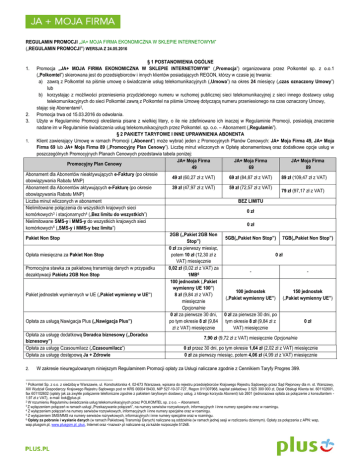 REGULAMIN PROMOCJI „JA+ MOJA FIRMA EKONOMICZNA W SKLEPIE INTERNETOWYM” („REGULAMIN PROMOCJI”) WERSJA Z 24.05.2016 § 1 POSTANOWIENIA OGÓLNE Promocja „JA+ MOJA FIRMA EKONOMICZNA W SKLEPIE INTERNETOWYM” („Promocja”) organizowana przez Polkomtel sp. z o.o.1 („Polkomtel”) skierowana jest do przedsiębiorców i innych klientów posiadających REGON, którzy w czasie jej trwania: a) zawrą z Polkomtel na piśmie umowę o świadczenie usług telekomunikacyjnych („Umowa”) na okres 24 miesięcy („czas oznaczony Umowy”) lub b) korzystając z możliwości przeniesienia przydzielonego numeru w ruchomej publicznej sieci telekomunikacyjnej z sieci innego dostawcy usług telekomunikacyjnych do sieci Polkomtel zawrą z Polkomtel na piśmie Umowę dotyczącą numeru przeniesionego na czas oznaczony Umowy, stając się Abonentami2. 2. Promocja trwa od 15.03.2016 do odwołania. 3. Użyte w Regulaminie Promocji określenia pisane z wielkiej litery, o ile nie zdefiniowano ich inaczej w Regulaminie Promocji, posiadają znaczenie nadane im w Regulaminie świadczenia usług telekomunikacyjnych przez Polkomtel. sp. o.o. – Abonament („Regulamin”). § 2 PAKIETY TARYFOWE I INNE UPRAWNIENIA ABONENTA 1. Klient zawierający Umowę w ramach Promocji („Abonent”) może wybrać jeden z Promocyjnych Planów Cenowych: JA+ Moja Firma 49, JA+ Moja Firma 69 lub JA+ Moja Firma 89 („Promocyjny Plan Cenowy”). Liczbę minut wliczonych w Opłatę abonamentową oraz dodatkowe opcje usług w poszczególnych Promocyjnych Planach Cenowych przedstawia tabela poniżej: JA+ Moja Firma JA+ Moja Firma JA+ Moja Firma Promocyjny Plan Cenowy 49 69 89 Abonament dla Abonentów nieaktywujących e-Faktury (po okresie 49 zł (60,27 zł z VAT) 69 zł (84,87 zł z VAT) 89 zł (109,47 zł z VAT) obowiązywania Rabatu MNP) Abonament dla Abonentów aktywujących e-Fakturę (po okresie 39 zł (47,97 zł z VAT) 59 zł (72,57 zł z VAT) 79 zł (97,17 zł z VAT) obowiązywania Rabatu MNP) Liczba minut wliczonych w abonament BEZ LIMITU Nielimitowane połączenia do wszystkich krajowych sieci 0 zł komórkowych3 i stacjonarnych4 („Bez limitu do wszystkich”) Nielimitowane SMS-y i MMS-y do wszystkich krajowych sieci 0 zł komórkowych5 („SMS-y i MMS-y bez limitu”) 2GB („Pakiet 2GB Non Pakiet Non Stop 5GB(„Pakiet Non Stop”) 7GB(„Pakiet Non Stop”) Stop”) 0 zł za pierwszy miesiąc, Opłata miesięczna za Pakiet Non Stop potem 10 zł (12,30 zł z 0 zł VAT) miesięcznie Promocyjna stawka za pakietową transmisję danych w przypadku 0,02 zł (0,02 zł z VAT) za dezaktywacji Pakietu 2GB Non Stop 1MB6 100 jednostek („Pakiet wymienny UE 100”) 100 jednostek 150 jednostek Pakiet jednostek wymiennych w UE („Pakiet wymienny w UE”) 8 zł (9,84 zł z VAT) („Pakiet wymienny UE”) („Pakiet wymienny UE”) miesięcznie Opcjonalnie 0 zł za pierwsze 30 dni, 0 zł za pierwsze 30 dni, po Opłata za usługą Nawigacja Plus („Nawigacja Plus”) po tym okresie 8 zł (9,84 tym okresie 8 zł (9,84 zł z 0 zł zł z VAT) miesięcznie VAT) miesięcznie Opłata za usługę dodatkową Doradca biznesowy („Doradca 7,90 zł (9,72 zł z VAT) miesięcznie Opcjonalnie biznesowy”) Opłata za usługę Czasoumilacz („Czasoumilacz”) 0 zł przez 30 dni, po tym okresie 1,64 zł (2,02 zł z VAT) miesięcznie Opłata za usługę dostępową Ja + Zdrowie 0 zł za pierwszy miesiąc, potem 4,06 zł (4,99 zł z VAT) miesięcznie 1. 2. W zakresie nieuregulowanym niniejszym Regulaminem Promocji opłaty za Usługi naliczane zgodnie z Cennikiem Taryfy Progres 399. Polkomtel Sp. z o.o. z siedzibą w Warszawie, ul. Konstruktorska 4, 02-673 Warszawa, wpisana do rejestru przedsiębiorców Krajowego Rejestru Sądowego przez Sąd Rejonowy dla m. st. Warszawy, XIII Wydział Gospodarczy Krajowego Rejestru Sądowego pod nr KRS 0000419430, NIP 527-10-37-727, Regon 011307968, kapitał zakładowy 3 525 300 000 zł, Dział Obsługi Klienta tel. 601102601, fax 601102602 (opłaty jak za zwykłe połączenie telefoniczne zgodnie z pakietem taryfowym dostawcy usług, z którego korzysta Abonent) lub 2601 (jednorazowa opłata za połączenie z konsultantem 1,97 zł z VAT), e-mail: [email protected]. 2 W rozumieniu Regulaminu świadczenia usług telekomunikacyjnych przez POLKOMTEL sp. z o.o. – Abonament. 3 Z wyłączeniem połączeń w ramach usługi „Przekazywanie połączeń”, na numery serwisów rozrywkowych, informacyjnych i inne numery specjalne oraz w roamingu. 4 Z wyłączeniem połączeń na numery serwisów rozrywkowych, informacyjnych i inne numery specjalne oraz w roamingu. 5 Z wyłączeniem SMS/MMS na numery serwisów rozrywkowych, informacyjnych i inne numery specjalne oraz w roamingu. 6 Opłaty za pobranie i wysłanie danych (w ramach Pakietowej Transmisji Danych) naliczane są oddzielnie (w ramach jednej sesji w rozliczeniu dziennym). Opłaty za połączenia z APN: wap, wap.plusgsm.pl, www.plusgsm.pl, plus, Internet oraz <nazwa>.pl naliczane są za każde rozpoczęte 512kB. 1 3. 4. 5. 6. 7. 8. 10. 11. 12. 13. 14. 15. W ramach Promocji Abonent uzyskuje prawo do korzystania z Usług na specjalnych warunkach promocyjnych określonych w Regulaminie Promocji przez cały okres świadczenia Usług7, chyba że z treści Regulaminu Promocji wynika inny termin. Urządzenie telekomunikacyjne/inny towar Polkomtel umożliwia Abonentowi zakup od Polkomtel/Partnera Plus Urządzeń telekomunikacyjnych/innych towarów po promocyjnej cenie, wskazanej w Załączniku nr 1 do Regulaminu Promocji. Urządzenia telekomunikacyjne nie są samodzielnie przedmiotem Promocji. Polkomtel zastrzega, iż dostępność poszczególnych modeli Urządzeń telekomunikacyjnych/innych towarów w Promocji uzależniona jest od aktualnych stanów magazynowych Polkomtel/Partnera Plus. Polkomtel informuje, że tablety bez gniazda na Kartę SIM, konsole, opaski monitorujące, zegarki sprzedawane w ramach Promocji nie współpracują z Kartą SIM, udostępnianą wraz z 