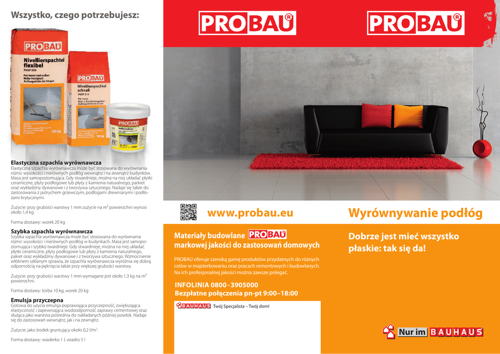 Wszystko, czego potrzebujesz: Elastyczna szpachla wyrównawcza Elastyczna szpachla wyrównawcza może być stosowana do wyrównania różnic wysokości i nierównych podłóg wewnątrz i na zewnątrz budynków. Masa jest samopoziomująca. Gdy stwardnieje, można na niej układać płytki ceramiczne, płyty podłogowe lub płyty z kamienia naturalnego, parkiet oraz wykładziny dywanowe i z tworzywa sztucznego. Nadaje się także do zastosowania z jastrychem grzewczym, podłogami drewnianymi i podłożami krytycznymi. Zużycie: przy grubości warstwy 1 mm zużycie na m² powierzchni wynosi około 1,4 kg. Forma dostawy: worek 20 kg Szybka szpachla wyrównawcza Szybka szpachla wyrównawcza może być stosowana do wyrównania różnic wysokości i nierównych podłóg w budynkach. Masa jest samopoziomująca i szybko twardnieje. Gdy stwardnieje, można na niej układać płytki ceramiczne, płyty podłogowe lub płyty z kamienia naturalnego, pakiet oraz wykładziny dywanowe i z tworzywa sztucznego. Wzmocnienie włóknem szklanym sprawia, że szpachla wyrównawcza wyróżnia się dobrą odpornością na pęknięcia także przy większej grubości warstwy. Zużycie: przy grubości warstwy 1 mm wymagane jest około 1,3 kg na m² powierzchni. Forma dostawy: torba 10 kg, worek 20 kg Emulsja przyczepna Gotowa do użycia emulsja poprawiająca przyczepność, zwiększająca elastyczność i zapewniająca wodoodporność zaprawy cementowej oraz służąca jako warstwa pośrednia do nakładanych później powłok. Nadaje się do zastosowań wewnątrz, jak i na zewnątrz. www.probau.eu Materiały budowlane markowej jakości do zastosowań domowych Wyrównywanie podłóg Dobrze jest mieć wszystko płaskie: tak się da! PROBAU oferuje szeroką gamę produktów przydatnych do różnych celów w majsterkowaniu oraz pracach remontowych i budowlanych. Na ich profesjonalnej jakości można zawsze polegać. INFOLINIA 0800 - 3905000 Bezpłatne połączenia pn-pt 9:00–18:00 Twój Specjalista – Twój dom! Nur im Zużycie: jako środek gruntujący około 0,2 l/m2. Forma dostawy: wiaderko 1 l, wiadro 5 l BAUHAUS GmbH & Co. KG Rhein-Main-Neckar, Bohnenbergerstraße 17, 68219 Mannheim Więcej równości! Dobrze wiedzieć: Podłoże musi być nośne, czyste, suche i bez pęknięć. Aby zwiększyć przyczepność i elastyczność tej szpachli wyrównawczej PROBAU, polecamy zastosowanie emulsji przyczepnej PROBAU. 7 8 Pędzlem ławkowcem lub szczotką dobrze nawilżyć podłoże, aby poprawić przyczepność. 1 Różnica poziomów między pokojem ze starą podłogą z linoleum a sąsiednim pomieszczeniem wynosi 2 cm. Aby w przejściu można było ułożyć płytki ceramiczne, należy wyrównać tę różnicę wysokości. 3 Aby zerwać linoleum, pociąć starą podłogę na pasy i odrywać je jeden po drugim od podłoża. Różnice wysokości między pokojami w domu nie tylko źle wyglądają, ale także są niebezpieczne – można się o nie potknąć. Za pomocą szpachli wyrównawczej PROBAU można całkiem łatwo i skutecznie uzyskać „większą równość”. Produkty PROBAU są dostępne wyłącznie w specjalistycznym centrum BAUHAUS. 2 Ponieważ przejście nie może być zbyt długo zamknięte, wskazany jest wybór szybko twardniejącej masy. 4 Dokładnie usunąć pozostałości kleju z podłoża za pomocą skrobaka. 9 Rozrobić szybką szpachlę wyrównawczą PROBAU i natychmiast rozprowadzić po podłożu, zaczynając od narożnika. 10 Wspomóc równomierne rozpływanie za pomocą gumowego zbieraka. Za pomocą miotły ulicznej usunąć pęcherzyki powietrza powstałe w trakcie rozrabiania. 11 12 Różnica wysokości wynosząca 2 cm musi zostać wyrównana w jak najkrótszym czasie. I: już po 3 godzinach po powierzchni można znowu chodzić! Na zakończenie odciąć wystającą taśmę brzegową nożem do wykładzin. Już następnego dnia można układać płytki. Rada PROBERTA : Narzędzia potrzebne do wykonania pracy: 5 Dokładnie zamieść podłoże miotłą uliczną. 6 Przykleić taśmę brzegową na wszystkich cokołach ściennych wokół pomieszczenia. Następnie zniwelować pomieszczenie za pomocą poziomnicy wężowej i nanieść wymiary na taśmy brzegowe. – skrobak – szpachla – miotła uliczna – pędzel ławkowiec – kubeł na zaprawę – gumowy zbierak – wiertarka z mieszadłem – poziomnica wężowa – ołówek – nóż do wykładzin