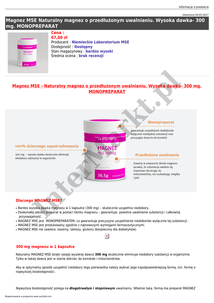 Informacje o produkcie Utworzono 04-03-2017 Magnez MSE Naturalny magnez o przedłużonym uwalnianiu. Wysoka dawka- 300 mg. MONOPREPARAT Cena : 67,00 zł .p l Producent : Niemieckie Laboratorium MSE Dostępność : Dostępny Stan magazynowy : bardzo wysoki Średnia ocena : brak recenzji te r M ar kt Magnez MSE - Naturalny magnez o przedłużonym uwalnianiu. Wysoka dawka- 300 mg. MONOPREPARAT ● ● ● ● ● In Dlaczego MAGNEZ MSE? Bardzo wysoka dawka magnezu w 1 kapsułce (300 mg) – skutecznie uzupełnia niedobory. Doskonałej jakości preparat w postaci tlenku magnezu – gwarantuje powolne uwalnianie substancji i całkowitą przyswajalność. MAGNEZ MSE jest MONOPREPARATEM, co gwarantuje precyzyjne uzupełnienie niedoborów wyłącznie tej substancji . MAGNEZ MSE jest produkowany zgodnie z najnowszymi wymogami farmaceutycznymi. MAGNEZ MSE nie zawiera: kazeiny, laktozy, glutenu (bezpieczny dla diabetyków) 300 mg magnezu w 1 kapsułce Naturalny MAGNEZ MSE dzięki swojej wysokiej dawce 300 mg skutecznie eliminuje niedobory substancji w organizmie. Tylko w takiej dawce jest w stanie dotrzec do komórek i mitochondriów. Aby w optymalny sposób uzupełnić niedobory tego pierwiastka należy wybrać jego najodpowiedniejszą formę, tzn. formę o najwyższej biodostępności. Najwyższa biodostępność polega na długotrwałym i stopniowym uwalnianiu. Właśnie taką formą ma preparat MAGNEZ Wygenerowano w programie www.oscGold.com MSE. Dlaczego tlenek magnezu ? Naukowcy sugerują również, że w doborze preparatu magnezowego pomocna jest ocena stanu śluzówki żołądka oraz czynności wątroby. Przy nadkwaśności i stanach zapalnych żołądka najlepiej tolerowany jest tlenek magnezu, który neutralizuje nadkwaśność soku żołądkowego i ma działanie osłaniające błonę śluzową. MONOPREPARAT - skuteczne działanie. Bardzo ważnym jest również stosowanie magnezu w postaci MONOPREPARATU, ze względu na uniknięcie ryzyka interakcji z jednocześnie stosowanymi innymi substancjami. Uzupełnianie niedoborów powinno być prowadzone zgodnie z indywidualnym deficytem. Bezpieczniej jest więc stosować suplementację monopreparatami, ze względu na ułatwioną kontrolę poziomu wysycenia organizmu daną substancją. te r M ar kt .p l Odpowiednie suplementowanie magnezem nie powoduje skutków ubocznych, ale powinno być stosowane systematycznie do momentu osiągnięcia odpowiedniego efektu. In Właściwości magnezu: Magnez jako składnik mineralny służy prawidłowemu przebiegowi licznych procesów w organizmie w ramach przemiany materii. Jest składnikiem ponad 300 enzymów. ● ● ● ● ● ● ● ● ● przyczynia się do zmniejszenia uczucia zmęczenia i znużenia pomaga w utrzymaniu równowagi elektrolitowej przyczynia się do utrzymania prawidłowego metabolizmu energetycznego pomaga w prawidłowym funkcjonowaniu układu nerwowego pomaga w prawidłowym funkcjonowaniu mięśni pomaga w prawidłowej syntezie białka pomaga w utrzymaniu prawidłowych funkcji psychologicznych pomaga w utrzymaniu zdrowych kości, zębów odgrywa rolę w procesie podziału komórek Przeznaczenie produktu Magnez jest składnikiem ponad 300 enzymów, pomaga w utrzymaniu równowagi elektrolitowej. Służy prawidłowemu przebiegowi licznych procesów w organizmie w ramach przemiany materii między innymi :podczas pozyskiwania energii w mitochondriach w kompleksie V, co przyczynia się do zmniejszenia uczucia zmęczenia i znużenia. Bierze udział w metabolizmie energii komórek mięśniowych (skurcze mięśni), jak również w syntezie białka. Magnez pomaga w prawidłowym funkcjonowaniu układu nerwowego oraz w utrzymaniu prawidłowych funkcji psychologicznych. Wywiera także dobroczynny wpływ na utrzymanie zdrowych kości i zębów. Informacje o produkcie Skład i sposób użycia Skład: Tlenek magnezu (81,5 g /100 g), żelatyna, substancje przeciwzbrylające: dwutlenek krzemu i stearynian magnezu. Sposób użycia: 1 kapsułka dziennie (300 mg magnezu). Najlepiej spożyć podczas posiłku popijając wystarczającą ilością wody. Dawka dzienna stanowi 80% zalecanego dziennego spożycia określonego przez Rozporządzenie Ministra Zdrowia z dnia 9 października 2007r. w sprawie składu oraz oznakowania suplementów diety. Nie należy przekraczać dziennej zalecanej porcji do spożycia. Suplement diety nie może być stosowany jako substytut zróżnicowanej diety. Należy prowadzić zdrowy tryb życia i różnorodnie się odżywiać. Magnez MSE nie zawiera kazeiny, laktozy, glutenu i drożdży. Dla diabetyków: brak naliczania BE .p l Opakowanie zawiera 60 lub 120 kapusłek Dostępne opcje Magnez MSE Naturalny magnez o przedłużonym uwalnianiu. Wysoka dawka- 300 mg. MONOPREPARAT In te r M ar kt » Ilość kapsułek: 60, 120 (+52,00 zł). Wygenerowano w programie www.oscGold.com
