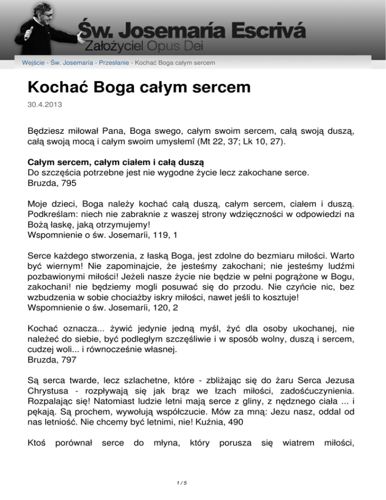 Wejście - Św. Josemaría - Przesłanie - Kochać Boga całym sercem Kochać Boga całym sercem 30.4.2013 Będziesz miłował Pana, Boga swego, całym swoim sercem, całą swoją duszą, całą swoją mocą i całym swoim umysłem (Mt 22, 37; Lk 10, 27). Całym sercem, całym ciałem i całą duszą Do szczęścia potrzebne jest nie wygodne życie lecz zakochane serce. Bruzda, 795 Moje dzieci, Boga należy kochać całą duszą, całym sercem, ciałem i duszą. Podkreślam: niech nie zabraknie z waszej strony wdzięczności w odpowiedzi na Bożą łaskę, jaką otrzymujemy! Wspomnienie o św. Josemaríi, 119, 1 Serce każdego stworzenia, z łaską Boga, jest zdolne do bezmiaru miłości. Warto być wiernym! Nie zapominajcie, że jesteśmy zakochani; nie jesteśmy ludźmi pozbawionymi miłości! Jeżeli nasze życie nie będzie w pełni pogrążone w Bogu, zakochani! nie będziemy mogli posuwać się do przodu. Nie czyńcie nic, bez wzbudzenia w sobie chociażby iskry miłości, nawet jeśli to kosztuje! Wspomnienie o św. Josemaríi, 120, 2 Kochać oznacza... żywić jedynie jedną myśl, żyć dla osoby ukochanej, nie należeć do siebie, być podległym szczęśliwie i w sposób wolny, duszą i sercem, cudzej woli... i równocześnie własnej. Bruzda, 797 Są serca twarde, lecz szlachetne, które - zbliżając się do żaru Serca Jezusa Chrystusa - rozpływają się jak brąz we łzach miłości, zadośćuczynienia. Rozpalając się! Natomiast ludzie letni mają serce z gliny, z nędznego ciała ... i pękają. Są prochem, wywołują współczucie. Mów za mną: Jezu nasz, oddal od nas letniość. Nie chcemy być letnimi, nie! Kuźnia, 490 Ktoś porównał serce do młyna, 1/5 który porusza się wiatrem miłości, namiętności...Istotnie, ten "młyn" może mleć pszenicę, jęczmień, gnój... To zależy od nas! Bruzda, 811 Gdy kocha się naprawdę, wówczas wszystko oddaje się z radością, bez wyliczania i bez oczekiwania na wdzięczność: duszy wystarczy, że może się wyniszczać z rozkoszą! Nie zastanawia się, czy już dużo zrobiła lub ile ją kosztowało: w obcowaniu z Bogiem nie zważa się na trudności, ponieważ – tak jak w miłości pomiędzy ludźmi – nie ma takich przeszkód ani niedoskonałości, które uniemożliwiłyby rozmowę z ukochaną osobą. Wspomnienie o św. Josemaríi, 52, 2 Nie miej wątpliwości: Serce zostało stworzone po to, żeby kochać. Napełnijmy więc Panem Jezusem wszystkie nasze miłości. Inaczej, niewypełnione serce się mści i zalewa się najgorszymi nikczemnościami. Bruzda, 800 Boga należy kochać całym sercem, z pełnym oddaniem, mając pewność, że Pan zawsze pochyli się nad naszym biednym sercem, jeśli naprawdę Mu je oddajemy. Wspomnienie o św. Josemaríi, 124-125 Zakochani w Miłości Jesteśmy zakochani w Miłości. Dlatego Pan nie chce byśmy byli oschli, sztywni jak jakiś przedmiot bez życia: pragnie, byśmy byli przepojeni Jego czułością! Kuźnia, 492 Pan nie miał zimnego serca, miał serce nieskończenie głębokie, które potrafiło być wdzięczne, które umiało kochać. Wspomnienie o św. Josemaríi, 125, 3 Jezus sprawi, że do wszystkich, z którymi masz do czynienia na co dzień, będziesz żywił ogromną miłość, która w żadnym razie nie przesłoni tej, którą masz do Niego. Wprost przeciwnie: im bardziej będziesz kochał Jezusa, tym więcej ludzi znajdzie miejsce w twoim sercu. Kuźnia, 876 Popatrz: mamy kochać Boga nie tylko naszym sercem, lecz także "Jego" Sercem i sercem całej ludzkości wszystkich czasów... Bez tego nie potrafimy odwzajemnić się Jego Miłości. Bruzda, 809 Jesteśmy ludźmi, którzy zobowiązali się do miłości. Dlatego musimy żyć w nieustannej wierności, coraz bardziej wymagającej, także wtedy, gdy przychodzi 2/5 nam iść wbrew sobie. Poruszamy się w obecności Boga. On patrzy na nas nieustannie i zna nasze najbardziej skryte myśli, scrutans corda („przenika serca”): tak bardzo nas umiłował, że nic w naszym życiu nie ujdzie jego uwagi. Dlatego tyle razy w różnych sytuacjach powtarzam wam, abyście w odpowiedzi na Jego troskę o was, oddali Mu całe swoje serce. Wspomnienie o św. Josemaríi, 206, 4 Jeśli naprawdę pragniesz, aby twoje serce reagowało niezawodnie, radzę ci, abyś pogrążył się w jednej z Ran Pańskich: w ten sposób będziesz z Nim w bliskiej zażyłości, przylgniesz do Niego, będziesz czuł bicie Jego Serca... i spełnisz wszystko, czego zażąda. Kuźnia, 755 Dzięki Ci, mój Jezu, że zechciałeś stać się prawdziwym Człowiekiem, z Sercem kochającym i najmilszym, które kocha aż do śmierci i cierpi; które napełnia się radością i bólem; które entuzjazmuje się drogami ludzi i pokazuje nam drogę prowadzącą do Nieba; które heroicznie podporządkowuje się obowiązkowi i kieruje się miłosierdziem; które czuwa nad biednymi i bogatymi; które troszczy się o grzeszników i o sprawiedliwych...— Dziękuję Ci, mój Jezu, i uczyń nasze serca według Serca Twego! Bruzda, 813 Serce! Od czasu do czasu wciska się weń cień blichtru ziemskiego: głupie, smutne, "zaściankowe" wspomnienia...Przystąp natychmiast do Tabernakulum, fizycznie lub duchowo, a powrócisz do światła, do radości, do Życia. Bruzda, 817 Z pomocą Dziewicy Bez pomocy Bożej nie można prowadzić życia czystego. Bóg pragnie naszej pokory, pragnie, byśmy prosili Go o pomoc, za pośrednictwem naszej Matki i Matki Jego. Musisz natychmiast w samotności swego serca, któremu towarzyszy jedynie Najświętsza Maryja Panna, powiedzieć Jej bez zgiełku słów: Matko moja, to moje biedne serce czasami się buntuje... Lecz jeśli mi pomożesz... - I pomoże ci, abyś zachował je w czystości i abyś dalej szedł drogą, na którą Bóg cię wezwał. Najświętsza Maryja Panna ułatwi ci zawsze pełnienie Woli Bożej. Kuźnia, 315 Proście błogosławioną Matkę Niebieską, aby oczyściła wasze serca, a Ona wyprosi to dla was u Boga Oj