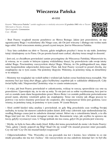 Wieczerza Pańska 65-1212 Kazanie "Wieczerza Pańska" zostało wygłoszone w niedzielę wieczorem 12 grudnia 1965 roku w Tucson Tabernacle w Tucson, Arizona. Tytuł oryginału: Communion Czas - 34 min 1 Brat Pearry wygłosił mocne poselstwo ze Słowa Bożego. Jakże jest prawdziwe, że my ograniczamy Boga i wydzielamy dla Niego czas, ale On jest wieczny i dlatego nie wolno nam tego robić. Dziś wieczorem stoimy przed czymś innym. Jest to Wieczerza Pańska. 2 Trzy lata czekałem na zbór w Tucson, gdzie mógłbym przybyć i teraz to się stało. Jesteśmy tutaj i dziękujemy za to Panu. On po prostu kazał nam czekać, abyśmy teraz mogli to docenić. 3 Jest coś, co chciałbym powiedzieć zanim przystąpimy do Wieczerzy Pańskiej. Mianowicie to, iż wierzę, że w czasie w którym żyjemy widzieliśmy dosyć, by prawdziwie całe swoje istoty oddać Bogu. Powinniśmy rzeczywiście służyć Bogu. Wierzę, że On pobłogosławił nas, dając nam bezpośrednie odpowiedzi dotyczące Pism. Jak brat Pearry wyraził to przed chwilą, my znajdujemy się w tym czasie. Nie jesteśmy ślepymi. Widzimy, że jesteśmy tutaj, że dotarliśmy w to miejsce. 4 Możemy też rozglądać się wokół siebie i widzieć jak ludzie coraz bardziej tracą rozsądek. Nie możemy być już tutaj zbyt długo, gdyż bylibyśmy zupełnie jak w zakładzie obłąkanych. Cały świat byłby taki. Nieprawdaż? Jesteśmy więc w czasie ostatecznym. 5 A więc, jak brat Pearry powiedział w zakończeniu, widząc te rzeczy, sprawdźcie czy one są prawdziwe. Upewnijcie się, że to nie są mity. To nie jest coś co sobie wyobrażamy, lecz jest to coś co zostało nam dane bezpośrednio przez Słowo Boże i co zostało publicznie poświadczone przed nami, abyśmy wiedzieli gdzie się znajdujemy. Teraz nie wiemy jak długo jeszcze to potrwa i na nowo musimy powracać do czujności, aby rozpoznawać która jest godzina. Lecz wiemy, że jesteśmy tutaj, że jesteśmy w tym czasie. W czasie Bożym. 6 Ktoś zrobił kiedyś taką analizę i powiedział, że gdy Bóg przydziela czas według Swojej rachuby, to tysiąc lat stanowi zaledwie jeden dzień. Jeśli więc człowiek żyje siedemdziesiąt lat, według Bożego czasu jest to zaledwie dziesięć minut. Mówi się o czterdziestu latach, a to dla Boga (nie) jest nic. On może mrugnąć swoje oko. Rozumiecie więc, jak szybko ta sprawa się toczy, gdyby wyznaczyć czas. U Niego jednak nie ma czasu, gdyż On po prostu jest wieczny. 7 Myślę, że była to Sara albo mały Józef. Kilka dni temu powiedział do mnie i do brata Pearry: "Tato, gdzie i kiedy pojawił się Bóg? Skąd On się wziął? On musiał przecież mieć początek. Czy nie tak? Czy On nie musiał kiedyś rozpocząć?" 8 Odpowiedziałem: "Nie. Wszystko co ma początek ma też i koniec, lecz właśnie to co nie miało początku nie ma też i końca." Ale rzeczywiście on ma zaledwie dziesięć lat i to był dla 65-1212 - Wieczerza Pańska, Tucson, Arizona Strona 2 niego zbyt wielki kęs do zjedzenia. Jak on mógł to pojąć, że istnieje coś co nigdy się nie rozpoczęło? Nie tylko dla niego, lecz i dla mnie jest to zbyt trudne. Nieprawdaż? Dla wszystkich nas jest to zbyt duża porcja. Jak to mogło się rozpocząć? 9 Stykamy się tutaj z czymś, co jest naprawdę święte. 10 Kilka dni temu wezwano mnie do pewnego bardzo miłego chrześcijanina. On powiedział, że my obchodzimy Wieczerzę Pańską, czyli komunię, literalnie, on zaś nigdy nie brał w tym udziału, gdyż należał do takich którzy przyjmują to co nazywają "komunią duchową". Jeśli chodzi o wyraz "komunia" to powiedziałbym, ze jest to słuszne, ponieważ "komunikować się" znaczy porozumiewać się z sobą, mieć społeczność. Ten brat zacytował mi to miejsce Pisma i powiedział: "Bracie Branham, czy więc nie myślisz..." 11 Otóż przyczyna, dla której to mówię... Czy mogę to powiedzieć, bracie Pearry? [Brat Pearry Green odpowiada: "Oczywiście" - uwaga wyd.] Mówię to w tym celu, abyście rozumieli, co czynicie. Jeśli wchodzicie w coś ślepo, to nie wiecie gdzie jesteście i co czynicie. Nie możecie nawet mieć zaufania do czegoś, jeśli nie wiecie jakie to ma znaczenie. Powinniście rozumieć, co robicie i dlaczego to robicie. 12 On powiedział: "Jeśli weźmiemy Słowo Boże, czyż nie jest Bóg, którego przyjmujemy?" 13 "Dokładnie tak, bracie, to prawda" - odpowiedziałem. Ale czytamy tam również, że oni rzeczywiście... Paweł uczył literalnego obchodzenia Wieczerzy Pańskiej. "To czyńcie na pamiątkę Moją" - powiedział Jezus. "Ilekroć będziecie to przyjmować na Moją pamiątkę) opowiadacie śmierć Pańską, dopóki nie przyjdzie", Zrozumiałe? A więc powinniśmy to przyjmować. 14 Wiemy, że święty Paweł, który ustanowił to w Kościele, był prorokiem Nowego Testamentu. Piotr, Jakub, Jan wszyscy oni pisali (Mateusz, Marek, Łukasz) co Jezus czynił, jako kronikarze. Lecz Paweł uporządkował tę sprawę, będąc prorokiem Nowego Testamentu. Jak Mojżesz odszedł na pustynię, aby otrzymać natchnienie do napisania pierwszych pięciu ksiąg Biblii, tak i Paweł również poszedł na pustynię, aby otrzymać natchnienie od Boga dla uporządkowania Kościoła nowotestamentowego i wskazania jego więzi ze starym jako jego typem (obrazem). 15 Wtedy oni mieli baranka ofiarnego i Izrael przestrzegał tego jako pamiątkę. To zostało autentycznie użyte tylko raz, gdy wychodzili z Egiptu, potem jednak przez długie wieki obchodzili to jako pamiątkę. A wiemy, że zakon jest cieniem rzeczy przyszłych. 16 Ja wierzę, że komunia (to co teraz nazywamy komunią) jest to Wieczerza Pańska. 17 Otóż Bóg ustanowił i przekazał nam do fizycznego przestrzegania tylko trzy rzeczy. Jedną z nich jest Wieczerza Pańska, a pozostałe to umywanie nóg i chrzest wodny. Otrzymaliśmy tylko te trzy polecenia. To jest doskonałość, te trzy. Tylko to zostało ustanowione. Stwierdzamy, że to właśnie zostało n
