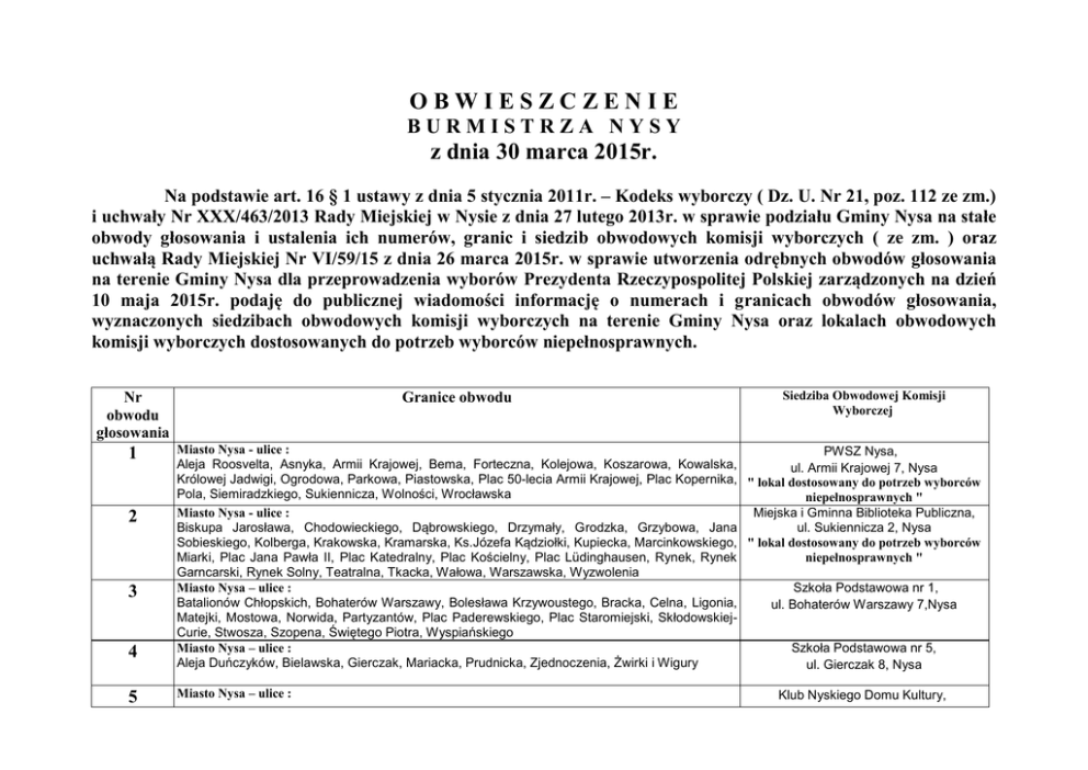 OBWIESZCZENIE BURMISTRZA NYSY z dnia 30 marca 2015r. Na podstawie art. 16 § 1 ustawy z dnia 5 stycznia 2011r. – Kodeks wyborczy ( Dz. U. Nr 21, poz. 112 ze zm.) i uchwały Nr XXX/463/2013 Rady Miejskiej w Nysie z dnia 27 lutego 2013r. w sprawie podziału Gminy Nysa na stałe obwody głosowania i ustalenia ich numerów, granic i siedzib obwodowych komisji wyborczych ( ze zm. ) oraz uchwałą Rady Miejskiej Nr VI/59/15 z dnia 26 marca 2015r. w sprawie utworzenia odrębnych obwodów głosowania na terenie Gminy Nysa dla przeprowadzenia wyborów Prezydenta Rzeczypospolitej Polskiej zarządzonych na dzień 10 maja 2015r. podaję do publicznej wiadomości informację o numerach i granicach obwodów głosowania, wyznaczonych siedzibach obwodowych komisji wyborczych na terenie Gminy Nysa oraz lokalach obwodowych komisji wyborczych dostosowanych do potrzeb wyborców niepełnosprawnych. Nr obwodu głosowania 1 2 3 4 5 Granice obwodu Siedziba Obwodowej Komisji Wyborczej Miasto Nysa - ulice : PWSZ Nysa, Aleja Roosvelta, Asnyka, Armii Krajowej, Bema, Forteczna, Kolejowa, Koszarowa, Kowalska, ul. Armii Krajowej 7, Nysa Królowej Jadwigi, Ogrodowa, Parkowa, Piastowska, Plac 50-lecia Armii Krajowej, Plac Kopernika, " lokal dostosowany do potrzeb wyborców Pola, Siemiradzkiego, Sukiennicza, Wolności, Wrocławska niepełnosprawnych " Miasto Nysa - ulice : Miejska i Gminna Biblioteka Publiczna, Biskupa Jarosława, Chodowieckiego, Dąbrowskiego, Drzymały, Grodzka, Grzybowa, Jana ul. Sukiennicza 2, Nysa Sobieskiego, Kolberga, Krakowska, Kramarska, Ks.Józefa Kądziołki, Kupiecka, Marcinkowskiego, " lokal dostosowany do potrzeb wyborców Miarki, Plac Jana Pawła II, Plac Katedralny, Plac Kościelny, Plac Lüdinghausen, Rynek, Rynek niepełnosprawnych " Garncarski, Rynek Solny, Teatralna, Tkacka, Wałowa, Warszawska, Wyzwolenia Miasto Nysa – ulice : Szkoła Podstawowa nr 1, Batalionów Chłopskich, Bohaterów Warszawy, Bolesława Krzywoustego, Bracka, Celna, Ligonia, ul. Bohaterów Warszawy 7,Nysa Matejki, Mostowa, Norwida, Partyzantów, Plac Paderewskiego, Plac Staromiejski, SkłodowskiejCurie, Stwosza, Szopena, Świętego Piotra, Wyspiańskiego Miasto Nysa – ulice : Szkoła Podstawowa nr 5, Aleja Duńczyków, Bielawska, Gierczak, Mariacka, Prudnicka, Zjednoczenia, Żwirki i Wigury ul. Gierczak 8, Nysa Miasto Nysa – ulice : Klub Nyskiego Domu Kultury, 6 7 8 9 10 11 12 13 14 22 Stycznia, Jagiellońska 1-13, Łukasińskiego, Kraszewskiego, Lompy, majora Sucharskiego, ul. Moniuszki 5, Nysa marszałka Piłsudskiego 2-43, Moniuszki, Orkana, Toruńska Miasto Nysa – ulice : Gimnazjum nr 2, Broniewskiego, Konopnickiej, Mickiewicza nieparzyste: 1-13, Prusa nieparzyste: 1-3B i parzyste: ul. Bolesława Prusa 14, Nysa 2-12, Sudecka nieparzyste: 1-do końca, parzyste:2-30 Miasto Nysa - ulice : Zespół Szkół i Placówek Oświatowych im. Fałata, Gałczyńskiego, Kasprowicza, Mickiewicza parzyste: 2-22, nieparzyste: 15-39, Emila Godlewskiego , Sienkiewicza, Słowackiego, Sudecka 32-do końca, Żeromskiego ul. Rodziewiczówny 1, Nysa " lokal dostosowany do potrzeb wyborców niepełnosprawnych " Miasto Nysa - ulice : Zespół Szkół i Placówek Oświatowych im. 3 Maja, Bazaltowa, Bursztynowa, Diamentowa, Granitowa, Jeziorna, Kamienna, Kryształowa, Emila Godlewskiego , Krzemieniecka, Lwowska, Mickiewicza parzyste: 26-do końca, nieparzyste: 43-do końca, ul. Rodziewiczówny 1, Nysa Nowogródzka, Orzeszkowej, Osmańczyka, Piaskowa, Powstańców Śląskich, Rodziewiczówny " lokal dostosowany do potrzeb wyborców parzyste: 4-12, Rubinowa, Słoneczna, Stanisławowska, Tarnopolska, Wileńska, Wiosenna, niepełnosprawnych " Żytomierska Miasto Nysa - ulice : Zespół Szkół i Placówek Oświatowych im. Korfantego, Księdza Bończyka, Opawska, Stęczyńskiego, Wasylewskiego Emila Godlewskiego , ul. Rodziewiczówny 1, Nysa " lokal dostosowany do potrzeb wyborców niepełnosprawnych " Miasto Nysa - ulice : Szkoła Podstawowa nr 10, 11 Listopada, Baczyńskiego, Boya Żeleńskiego, Brzechwy, Czesława Miłosza, Dygasińskiego, ul. 11 Listopada 6, Nysa Falskiego, Iwaszkiewicza, Komisji Edukacji Narodowej, Kozarzewskiego, Kozielska, Lelewela, " lokal dostosowany do potrzeb wyborców Leśmiana, Modrzewskiego, Nałkowskiej, Prusa nieparzyste: 9-do końca, parzyste:18-do końca, niepełnosprawnych " Przerwy-Tetmajera, Reja, Staffa, Tuwima Miasto Nysa - ulice : Ośrodek Pomocy Społecznej, ul. Komisji Korczaka, Kossaka, Kusocińskiego Edukacji Narodowej 1a, Nysa " lokal dostosowany do potrzeb wyborców niepełnosprawnych " Miasto Nysa – ulice : Ośrodek Inicjatyw Twórczych INVENTUS, 17 Września, Augustowska, Borelowskiego, Bzów, Chabrów, Chocimska, Długosza, Fredry, ul. Rodziewiczówny 18b, Nysa Gombrowicza, Grunwaldzka, Grzegorza z Sanoka, Gustawa Herlinga-Grudzińskiego, Henryka Pobożnego, Karpińskiego, Kisielewskiego, Kochanowskiego, Krasińskiego, Kwiatowa, Makuszyńskiego, Narcyzów, Niezapominajek, Obrońców Westerplatte, Ojców Werbistów, Pomorska, Przemyska, Pułaskiego, Rodziewiczówny nieparzyste: 1- do końca, parzyste: 12A- do końca, Róż, Stawowa, Stokrotek, Św. Arnolda Janssena, Tadka Jasińskiego, Unii Lubelskiej, Wańkowicza, Wołyńska, Zapolskiej, Zbaraska, Zygmuntowska Miasto Nysa - ulice : Szkoła Podstawowa nr 3, Baligrodzka, Czarneckiego, Dwernickiego, Głuchołaska, Konarskiego, Krawiecka, Księdza Skargi, ul. Krawiecka 6, Nysa Księdza Ściegiennego, marszałka Piłsudskiego 44-do końca, Rejtana, Sandomierska, Sanocka, Szczecińska, Świętojańska, Zawiszy Czarnego, Zwycięstwa Miasto Nysa - ulice : Hala Sportowa, 15 16 17 18 19 20 Chłopickiego, Damrota, Gdańska, Kruczkowskiego, Morcinka, Podolska, Reymonta Miasto Nysa – ulice : Bolesława Śmiałego, Dubois, Dzierżona, Jagiellońska:15-do końca, Karpacka, Mazowiecka, Niemcewicza, Nowowiejska, Plebiscytowa, Racławicka, Staszica, Strzelców Bytomskich, Towarowa, Traugutta, Waryńskiego, Władysława Jagiełły, Zagłoby, Zamojs