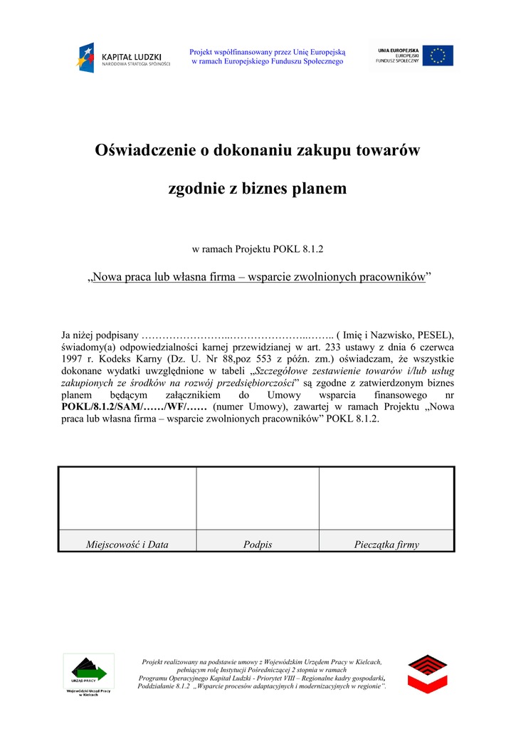Projekt współfinansowany przez Unię Europejską w ramach Europejskiego Funduszu Społecznego Oświadczenie o dokonaniu zakupu towarów zgodnie z biznes planem w ramach Projektu POKL 8.1.2 „Nowa praca lub własna firma – wsparcie zwolnionych pracowników” Ja niżej podpisany ……………………..…………………..…….. ( Imię i Nazwisko, PESEL), świadomy(a) odpowiedzialności karnej przewidzianej w art. 233 ustawy z dnia 6 czerwca 1997 r. Kodeks Karny (Dz. U. Nr 88,poz 553 z późn. zm.) oświadczam, że wszystkie dokonane wydatki uwzględnione w tabeli „Szczegółowe zestawienie towarów i/lub usług zakupionych ze środków na rozwój przedsiębiorczości” są zgodne z zatwierdzonym biznes planem będącym załącznikiem do Umowy wsparcia finansowego nr POKL/8.1.2/SAM/……/WF/…… (numer Umowy), zawartej w ramach Projektu „Nowa praca lub własna firma – wsparcie zwolnionych pracowników” POKL 8.1.2. Miejscowość i Data Podpis Pieczątka firmy Projekt realizowany na podstawie umowy z Wojewódzkim Urzędem Pracy w Kielcach, pełniącym rolę Instytucji Pośredniczącej 2 stopnia w ramach Programu Operacyjnego Kapitał Ludzki - Priorytet VIII – Regionalne kadry gospodarki, Poddziałanie 8.1.2 „Wsparcie procesów adaptacyjnych i modernizacyjnych w regionie”.