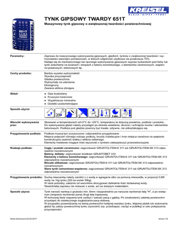 TYNK GIPSOWY TWARDY 651T Maszynowy tynk gipsowy o zwiększonej twardości powierzchniowej Parametry: Zaprawa do maszynowego wykonywania gipsowych, gładkich, tynków o zwiększonej twardości i wytrzymałości wewnątrz pomieszczeń, w których wilgotność użytkowa nie przekracza 70%. Nadaje się do mechanicznego lub ręcznego wykonywania gipsowych wypraw tynkarskich pod farby lub tynki szlachetne na ścianach i stropach z betonu komórkowego, z elementów ceramicznych, wapienno-piaskowych, betonowych itp. Cechy produktu: Bardzo wysoka wytrzymałość Wysoka przyczepność Gładka powierzchnia Wytrzymały na uderzenia Ekologiczny Zawiera włókna zbrojące Skład: ● ● ● ● Gips budowlany Kruszywo kwarcowe Wypełniacze mineralne Dodatki uszlachetniające Sposób użycia: Warunki wykonywania prac: Stosować w temperaturach od+5°C do +25°C, temperatury te dotyczą powietrza, podłoża i produktu. Do wykonywania gładzi należy przystąpić po okresie osiadania, skurczu i schnięcia murów i elementów betonowych. Podłoża pod gładzie powinny być trwałe, sztywne, nie odkształcające się. Przygotowanie podłoża: Podłoża muszą być oczyszczone i odpowiednio przygotowane. Miejsca połączeń różnego rodzaju podłoży, bruzdy instalacyjne i inne miejsca narażone na spękanie konstrukcyjne zazbroić siatką z włókna szklanego. Elementy metalowe mogące mieć styczność z tynkiem zabezpieczyć przeciwkorozyjnie. Rodzaje podłoża: Cegły i pustaki ceramiczne: zagruntować GRUNTOLITEM-K 311 lub GRUNTOLITEM-SK 313 odpowiednio rozcieńczonymi Betony, żelbety: zagruntować środkiem GRUNTOBET 310 Elementy z betonu komórkowego: zagruntować GRUNTOLITEM-K 311 lub GRUNTOLITEM-SK 313 odpowiednio rozcieńczonymi Bloczki silikatowe: zagruntować GRUNTOLITEM-K 311 lub GRUNTOLITEM-SK 313 odpowiednio rozcieńczonymi Stare tynki cementowo-wapienne: zagruntować GRUNTOLITEM-K 311 lub GRUNTOLITEM-SK 313 odpowiednio rozcieńczonymi Przygotowanie produktu: Suchą mieszankę należy zarobić z z wodą w agregacie albo za pomocą mieszadła, w proporcji 0,66l wody na 1kg tynku (20l na worek 30kg) W razie potrzeby, zależnie od warunków skorygować delikatnie ilość dodawanej wody. Stwardniałej zaprawy nie mieszać z woda, ani ze świeżym materiałem. Sposób użycia: Karta techniczna 02.02.2017 Tynk nanosić wartwą o grubości min. 8mm i bezpośrednio po narzucie wyrównać łatą "H", a po wstepnym związaniu wyrównać poraz drugi łatą trapezową. W końcowej fazie wiązania tynk zwilżyć i zatrzeć pacą z gąbką. Po zmatowieniu zatartej powierzchni przystapić do ostatecznego wygładzania pacą stalową. W przypadku przewidzianej na danej powierzchni kolejnej warstwy tynku, klejenia płytek lub wykonania gładzi itp zależy powierzchnię tynku zszorstnić (np. przedrapać, naciąć w jodełkę) w celu polepszenia przyczepności. strona 1/2 TYNK GIPSOWY TWARDY 651T Maszynowy tynk gipsowy o zwiększonej twardości powierzchniowej Uwagi wykonawcze: Po zakończeniu prac pomieszczenie wentylować Przechowywanie: Maksymalnie 6 miesięcy W miejscach suchych i w nieuszkodzonym opakowaniu. Parametry techniczne Zużycie Uziarnienie Czas obróbki Grubość warstwy Możliwość wykonywania dalszych prac Współczynnik przewodzenia ciepła Wytrzymałość na ściskanie 2 ok. 1,0 kg/m na 1 mm grubości warstwy zaprawy 0-1,2mm 180 minut (do pierwszego gładzenia) od 8mm minimum po 14 dniach schnięcia 0,32 (W/m*K) ≥ 6 MPa Twardość powierzchni ≥ 2,5 MPa Wytrzymałość na zginanie ≥ 2,0 MPa Przyczepność do podłoża ≥ 0,1 N/mm Reakcja na ogień A1 Wskazówki ogólne: Ta karta zastępuje wszystkie poprzednie wersje. Informacje zawarte w niniejszej karcie technicznej reprezentuje naszą aktualną wiedzę i praktyczne doświadczenie. Są to jedynie ogólne informacje i nie stanowią o odpowiedzialności producenta za wykonawstwo i sposób użytkowania. Mogą bowiem występować różnice i specyficzne warunki sposobu wykonania. Produkt należy stosować zgodnie z wymaganą wiedzą techniczną, oraz zasadami BHP. Należy unikać kontaktu ze skórą oraz chronić oczy. W przypadku kontaktu z oczami, przemyć je obficie czystą wodą i zasięgnąć porady lekarza. Zaleca się używanie rękawic, okularów i odzieży ochronnej. Karta techniczna 02.02.2017 2 strona 2/2