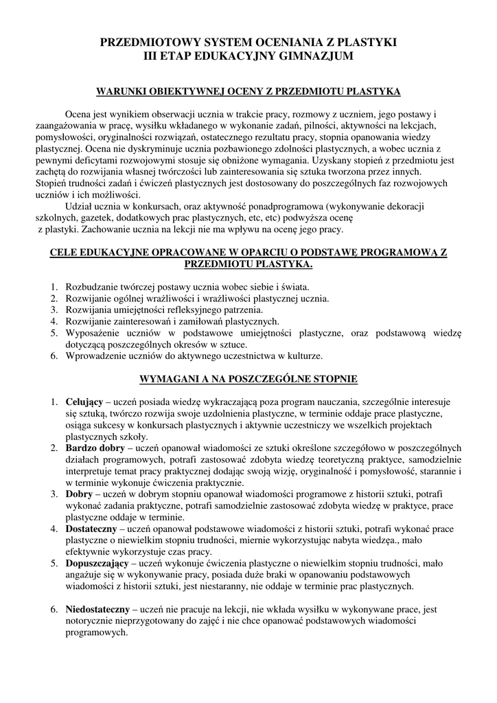 przedmiotowy system oceniania z plastyki iii etap edukacyjny