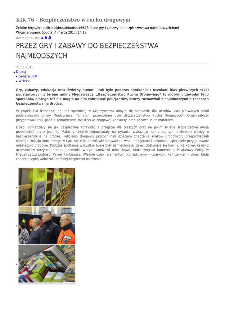 KIK 76 - Bezpieczeństwo w ruchu drogowym Źródło: http://brd.policja.pl/brd/aktualnosci/618,Przez-gry-i-zabawy-do-bezpieczenstwa-najmlodszych.html Wygenerowano: Sobota, 4 marca 2017, 14:17 Rozmiar tekstu: A A A PRZEZ GRY I ZABAWY DO BEZPIECZEŃSTWA NAJMŁODSZYCH ■ 21.11.2016 Drukuj Generuj PDF Wstecz ■ ■ Gry, zabawy, edukacja oraz świetny humor - tak było podczas spotkania z uczniami klas pierwszych szkół podstawowych z terenu gminy Międzyrzecz. „Bezpieczeństwo Ruchu Drogowego” to motyw przewodni tego spotkania, dlatego też nie mogło na nim zabraknąć policjantów, którzy rozmawiali z najmłodszymi o zasadach bezpieczeństwa na drodze. W piątek (18 listopada) na hali sportowej w Międzyrzeczu odbyło się spotkanie dla uczniów klas pierwszych szkół podstawowych gminy Międzyrzecz. Tematem przewodnim było „Bezpieczeństwo Ruchu Drogowego”. Organizatorzy przygotowali trzy panele tematyczne: miasteczko drogowe, konkursy oraz zabawa z animatorami. Dzieci dowiedziały się jak bezpiecznie korzystać z przejścia dla pieszych oraz na jakim świetle sygnalizatora mogą przechodzić przez jezdnię. Maluchy chętnie odpowiadały na pytania, wykazując się znacznym poziomem wiedzy o bezpieczeństwie na drodze. Policjanci drogówki przypominali dzieciom znaczenie znaków drogowych, przeprowadzali różnego rodzaju konkurencje w tym zakresie. Uczniowie sprawdzali swoje umiejętności pokonując specjalnie przygotowane miasteczko drogowe. Podczas spotkania wszystkie buzie były uśmiechnięte, dzieci doskonale się bawiły. Na koniec każdy z uczestników otrzymał drobne upominki, w tym kamizelki odblaskowe, które wręczał Komendant Powiatowy Policji w Międzyrzeczu podinsp. Paweł Rynkiewicz. Właśnie dzięki elementom odblaskowym – opaskom, kamizelkom – dzieci będą znacznie lepiej widoczni i bardziej bezpieczni na drodze. ■ ■ ■ ■ ■ ■ ■ ■ ■ ■ ■ ■ ■ ■ ■ ■ ■ ■ ■ ■ ■ ■ Ocena tekstu: Tagi: Ocena: 0/5 (0) Poleć artykuł: Kategorie: