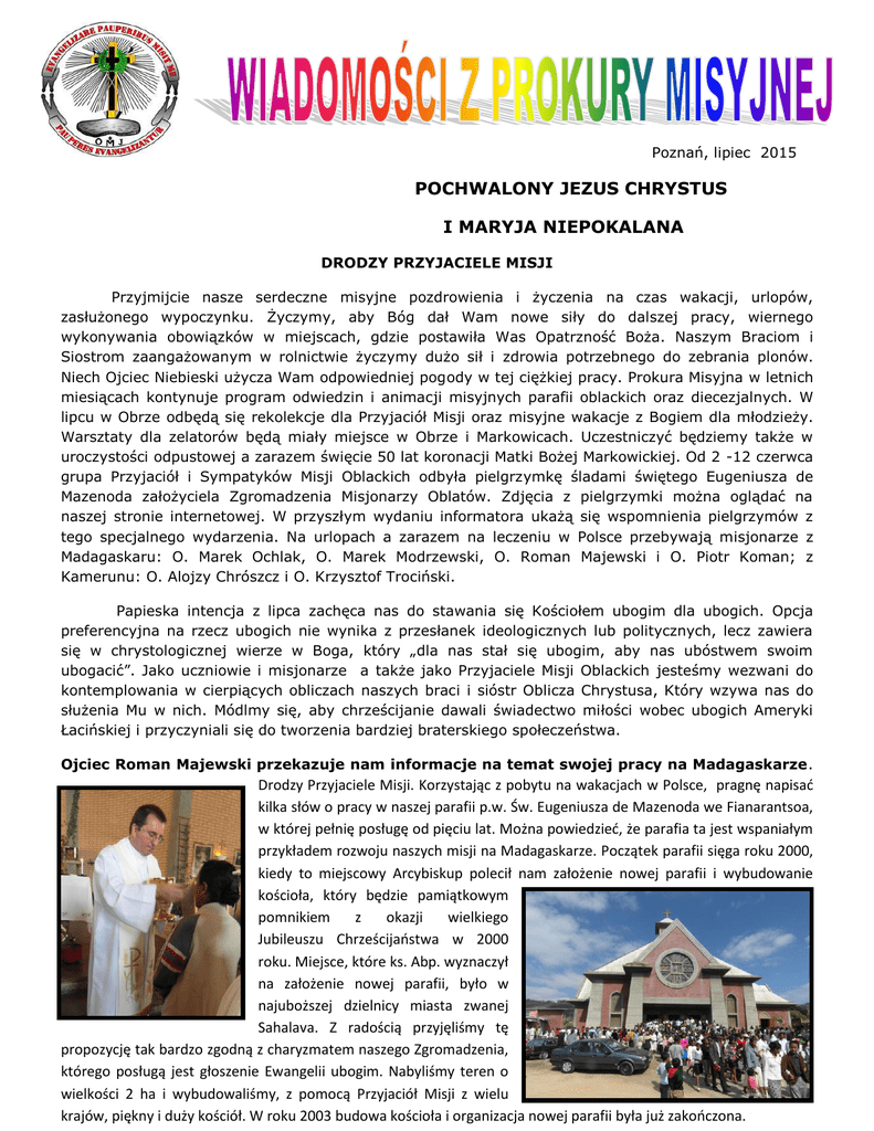 Poznań, lipiec 2015 POCHWALONY JEZUS CHRYSTUS I MARYJA NIEPOKALANA DRODZY PRZYJACIELE MISJI Przyjmijcie nasze serdeczne misyjne pozdrowienia i życzenia na czas wakacji, urlopów, zasłużonego wypoczynku. Życzymy, aby Bóg dał Wam nowe siły do dalszej pracy, wiernego wykonywania obowiązków w miejscach, gdzie postawiła Was Opatrzność Boża. Naszym Braciom i Siostrom zaangażowanym w rolnictwie życzymy dużo sił i zdrowia potrzebnego do zebrania plonów. Niech Ojciec Niebieski użycza Wam odpowiedniej pogody w tej ciężkiej pracy. Prokura Misyjna w letnich miesiącach kontynuje program odwiedzin i animacji misyjnych parafii oblackich oraz diecezjalnych. W lipcu w Obrze odbędą się rekolekcje dla Przyjaciół Misji oraz misyjne wakacje z Bogiem dla młodzieży. Warsztaty dla zelatorów będą miały miejsce w Obrze i Markowicach. Uczestniczyć będziemy także w uroczystości odpustowej a zarazem święcie 50 lat koronacji Matki Bożej Markowickiej. Od 2 -12 czerwca grupa Przyjaciół i Sympatyków Misji Oblackich odbyła pielgrzymkę śladami świętego Eugeniusza de Mazenoda założyciela Zgromadzenia Misjonarzy Oblatów. Zdjęcia z pielgrzymki można oglądać na naszej stronie internetowej. W przyszłym wydaniu informatora ukażą się wspomnienia pielgrzymów z tego specjalnego wydarzenia. Na urlopach a zarazem na leczeniu w Polsce przebywają misjonarze z Madagaskaru: O. Marek Ochlak, O. Marek Modrzewski, O. Roman Majewski i O. Piotr Koman; z Kamerunu: O. Alojzy Chrószcz i O. Krzysztof Trociński. Papieska intencja z lipca zachęca nas do stawania się Kościołem ubogim dla ubogich. Opcja preferencyjna na rzecz ubogich nie wynika z przesłanek ideologicznych lub politycznych, lecz zawiera się w chrystologicznej wierze w Boga, który „dla nas stał się ubogim, aby nas ubóstwem swoim ubogacić”. Jako uczniowie i misjonarze a także jako Przyjaciele Misji Oblackich jesteśmy wezwani do kontemplowania w cierpiących obliczach naszych braci i sióstr Oblicza Chrystusa, Który wzywa nas do służenia Mu w nich. Módlmy się, aby chrześcijanie dawali świadectwo miłości wobec ubogich Ameryki Łacińskiej i przyczyniali się do tworzenia bardziej braterskiego społeczeństwa. Ojciec Roman Majewski przekazuje nam informacje na temat swojej pracy na Madagaskarze. Drodzy Przyjaciele Misji. Korzystając z pobytu na wakacjach w Polsce, pragnę napisać kilka słów o pracy w naszej parafii p.w. Św. Eugeniusza de Mazenoda we Fianarantsoa, w której pełnię posługę od pięciu lat. Można powiedzieć, że parafia ta jest wspaniałym przykładem rozwoju naszych misji na Madagaskarze. Początek parafii sięga roku 2000, kiedy to miejscowy Arcybiskup polecił nam założenie nowej parafii i wybudowanie kościoła, który będzie pamiątkowym pomnikiem z okazji wielkiego Jubileuszu Chrześcijaństwa w 2000 roku. Miejsce, które ks. Abp. wyznaczył na założenie nowej parafii, było w najuboższej dzielnicy miasta zwanej Sahalava. Z radością przyjęliśmy tę propozycję tak bardzo zgodną z charyzmatem naszego Zgromadzenia, którego posługą jest głoszenie Ewangelii ubogim. Nabyliśmy teren o wielkości 2 ha i wybudowaliśmy, z pomocą Przyjaciół Misji z wielu krajów, piękny i duży kościół. W roku 2003 budowa kościoła i organizacja nowej parafii była już zakończona. Obecnie, po dwunastu latach działalności duszpasterskiej w parafii, możemy zauważyć, że dużo się zmieniło, nie tylko wśród chrześcijan, ale również w życiu całej dzielnicy Sahalava. Przede wszystkim należy powiedzieć, że parafia liczy już ok. 6 tys. wiernych. Wśród nich jest wielu, którzy mocno angażują się w działalność duszpasterską i socjalną. Wspaniale współpracują z kapłanami i pomagają sobie nawzajem. Można powiedzieć, że ta bardzo uboga dzielnica, niepokojona częstymi atakami bandytów i złodziei, stała się miejscem o wiele bardziej spokojnym i bezpiecznym. Często słyszeliśmy słowa: „proszę Ojca, z chwilą powstania parafii w naszej dzielnicy wiele się zmieniło...” Wierzymy, że to Pan Bóg działa w sercach ludzi, którzy otwierają się na Jego Słowo. W naszym kościele często można spotkać ludzi modlących się; są to pojedyncze osoby, ale jest też wiele zorganizowanych grup takich jak: kółka różańcowe, apostołowie Miłosierdzia Bożego, ministranci, skauci, chór, ruch eucharystyczny dla dzieci, grupy zajmujące się liturgią, katechezą i działalnością socjalną. Osoby starsze i chorzy z naszej parafii otrzymują regularną pomoc duchową i materialną: kapłan odwiedza ich w każdy I piątek miesiąca; świeccy natomiast zajmują się towarzyszeniem duchowym. Są również regularne posiłki i jest organizowana potrzebna pomoc medyczna. Około 600 dzieci uczęszcza na katechezę, którą z pomocą katechetów świeckich prowadzimy w budynkach jednej z pobliskich szkół podstawowych. Wielu dzieciom pomagamy w nauce, opłacamy szkołę i zakupujemy potrzebne przybory, bo rodzice są bardzo biedni i często ich na to nie stać. Jednym słowem dużo rzeczy dzieje się w naszej parafii i to ma pozytywny wpływ na całe środowisko. Moglibyśmy tę działalność rozwijać jeszcze bardziej, ponieważ potrzeb jest bardzo dużo, lecz nie mamy jeszcze odpowiednich warunków. Brakuje nam domu parafialnego z dużą salą, gdzie moglibyśmy prowadzić działalność duszpasterską i socjalną na szerszą skalę. Nie ma też domu dla duszpasterzy, tzw plebanii. Obecnie mieszkamy w małym budynku przerobionym z dawnej salki katechetycznej. Ale mimo to Pan nam błogosławi i możemy cieszyć się z rozwoju parafii. Od trzech lat gromadzimy środki potrzebne na budowę domu parafialnego i dziś z radością możemy powiedzieć, że dzięki łasce Bożej i pomocy Przyjaciół naszych misji, budowa będzie mogła rozpocząć się pod koniec tego roku. Wiemy jednak, że przedsięwzięcie jest duże i niełatwe, dlatego proszę Was