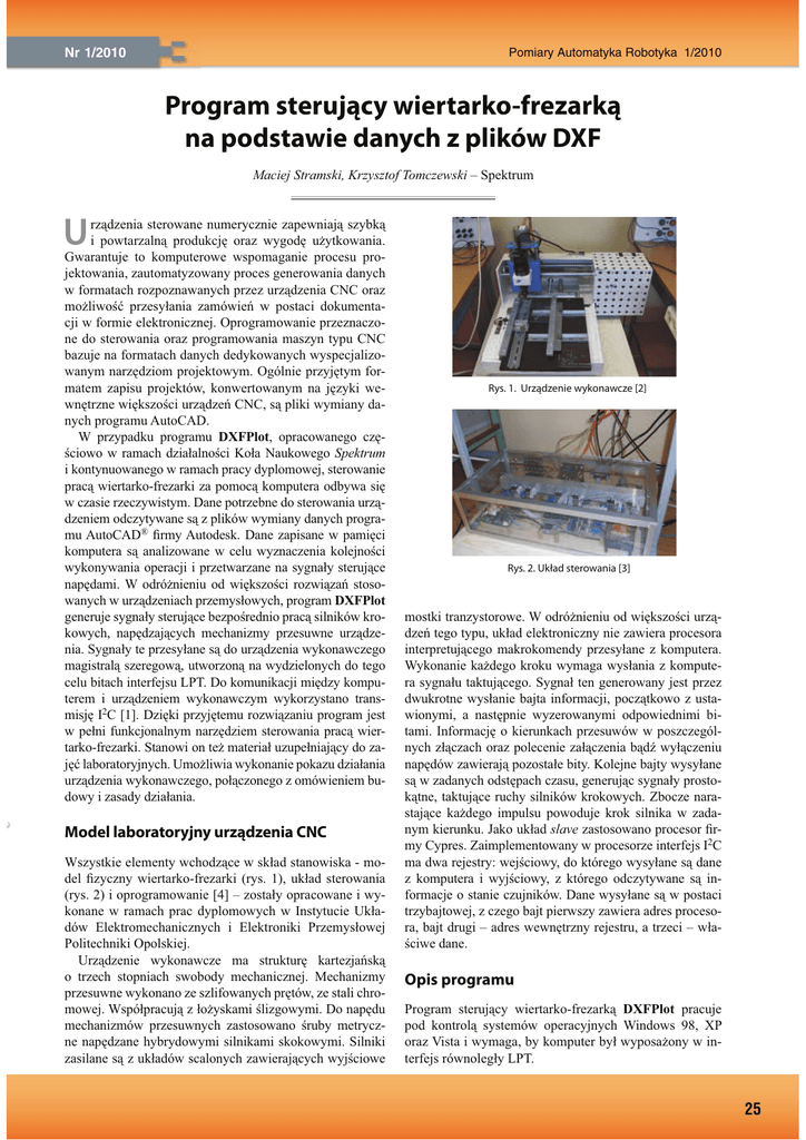 Nr 1/2010 Pomiary Automatyka Robotyka 1/2010 Program sterujący wiertarko-frezarką na podstawie danych z plików DXF Maciej Stramski, Krzysztof Tomczewski – Spektrum rządzenia sterowane numerycznie zapewniają szybką i powtarzalną produkcję oraz wygodę użytkowania. Gwarantuje to komputerowe wspomaganie procesu projektowania, zautomatyzowany proces generowania danych w formatach rozpoznawanych przez urządzenia CNC oraz możliwość przesyłania zamówień w postaci dokumentacji w formie elektronicznej. Oprogramowanie przeznaczone do sterowania oraz programowania maszyn typu CNC bazuje na formatach danych dedykowanych wyspecjalizowanym narzędziom projektowym. Ogólnie przyjętym formatem zapisu projektów, konwertowanym na języki wewnętrzne większości urządzeń CNC, są pliki wymiany danych programu AutoCAD. W przypadku programu DXFPlot, opracowanego częściowo w ramach działalności Koła Naukowego Spektrum i kontynuowanego w ramach pracy dyplomowej, sterowanie pracą wiertarko-frezarki za pomocą komputera odbywa się w czasie rzeczywistym. Dane potrzebne do sterowania urządzeniem odczytywane są z plików wymiany danych programu AutoCAD® firmy Autodesk. Dane zapisane w pamięci komputera są analizowane w celu wyznaczenia kolejności wykonywania operacji i przetwarzane na sygnały sterujące napędami. W odróżnieniu od większości rozwiązań stosowanych w urządzeniach przemysłowych, program DXFPlot generuje sygnały sterujące bezpośrednio pracą silników krokowych, napędzających mechanizmy przesuwne urządzenia. Sygnały te przesyłane są do urządzenia wykonawczego magistralą szeregową, utworzoną na wydzielonych do tego celu bitach interfejsu LPT. Do komunikacji między komputerem i urządzeniem wykonawczym wykorzystano transmisję I2C [1]. Dzięki przyjętemu rozwiązaniu program jest w pełni funkcjonalnym narzędziem sterowania pracą wiertarko-frezarki. Stanowi on też materiał uzupełniający do zajęć laboratoryjnych. Umożliwia wykonanie pokazu działania urządzenia wykonawczego, połączonego z omówieniem budowy i zasady działania. Model laboratoryjny urządzenia CNC Wszystkie elementy wchodzące w skład stanowiska - model fizyczny wiertarko-frezarki (rys. 1), układ sterowania (rys. 2) i oprogramowanie [4] – zostały opracowane i wykonane w ramach prac dyplomowych w Instytucie Układów Elektromechanicznych i Elektroniki Przemysłowej Politechniki Opolskiej. Urządzenie wykonawcze ma strukturę kartezjańską o trzech stopniach swobody mechanicznej. Mechanizmy przesuwne wykonano ze szlifowanych prętów, ze stali chromowej. Współpracują z łożyskami ślizgowymi. Do napędu mechanizmów przesuwnych zastosowano śruby metryczne napędzane hybrydowymi silnikami skokowymi. Silniki zasilane są z układów scalonych zawierających wyjściowe Rys. 1. Urządzenie wykonawcze [2] Rys. 2. Układ sterowania [3] mostki tranzystorowe. W odróżnieniu od większości urządzeń tego typu, układ elektroniczny nie zawiera procesora interpretującego makrokomendy przesyłane z komputera. Wykonanie każdego kroku wymaga wysłania z komputera sygnału taktującego. Sygnał ten generowany jest przez dwukrotne wysłanie bajta informacji, początkowo z ustawionymi, a następnie wyzerowanymi odpowiednimi bitami. Informację o kierunkach przesuwów w poszczególnych złączach oraz polecenie załączenia bądź wyłączeniu napędów zawierają pozostałe bity. Kolejne bajty wysyłane są w zadanych odstępach czasu, generując sygnały prostokątne, taktujące ruchy silników krokowych. Zbocze narastające każdego impulsu powoduje krok silnika w zadanym kierunku. Jako układ slave zastosowano procesor firmy Cypres. Zaimplementowany w procesorze interfejs I2C ma dwa rejestry: wejściowy, do którego wysyłane są dane z komputera i wyjściowy, z którego odczytywane są informacje o stanie czujników. Dane wysyłane są w postaci trzybajtowej, z czego bajt pierwszy zawiera adres procesora, bajt drugi – adres wewnętrzny rejestru, a trzeci – właściwe dane. Opis programu Program sterujący wiertarko-frezarką DXFPlot pracuje pod kontrolą systemów operacyjnych Windows 98, XP oraz Vista i wymaga, by komputer był wyposażony w interfejs równoległy LPT. 25 Forum Młodych Pomiary Automatyka Robotyka 1/2010 Program DXFPlot wykorzystuje opracowaną klasę Drawing z zaimplementowanymi algorytmami odczytu danych z plików DXF (Data eXchange File), algorytmami generowania encji zawartych w projektach CAD oraz algorytmami sterowania napędami wiertarko-frezarki. Dane w plikach DXF zapisane są w postaci tekstowej w formacie ASCII. Struktura formatu podzielona jest na siedem sekcji. Każda sekcja odpowiada za konkretne części projektu CAD i cechuje się indywidualnymi strukturami. Najważniejszą jest sekcja ENTITIES zawierająca wszelkie dane dotyczące obiektów graficznych występujących w projekcie. Każdy obiekt graficzny, zapisany w postaci danych wektorowych, nazwany jest encją, a każda zmienna charakteryzująca encję zapisana jest w dwóch liniach zawierających tzw. kod grupowy oraz wartość zmiennej [5]. Interfejs graficzny (rys. 3) umożliwia podgląd rysunku zawartego w projekcie w pliku DXF oraz rozpoczęcie, wstrzymanie i zakończenie pracy urządzenia. Istnieje możliwość zmiany niektórych parametrów projektu, jak dobór skali, przesunięcie punktu bazowego, zmiana grubości wiertła lub frezu. Po rozpoczęciu pracy urządzenia, interfejs graficzny gwarantuje podgląd postępów pracy oraz aktualne wartości współrzędnych położenia głowicy. Podsumowanie Program DXFPlot wraz z urządzeniem wykonawczym stanowi w pełni funkcjonalne stanowisko dydaktyczne umożliwiające wiercenie i frezowanie. Przeprowadzone próby frezowania różnego typu rysunków w poliwęglanie świadczą o dużej dokładności urządzenia (teoretyczna rozdzielczość ruchu wynosi poniżej 50 μm). Liczne testy wykazały, że program nadaje się do reali