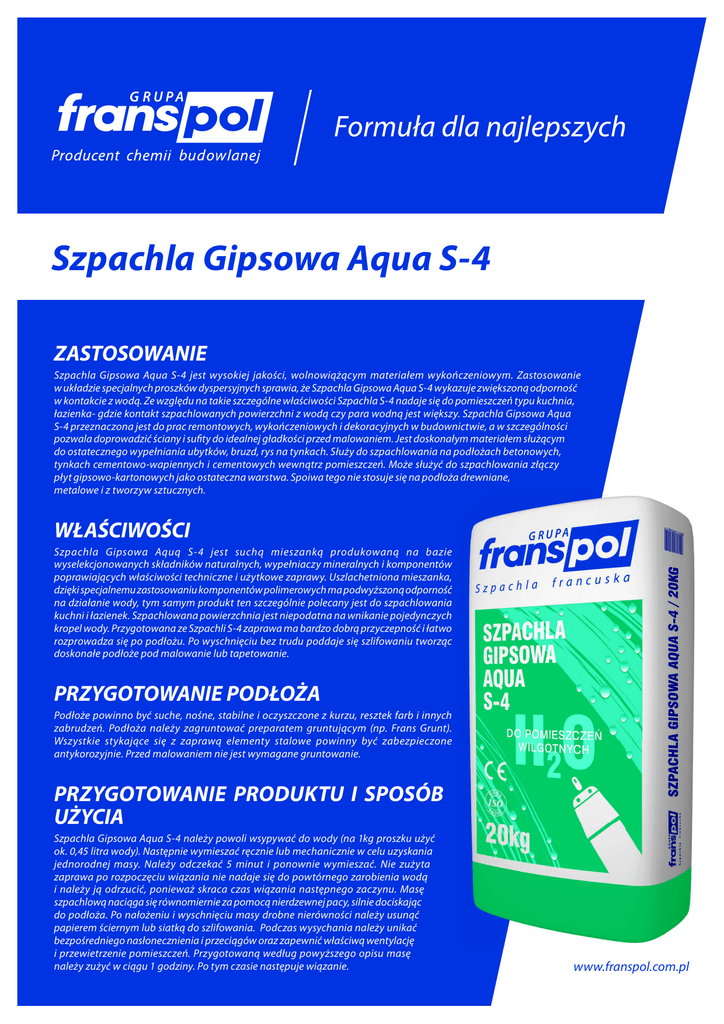Szpachla Gipsowa Aqua S-4 ZASTOSOWANIE Szpachla Gipsowa Aqua S-4 jest wysokiej jakości, wolnowiążącym materiałem wykończeniowym. Zastosowanie w układzie specjalnych proszków dyspersyjnych sprawia, że Szpachla Gipsowa Aqua S-4 wykazuje zwiększoną odporność w kontakcie z wodą. Ze względu na takie szczególne właściwości Szpachla S-4 nadaje się do pomieszczeń typu kuchnia, łazienka- gdzie kontakt szpachlowanych powierzchni z wodą czy para wodną jest większy. Szpachla Gipsowa Aqua S-4 przeznaczona jest do prac remontowych, wykończeniowych i dekoracyjnych w budownictwie, a w szczególności pozwala doprowadzić ściany i sufity do idealnej gładkości przed malowaniem. Jest doskonałym materiałem służącym do ostatecznego wypełniania ubytków, bruzd, rys na tynkach. Służy do szpachlowania na podłożach betonowych, tynkach cementowo-wapiennych i cementowych wewnątrz pomieszczeń. Może służyć do szpachlowania złączy płyt gipsowo-kartonowych jako ostateczna warstwa. Spoiwa tego nie stosuje się na podłoża drewniane, metalowe i z tworzyw sztucznych. WŁAŚCIWOŚCI Szpachla Gipsowa Aquq S-4 jest suchą mieszanką produkowaną na bazie wyselekcjonowanych składników naturalnych, wypełniaczy mineralnych i komponentów poprawiających właściwości techniczne i użytkowe zaprawy. Uszlachetniona mieszanka, dzięki specjalnemu zastosowaniu komponentów polimerowych ma podwyższoną odporność na działanie wody, tym samym produkt ten szczególnie polecany jest do szpachlowania kuchni i łazienek. Szpachlowana powierzchnia jest niepodatna na wnikanie pojedynczych kropel wody. Przygotowana ze Szpachli S-4 zaprawa ma bardzo dobrą przyczepność i łatwo rozprowadza się po podłożu. Po wyschnięciu bez trudu poddaje się szlifowaniu tworząc doskonałe podłoże pod malowanie lub tapetowanie. PRZYGOTOWANIE PODŁOŻA Podłoże powinno być suche, nośne, stabilne i oczyszczone z kurzu, resztek farb i innych zabrudzeń. Podłoża należy zagruntować preparatem gruntującym (np. Frans Grunt). Wszystkie stykające się z zaprawą elementy stalowe powinny być zabezpieczone antykorozyjnie. Przed malowaniem nie jest wymagane gruntowanie. PRZYGOTOWANIE PRODUKTU I SPOSÓB UŻYCIA Szpachla Gipsowa Aqua S-4 należy powoli wsypywać do wody (na 1kg proszku użyć ok. 0,45 litra wody). Następnie wymieszać ręcznie lub mechanicznie w celu uzyskania jednorodnej masy. Należy odczekać 5 minut i ponownie wymieszać. Nie zużyta zaprawa po rozpoczęciu wiązania nie nadaje się do powtórnego zarobienia wodą i należy ją odrzucić, ponieważ skraca czas wiązania następnego zaczynu. Masę szpachlową naciąga się równomiernie za pomocą nierdzewnej pacy, silnie dociskając do podłoża. Po nałożeniu i wyschnięciu masy drobne nierówności należy usunąć papierem ściernym lub siatką do szlifowania. Podczas wysychania należy unikać bezpośredniego nasłonecznienia i przeciągów oraz zapewnić właściwą wentylację i przewietrzenie pomieszczeń. Przygotowaną według powyższego opisu masę należy zużyć w ciągu 1 godziny. Po tym czasie następuje wiązanie. www.franspol.com.pl PRZECHOWYWANIE I TRANSPORT Szpachla Gipsowa Aqua S-4 należy przewozić i przechowywać w szczelnie zamkniętych workach, na paletach, w suchych warunkach. Chronić przed wilgocią. Nieprzestrzeganie w/w zaleceń może mieć wpływ na parametry użytkowe produktu. Okres przydatności do użycia wynosi 9 miesięcy od daty produkcji umieszczonej na worku. DANE TECHNICZNE Stopień twardości przy szlifowaniu Grubość jednej warstwy Kolor Zużycie kg/m2 przy 1mm grubości średnio twardy max. 3mm biały 1,0 Proporcje składników w zaprawie: ok. 9 litrów wody na 20kg gipsu Czas zużycia zaprawy: 60min Przyczepność do podłoża: nie mniej niż 0,1MPa Wytrzymałość na zginanie: nie mniej niż 1,0MPa Wytrzymałość na ściskanie: nie mniej niż 2,0MPa Izolacja od dźwięków powietrznych: NPD Izolacja cieplna: NPD Reakcja na ogień: A1 Temperatura podłoża i otoczenia: od +5°C do +25°C Max. grubość jednej warstwy: 3mm Wyrób spełnia wymagania PN-EN 13279-1:2008 Wyrób posiada atest PZH OPAKOWANIE Worki papierowe 20kg, 5kg. UWAGA Szpachla Gipsowa Aqua S-4 jest produktem nietoksycznym w trakcie użycia i podczas eksploatacji, mimo to należy stosować odpowiednie środki ochronne. Należy chronić oczy, układ oddechowy i skórę. W przypadku bezpośredniego kontaktu przemyć dużą ilością wody. W przypadku wystąpienia jakichkolwiek negatywnych objawów należy skontaktować się z lekarzem. Chronić przed dziećmi. Karta charakterystyki dostępna na żądanie użytkownika. Producent nie ponosi odpowiedzialności za skutki powstałe w wyniku użycia wyrobu niezgodnie z powyższymi wskazówkami, zasadami sztuki budowlanej oraz przepisami BHP. Franspol Sp. z o.o. ul. Fabryczna 10 62-510 Konin tel. 63/ 240 85 53 fax 63/ 240 85 17 www.franspol.com.pl Szpachla Gipsowa Aqua S-4 www.franspol.com.pl