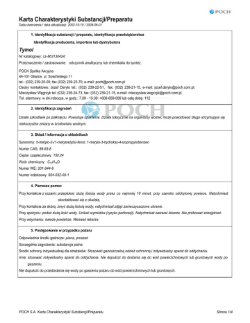 Karta Charakterystyki Substancji/Preparatu Data utworzenia / data aktualizacji: 2002-10-15 / 2008-06-01 1. Identyfikacja substancji / preparatu, identyfikacja przedsiębiorstwa Identyfikacja producenta, importera lub dystrybutora Tymol Nr katalogowy: cz-863130424; Przeznaczenie / zastosowanie: odczynnik analityczny lub chemikalia do syntez. POCH Spółka Akcyjna 44-101 Gliwice, ul. Sowińskiego 11 tel.: (032) 239-20-00; fax (032) 239-23-70; e-mail: [email protected] Osoby kontaktowe: Józef Deryło tel.: (032) 239-22-51, fax: (032) 239-21-15, e-mail: [email protected]; Mieczysław Węgrzyk tel.:(032) 239-24-73, fax: (032) 239-21-15, e-mail: [email protected] Tel. alarmowy: w dni robocze, w godz.: 7.00 - 15.00: +606-659-006 lub całą dobę: 112 2. Identyfikacja zagrożeń Działa szkodliwie po połknięciu. Powoduje oparzenia. Działa toksycznie na organizmy wodne; może powodować długo utrzymujące się niekorzystne zmiany w środowisku wodnym. 3. Skład / informacja o składnikach Synonimy: 5-metylo-2-(1-metyloetylo)-fenol, 1-metylo-3-hydroksy-4-izopropylobenzen Numer CAS: 89-83-8 Ciężar cząsteczkowy: 150.24 Wzór chemiczny: C10H14O Numer WE: 201-944-8 Numer indeksowy: 604-032-00-1 4. Pierwsza pomoc Przy kontakcie z oczami: przepłukać dużą ilością wody przez co najmniej 10 minut, przy szeroko odchylonej powiece. Natychmiast skontaktować się z okulistą. Przy kontakcie ze skórą: zmyć dużą ilością wody, natychmiast zdjąć zanieczyszczone ubranie. Przy spożyciu: podać dużą ilość wody. Unikać wymiotów (ryzyko perforacji). Natychmiast wezwać lekarza. Nie próbować zobojętniać. Przy wdychaniu: świeże powietrze. Wezwać lekarza. 5. Postępowanie w przypadku pożaru Odpowiednie środki gaśnicze: piana, proszek Szczególne zagrożenia: substancja palna. Środki ochrony indywidualnej dla strażaków: Stosować gazoszczelną odzież ochronną i indywidualny aparat do oddychania. Inne: stosować indywidualny aparat do oddychania. Nie dopuścić do dostania się do wód powierzchniowych lub gruntowych wody po gaszeniu. Nie dopuścić do przedostania się wody po gaszeniu pożaru do wód powierzchniowych lub gruntowych. POCH S.A. Karta Charakterystyki Substancji/Preparatu. Strona 1/4 Tymol 6. Postępowanie w przypadku niezamierzonego uwolnienia do środowiska "Unikać zanieczyszczenia substancją. Unikać tworzenia pyłów; nie wdychać pyłów. Nie dopuścić do dostania się do kanalizacji. Zebrać na sucho, przekazać do likwidacji. Oczyścić skażony teren." Nie dopuścić do dostania się do wód, ścieków i gleby. 7. Postępowanie z substancją / preparatem i jej / jego magazynowanie Obchodzenie się z substancją: Zapewnić skuteczną wymianę powietrza (wentylacja). Postępować zgodnie z zasadami dobrej praktyki przemysłowej oraz ogólnymi zasadami bezpieczeństwa i higieny pracy z substancjami chemicznymi. Stosować środki ochrony osobistej zgodnie z pkt.8. Nie opróżniać do kanalizacji. Postępować zgodnie z zasadami obchodzenia się z substancjami żrącymi. Magazynowanie: szczelne opakowania, suche dobrze wentylowane pomieszczenie. Temperatura pokojowa (zalecane +15 do +25°C) Rozporządzenie Ministra Zdrowia z dnia 14 marca 2003 r. w sprawie sposobu oznakowania miejsc, rurociągów oraz pojemników i zbiorników służących do przechowywania lub zawierających substancje niebezpieczne lub preparaty niebezpieczne (Dz.U.03.61.552) 8. Kontrola narażenia i środki ochrony indywidualnej Paramerty kontroli (NDS, NDSCh, NDSP): nie ustalone. Stosować odpowiednią wentylację wywiewną, miejscową i ogólną zapewniającą utrzymanie stężenia produktu w powietrzu poniżej określonych limitów. Zaleca się wyposażenie miejsca pracy w wodny natrysk do płukania oczu oraz prysznic. Środki ochrony indywidualnej powinny być tak zaprojektowane i wykonane aby wykluczały zagrożenie i inne niedogodności w przewidywanych warunkach użytkowania, chroniące przed chemikaliami. Środki ochrony indywidualnej: ochrona dróg oddechowych: konieczna w przypadku pylenia - respirator ochrona oczu: konieczna - okulary ochronne typu gogle ochrona rąk: konieczna - rękawice ochronne odporne na działanie chemikaliów wykonane z gumy nitrylowej lub inne dopuszczone przez producenta rękawic do kontaktu z tym produktem. Czas wytrzymałości materiału określa producent rękawic. ochrona ciała: konieczna - ubranie ochronne środki ochronne i higieny: natychmiast zmienić skażone ubranie. Stosować krem barierowo-ochronny do skóry. Wymyć ręce i twarz po pracy z tą substancją. Rozporządzenie Ministra Zdrowia z dnia 30 grudnia 2004 r. w sprawie bezpieczeństwa i higieny pracy związanej z występowaniem w miejscu pracy czynników chemicznych (Dz.U.05.11.86). Rozporządzenie Ministra Pracy i Polityki Społecznej z dnia 30 sierpnia 2007 (Dz. U. nr 161, poz. 1142) 9. Właściwości fizyczne i chemiczne Forma: ciało stałe lepkość dynamiczna: Kolor: bezbarwny lepkość kinematyczna: 4,3 mm3/s (50°C) Zapach: charakterystyczny Ciśnienie par: 2,5 hPa (50°C) pH: 5 - 7 (0,8 g/l H2O, 20°C) Gęstość: 0,97 g/cm3 (20°C) Temperatura topnienia: 49 - 51°C Ciężar nasypowy: około 600 kg/m3 Temperatura wrzenia: 233°C (1013 hPa) Rozpuszczalność: Temperatura samozapłonu: 285°C w wodzie: 0,98 g/l (25°C) Temperatura zapłonu: 104°C w rozpuszczalnikach organicznych: etanol - 1000 g/l (25°C), eter - 667 g/l (25 Granice wybuchowości: log P(w/o): 3,30 dolna: brak danych górna: brak danych POCH S.A. Karta Charakterystyki Substancji/Preparatu. Strona 2/4 Tymol 10. Stabilność i reaktywność Warunki których należy unikać: Materiały których należy unikać: silne utleniacze, silne zasady. Niebezpieczne produkty rozkładu: Następne dane: 11. Informacje toksykologiczne Informacje toksykologiczne: LD50(doustnie szczury): 980 mg/kg, LD50(skóra szczur): >2000 mg/kg Pozostałe dane: substancja występująca w przyrodzie; przy kontakcie z oczami: oparzenia; przy k