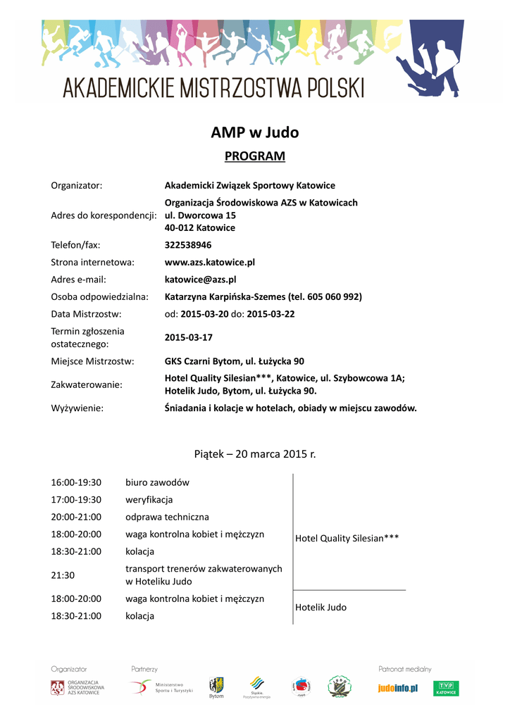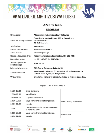AMP w Judo PROGRAM Organizator: Akademicki Związek Sportowy Katowice Organizacja Środowiskowa AZS w Katowicach Adres do korespondencji: ul. Dworcowa 15 40-012 Katowice Telefon/fax: 322538946 Strona internetowa: www.azs.katowice.pl Adres e-mail: [email protected] Osoba odpowiedzialna: Katarzyna Karpińska-Szemes (tel. 605 060 992) Data Mistrzostw: od: 2015-03-20 do: 2015-03-22 Termin zgłoszenia ostatecznego: 2015-03-17 Miejsce Mistrzostw: GKS Czarni Bytom, ul. Łużycka 90 Zakwaterowanie: Hotel Quality Silesian***, Katowice, ul. Szybowcowa 1A; Hotelik Judo, Bytom, ul. Łużycka 90. Wyżywienie: Śniadania i kolacje w hotelach, obiady w miejscu zawodów. Piątek – 20 marca 2015 r. 16:00-19:30 biuro zawodów 17:00-19:30 weryfikacja 20:00-21:00 odprawa techniczna 18:00-20:00 waga kontrolna kobiet i mężczyzn 18:30-21:00 kolacja 21:30 transport trenerów zakwaterowanych w Hoteliku Judo 18:00-20:00 waga kontrolna kobiet i mężczyzn 18:30-21:00 kolacja Hotel Quality Silesian*** Hotelik Judo Sobota – 21 marca 2015 r. Rozgrywane kategorie wagowe: kobiety: <63 kg, <70 kg, <78 kg, +78 kg mężczyźni: <81 kg, <90 kg <100 kg, +100 kg 8:00-19:00 biuro zawodów GKS Czarni Bytom 6:30-7:30 waga kontrolna i oficjalna kobiet i mężczyzn 7:00-9:30 śniadanie 8:30 transport do GKS Czarni Bytom – startujący w sobotę 9:45-11:00 transport do GKS Czarni Bytom – pozostali 8:30-9:00 waga kontrolna i oficjalna kobiet i mężczyzn GKS Czarni Bytom 7:00-9:30 śniadanie Kawiarenka u Judoków 9:45 losowanie listy walk kobiet i mężczyzn 10:30 walki mężczyzn ok. 12:30 ceremonia otwarcia AMP 13:00 walki kobiet i mężczyzn 13:00-17:00 obiad dla zakwaterowanych w Hotel Quality Restauracja Silesian*** 13:00-17:00 obiad dla zakwaterowanych w Hoteliku Judo Kawiarenka u Judoków i wariant B od 15:00 transport do Hotel Quality Silesian*** ok. 18:00 dekoracja kobiet i mężczyzn 19:00-20:00 waga kontrolna kobiet i mężczyzn 19:00-21:00 kolacja 19:00-20:00 waga kontrolna kobiet i mężczyzn GKS Czarni Bytom 19:00-21:00 kolacja Kawiarenka u Judoków Hotel Quality Silesian*** GKS Czarni Bytom GKS Czarni Bytom Hotel Quality Silesian*** Niedziela – 22 marca 2015 r. Rozgrywane kategorie wagowe: kobiety: <48 kg, <52 kg, <57 kg mężczyźni: <60 kg, <66 kg, <73 kg 8:00-18:00 biuro zawodów GKS Czarni Bytom 6:30-7:30 waga kontrolna i oficjalna kobiet i mężczyzn 7:00-9:30 śniadanie 8:30 wykwaterowanie i transport do GKS Czarni Bytom – startujący w niedzielę 9:45-11:00 wykwaterowanie i transport do GKS Czarni Bytom – pozostali 8:30-9:00 waga kontrolna i oficjalna kobiet i mężczyzn GKS Czarni Bytom 7:00-9:30 śniadanie Kawiarenka u Judoków 9:45 losowanie listy walk kobiet i mężczyzn 10:30 walki mężczyzn 13:00 walki kobiet i mężczyzn 13:00-17:00 obiad dla zakwaterowanych w Hotel Quality Restauracja Silesian*** 13:00-17:00 obiad dla zakwaterowanych w Hoteliku Judo Kawiarenka u Judoków i wariant B ok. 17:00 dekoracja kobiet i mężczyzn ceremonia zakończenia AMP Hotel Quality Silesian*** GKS Czarni Bytom GKS Czarni Bytom transport do Katowic * * prosimy o przesłanie drogą mailową informacji, w przypadku zainteresowania, w terminie do 20 marca 2015 r. Informujemy, iż godziny poszczególnych części programu mogą ulec zmianie ze względu na liczbę startujących uczestników.